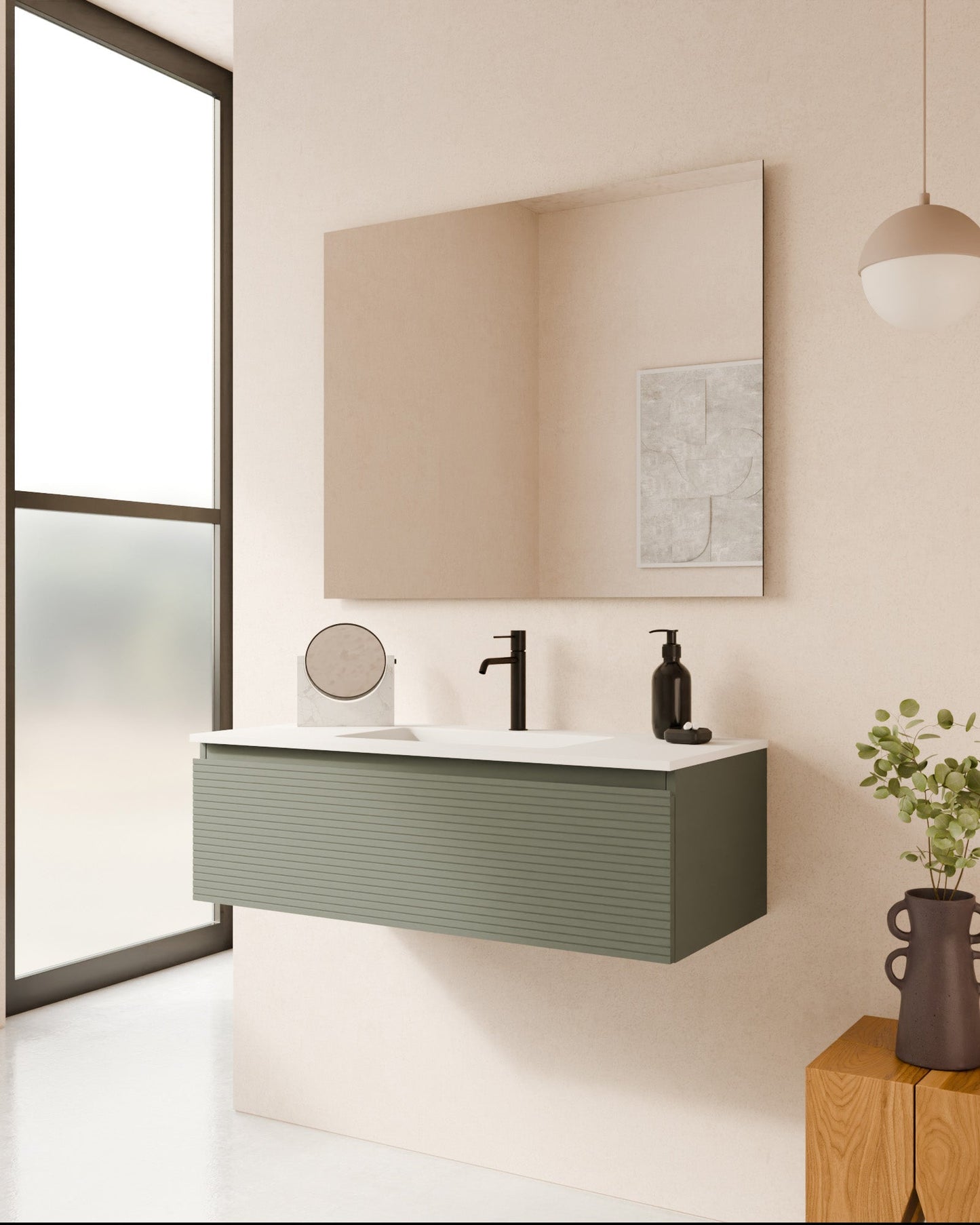 Der Waschbeckenunterschrank zeichnet sich durch seine filigrane horizontale Rillenoptik aus. Der sanfte Rhythmus und die präzisen Linien verleihen jedem Bad optische Ruhe und ein Gefühl der Weitläufigkeit. Die Öffnung erfolgt über einen klassischen Fingerzug an der Oberseite. Der angeschrägte, flache Griff sorgt für eine sanfte, ergonomische Handhabung.