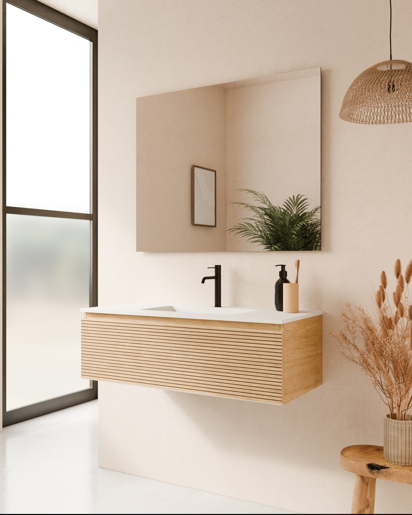 Der Waschbeckenunterschrank zeichnet sich durch seine filigrane horizontale Rillenoptik aus. Der sanfte Rhythmus und die präzisen Linien verleihen jedem Bad optische Ruhe und ein Gefühl der Weitläufigkeit. Die Öffnung erfolgt über einen klassischen Fingerzug an der Oberseite. Der angeschrägte, flache Griff sorgt für eine sanfte, ergonomische Handhabung.