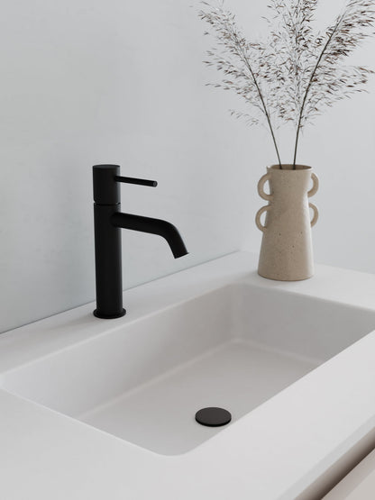 Flacher Waschtisch aus mattweissem Mineralwerkstoff oder Keramik: glatt, wohlgeformt, leicht zu reinigen und langlebig.