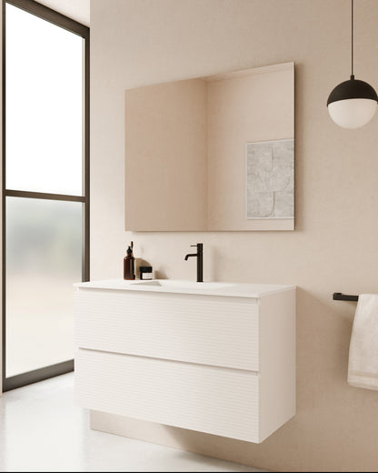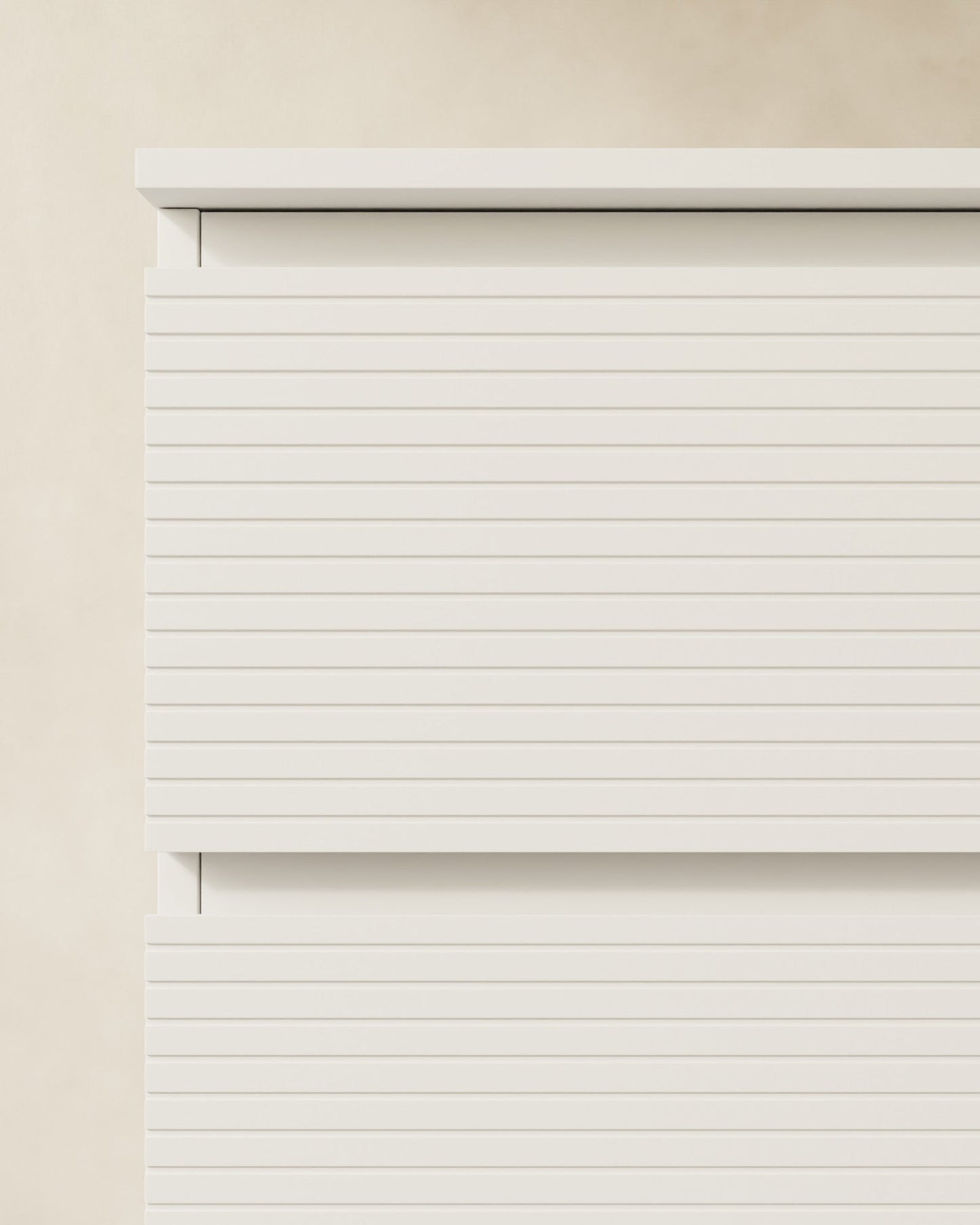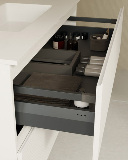 Der Waschbeckenunterschrank zeichnet sich durch seine filigrane horizontale Rillenoptik aus. Der sanfte Rhythmus und die präzisen Linien verleihen jedem Bad optische Ruhe und ein Gefühl der Weitläufigkeit. Die Öffnung erfolgt über einen klassischen Fingerzug an der Oberseite. Der angeschrägte, flache Griff sorgt für eine sanfte, ergonomische Handhabung.