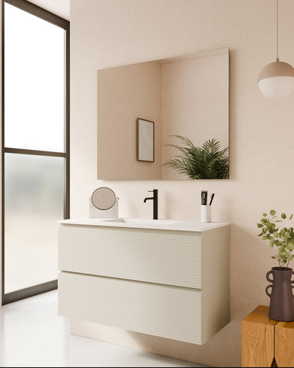 Der Waschbeckenunterschrank zeichnet sich durch seine filigrane horizontale Rillenoptik aus. Der sanfte Rhythmus und die präzisen Linien verleihen jedem Bad optische Ruhe und ein Gefühl der Weitläufigkeit. Die Öffnung erfolgt über einen klassischen Fingerzug an der Oberseite. Der angeschrägte, flache Griff sorgt für eine sanfte, ergonomische Handhabung.