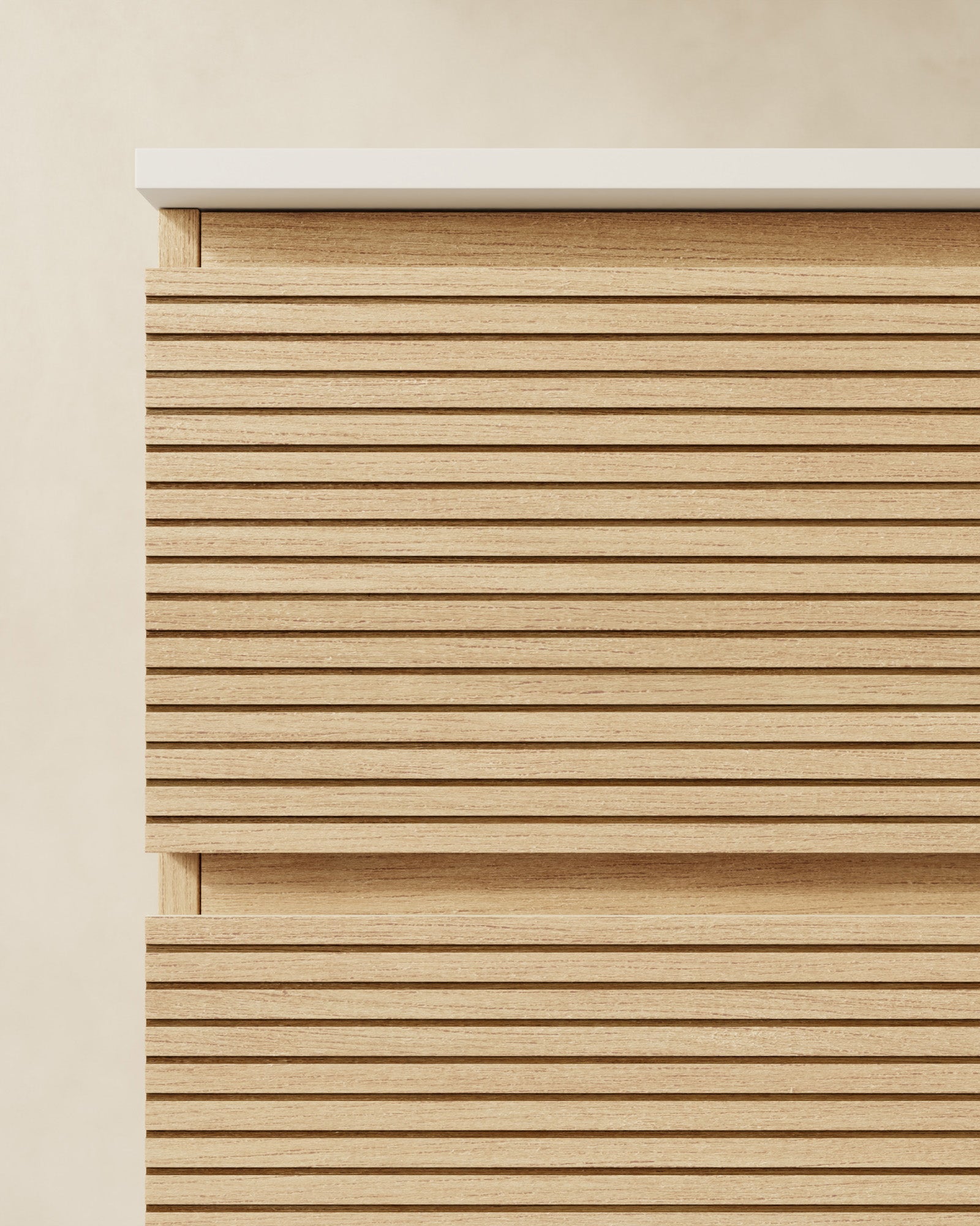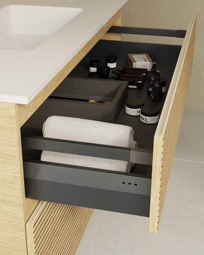 Der Waschbeckenunterschrank zeichnet sich durch seine filigrane horizontale Rillenoptik aus. Der sanfte Rhythmus und die präzisen Linien verleihen jedem Bad optische Ruhe und ein Gefühl der Weitläufigkeit. Die Öffnung erfolgt über einen klassischen Fingerzug an der Oberseite. Der angeschrägte, flache Griff sorgt für eine sanfte, ergonomische Handhabung.