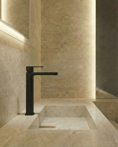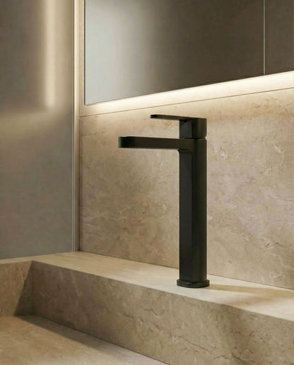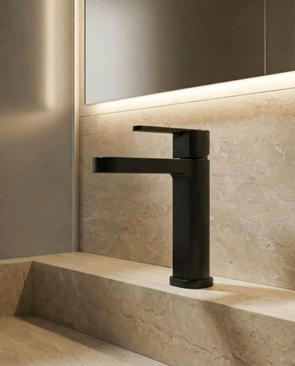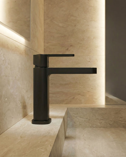 Elvon steht für urbanes Design mit markanter Geometrie. Der kantige Korpus vermittelt Stärke und Präsenz, während der elegante, aerodynamische Auslauf das Gesamtbild ausbalanciert. Perfekt für moderne Bäder, die klare Linien bevorzugen.