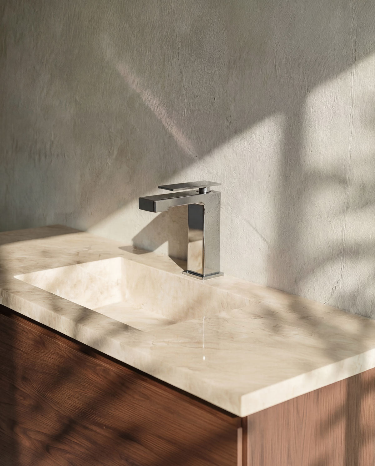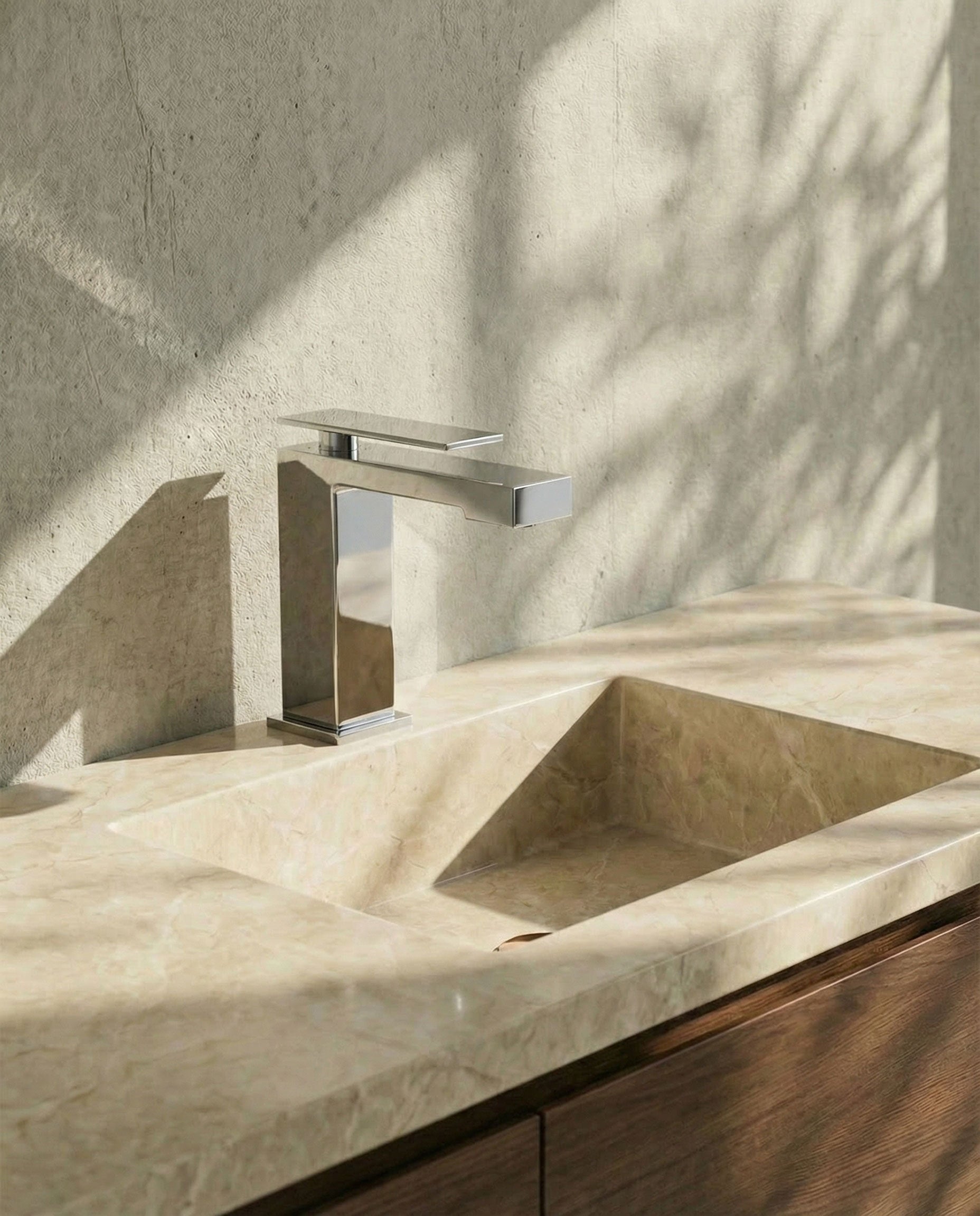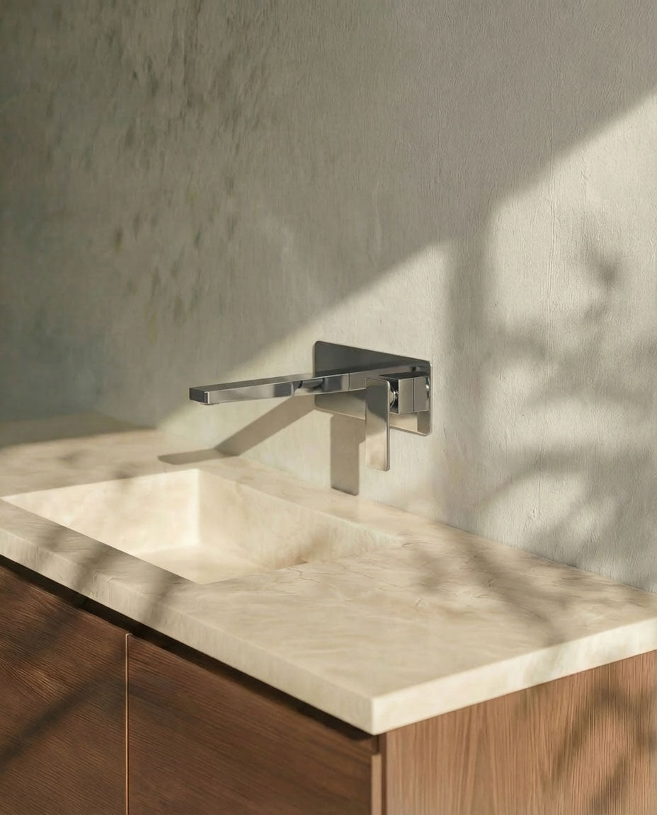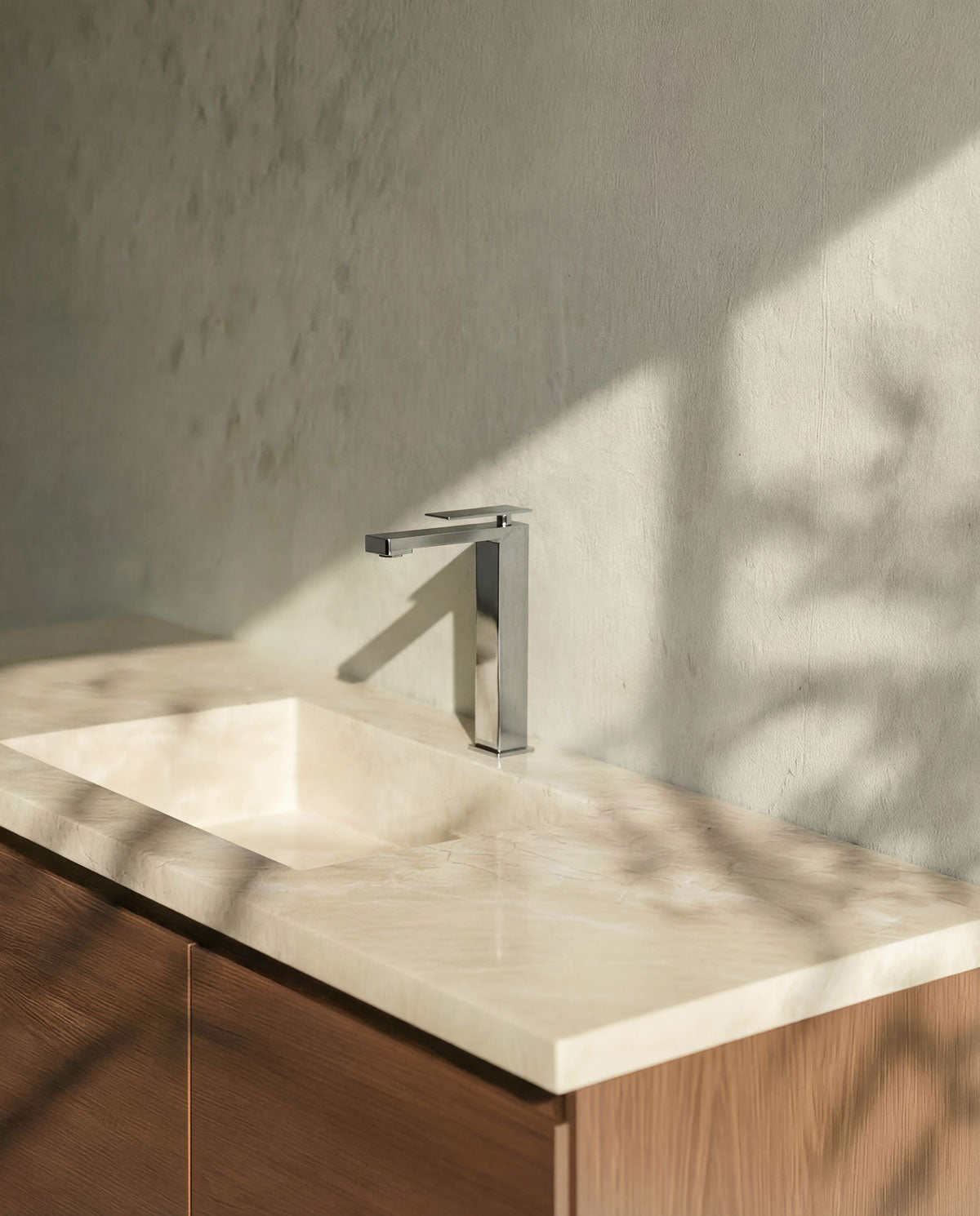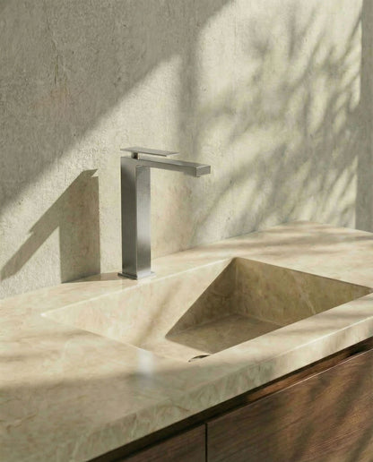 Einhebel-Waschtischarmatur im quadratischen Design mit klaren, markanten Linien. Die feine Bedienung verleiht der Armatur eine avantgardistische Ausstrahlung.