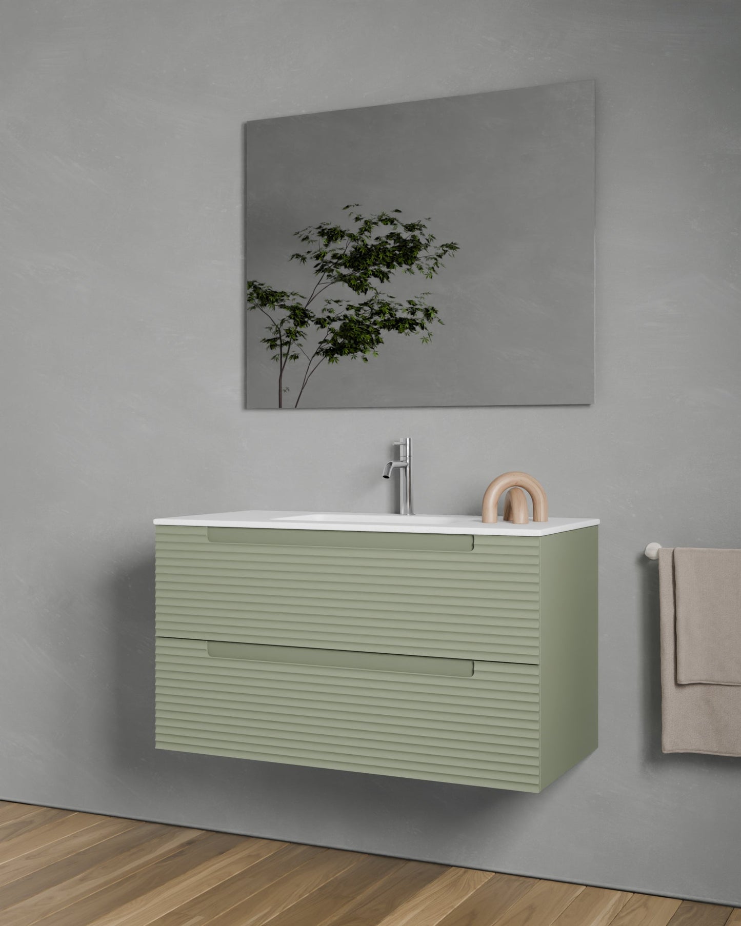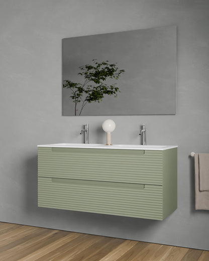 Erhältlich in sechs Ausführungen: Natureiche, Meerblau, Kitami-Grün, Nussbaum, Taupe und Weiß. Vier Breiten: 60, 80, 100 und 120?cm. Zwei Schubladen.