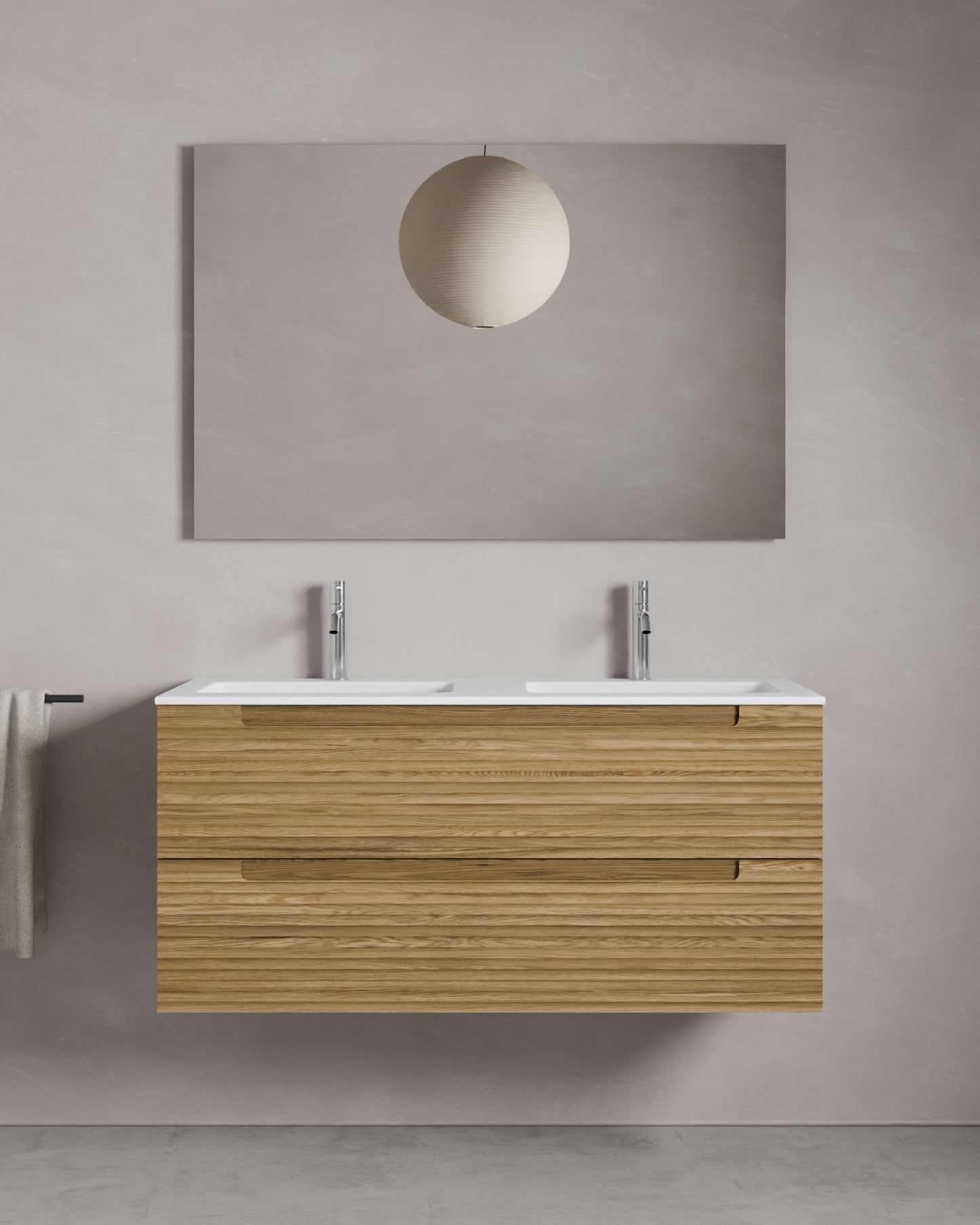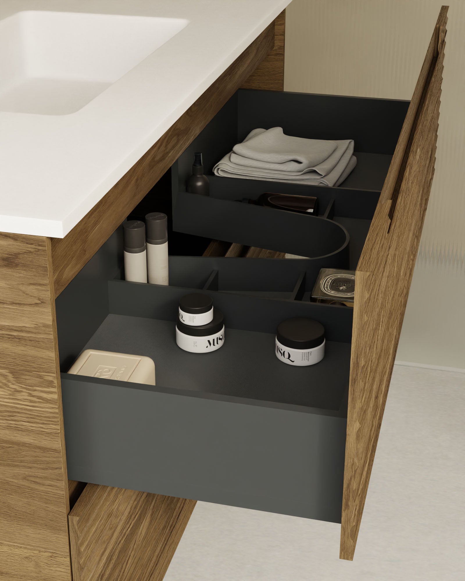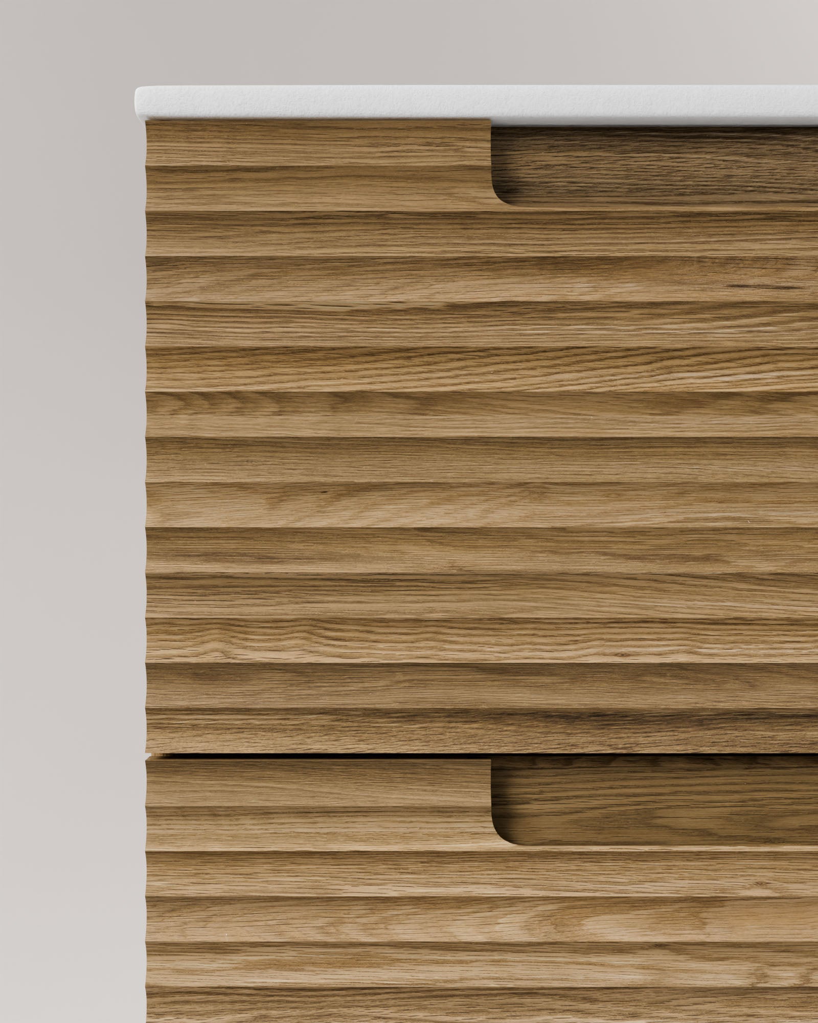 Erhältlich in sechs Ausführungen: Natureiche, Meerblau, Kitami-Grün, Nussbaum, Taupe und Weiß. Vier Breiten: 60, 80, 100 und 120?cm. Zwei Schubladen.