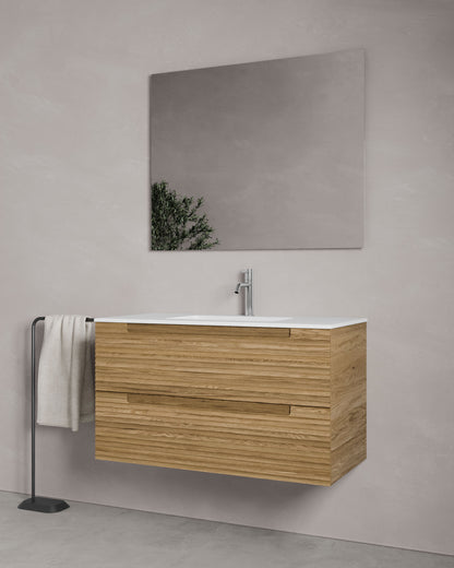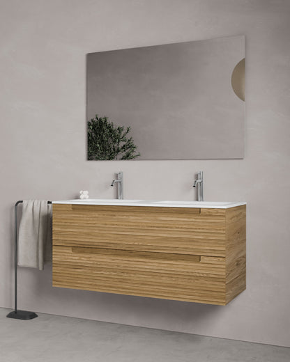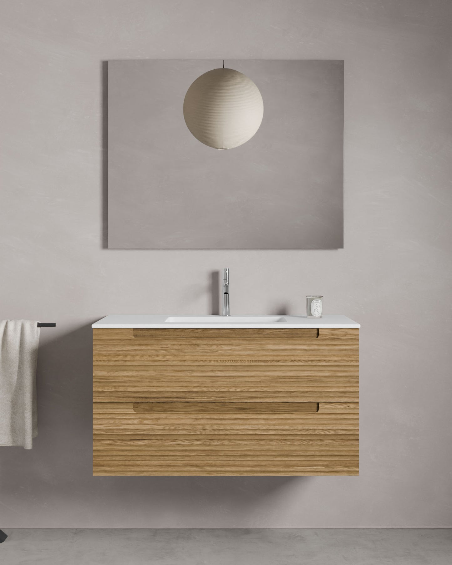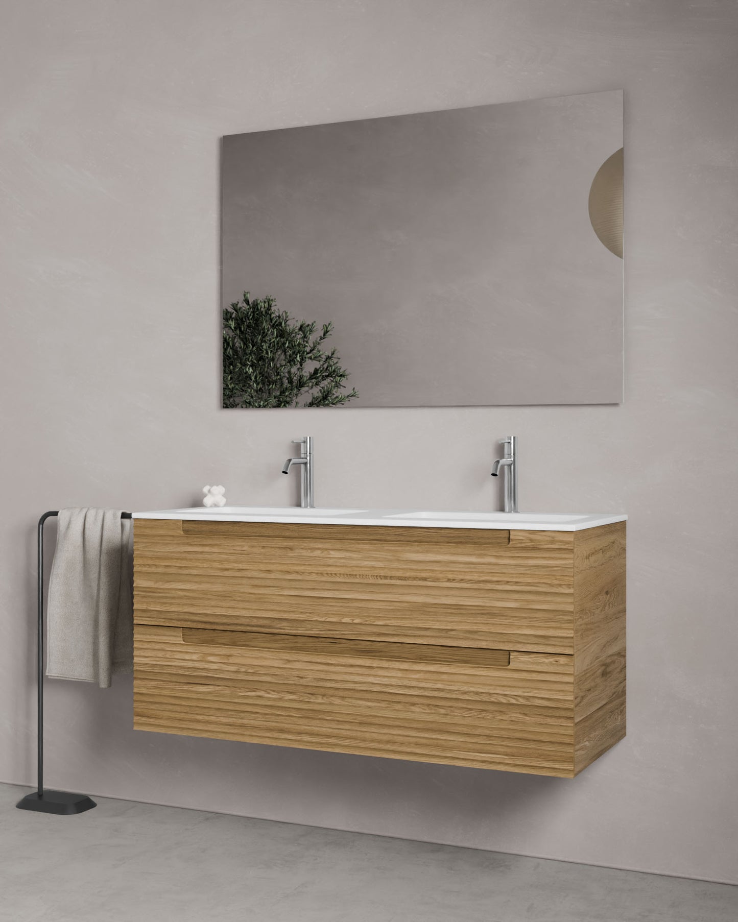 Erhältlich in sechs Ausführungen: Natureiche, Meerblau, Kitami-Grün, Nussbaum, Taupe und Weiß. Vier Breiten: 60, 80, 100 und 120?cm. Zwei Schubladen.