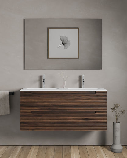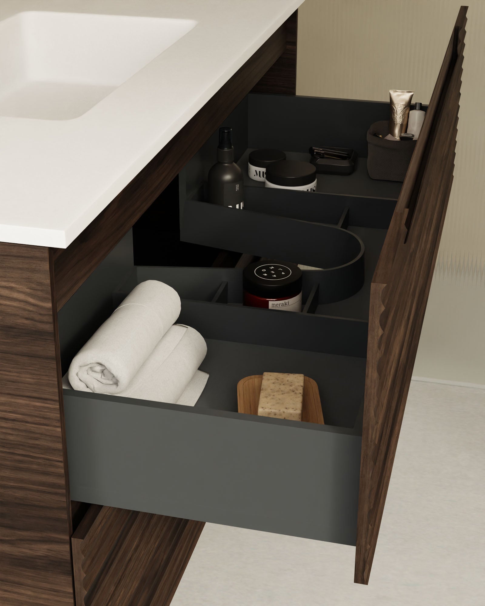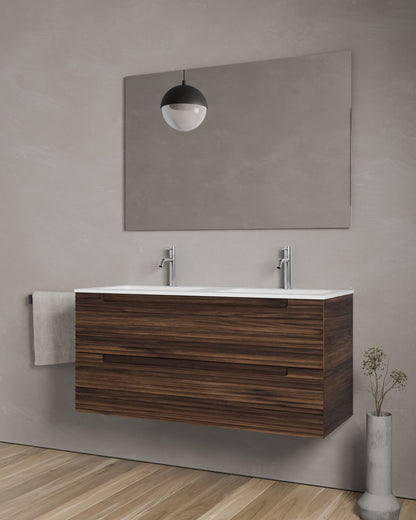 Erhältlich in sechs Ausführungen: Natureiche, Meerblau, Kitami-Grün, Nussbaum, Taupe und Weiß. Vier Breiten: 60, 80, 100 und 120?cm. Zwei Schubladen.