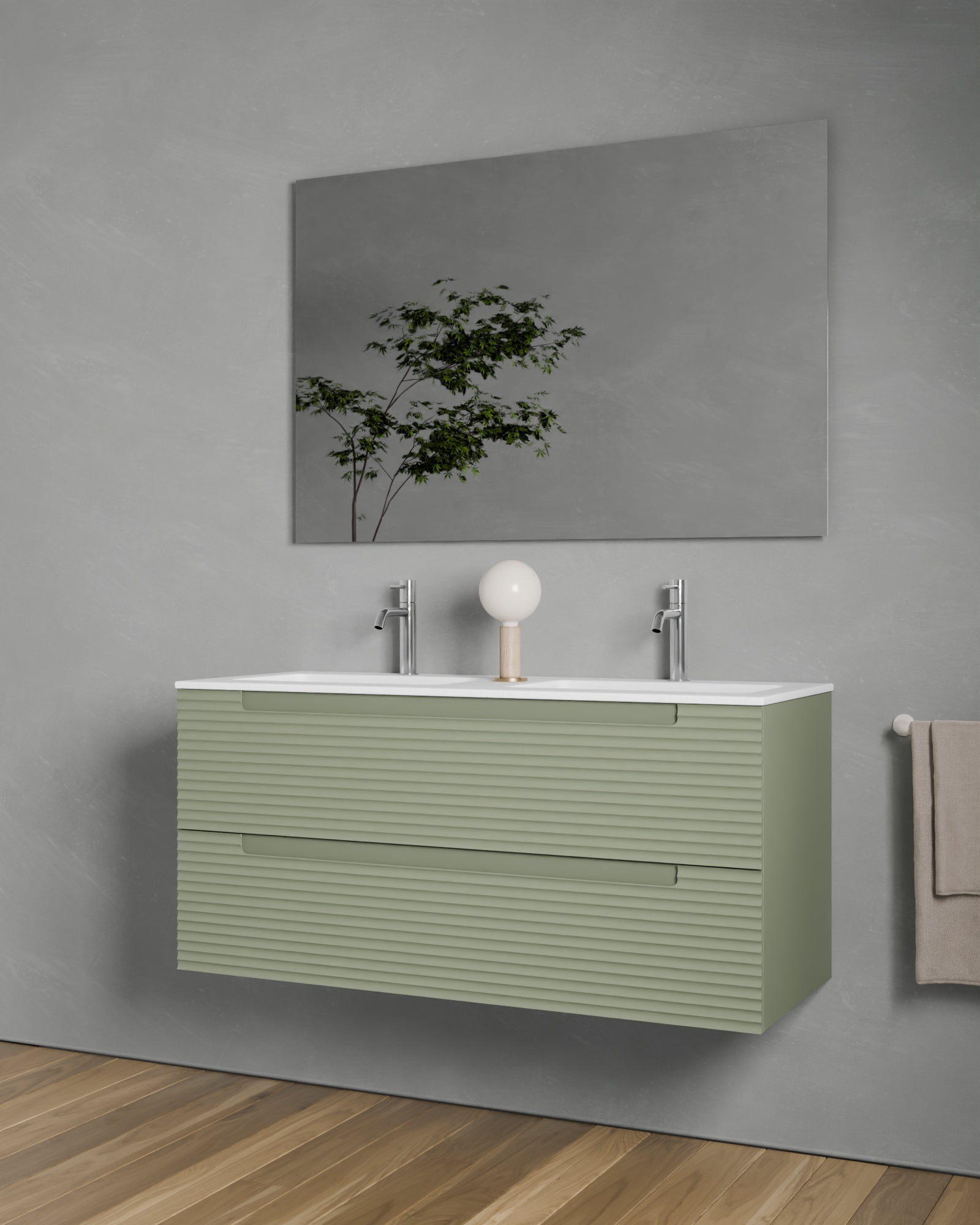 Erhältlich in sechs Ausführungen: Natureiche, Meerblau, Kitami-Grün, Nussbaum, Taupe und Weiß. Vier Breiten: 60, 80, 100 und 120?cm. Zwei Schubladen.