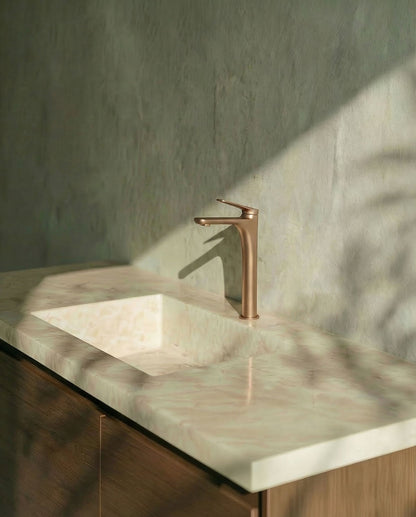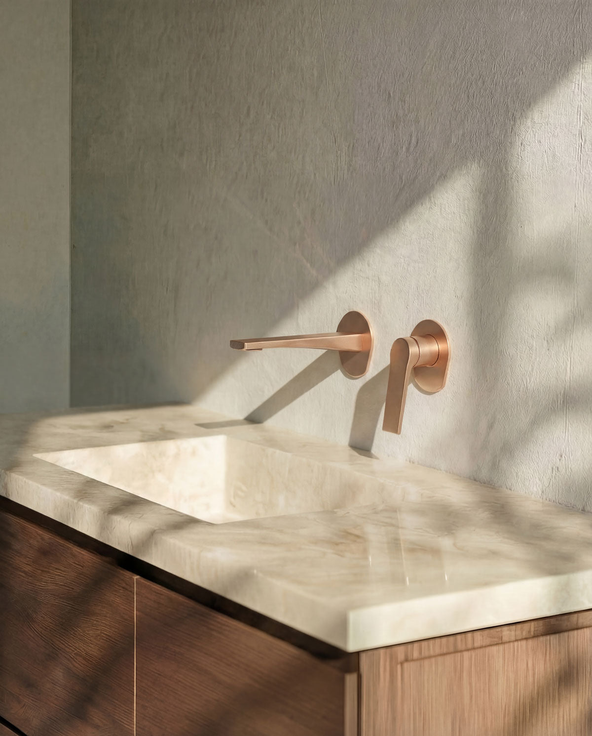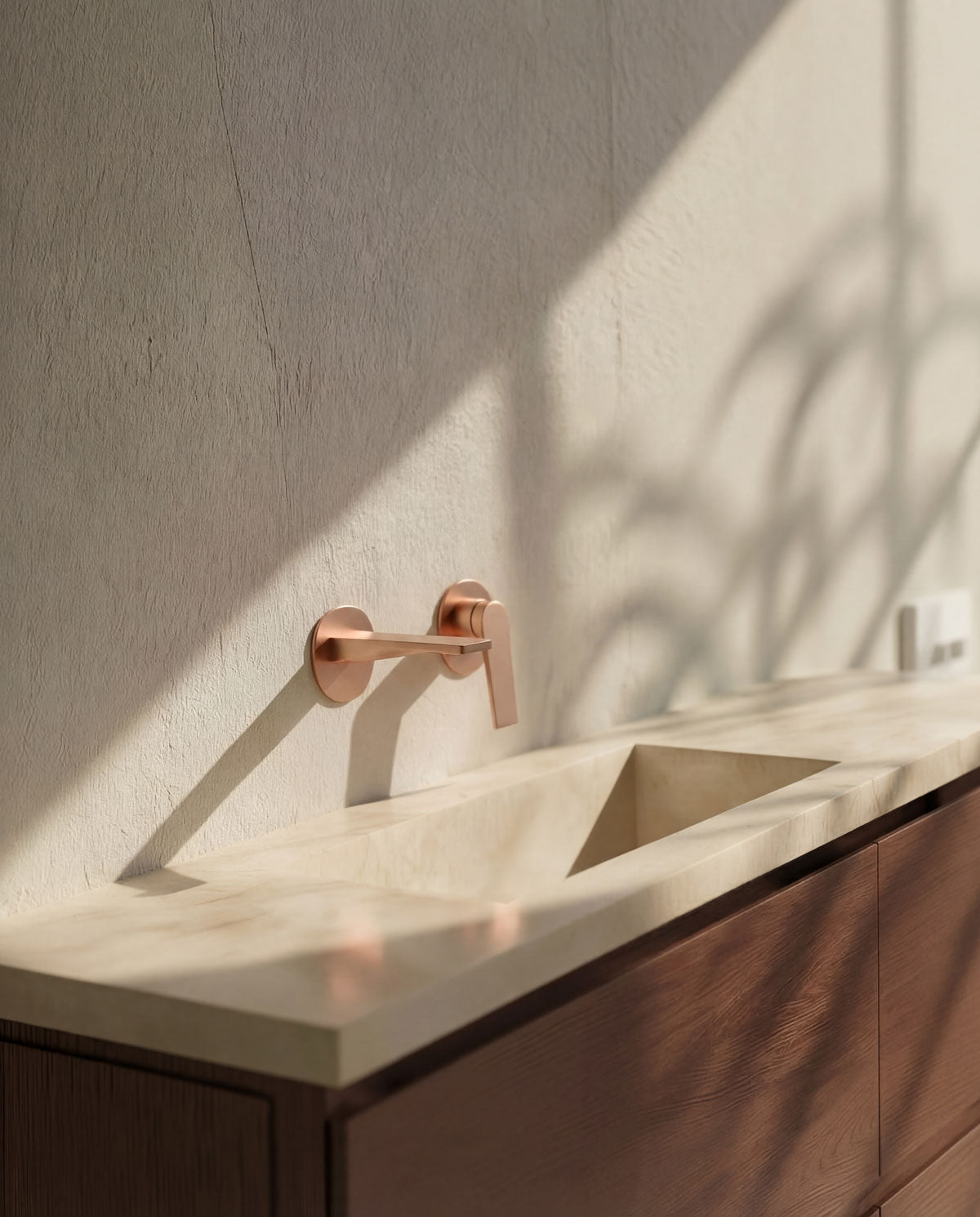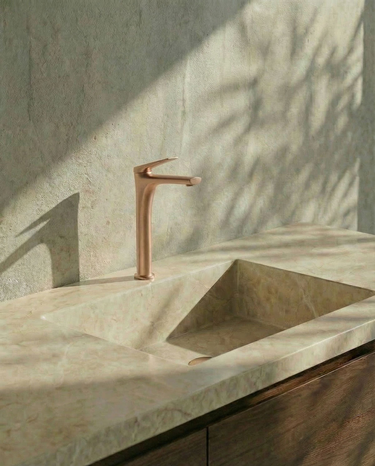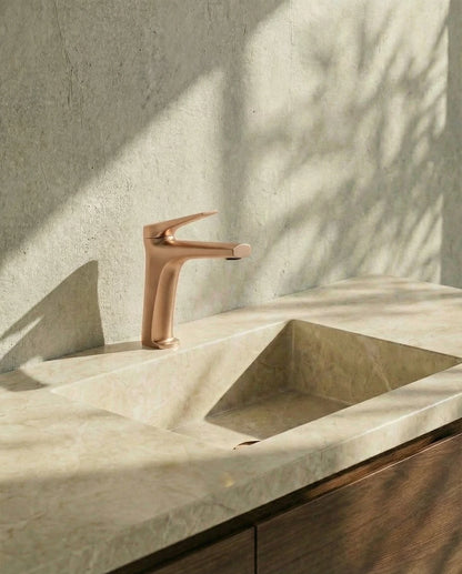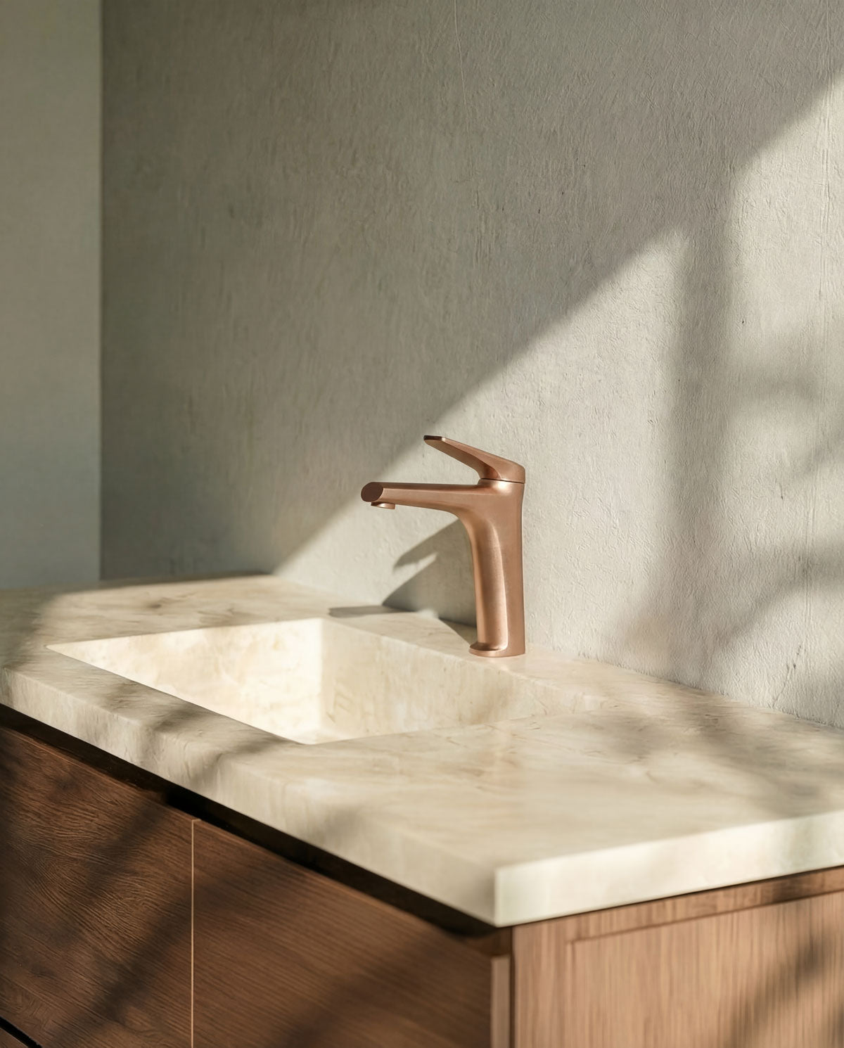 Einhebel-Waschtischarmatur mit leicht nach vorne geneigter Linie – aerodynamisch und kompakt, zugleich elegant.