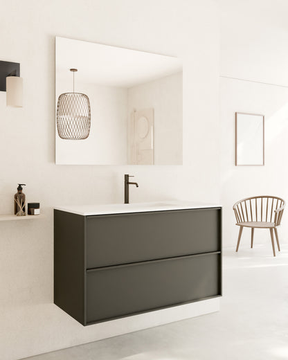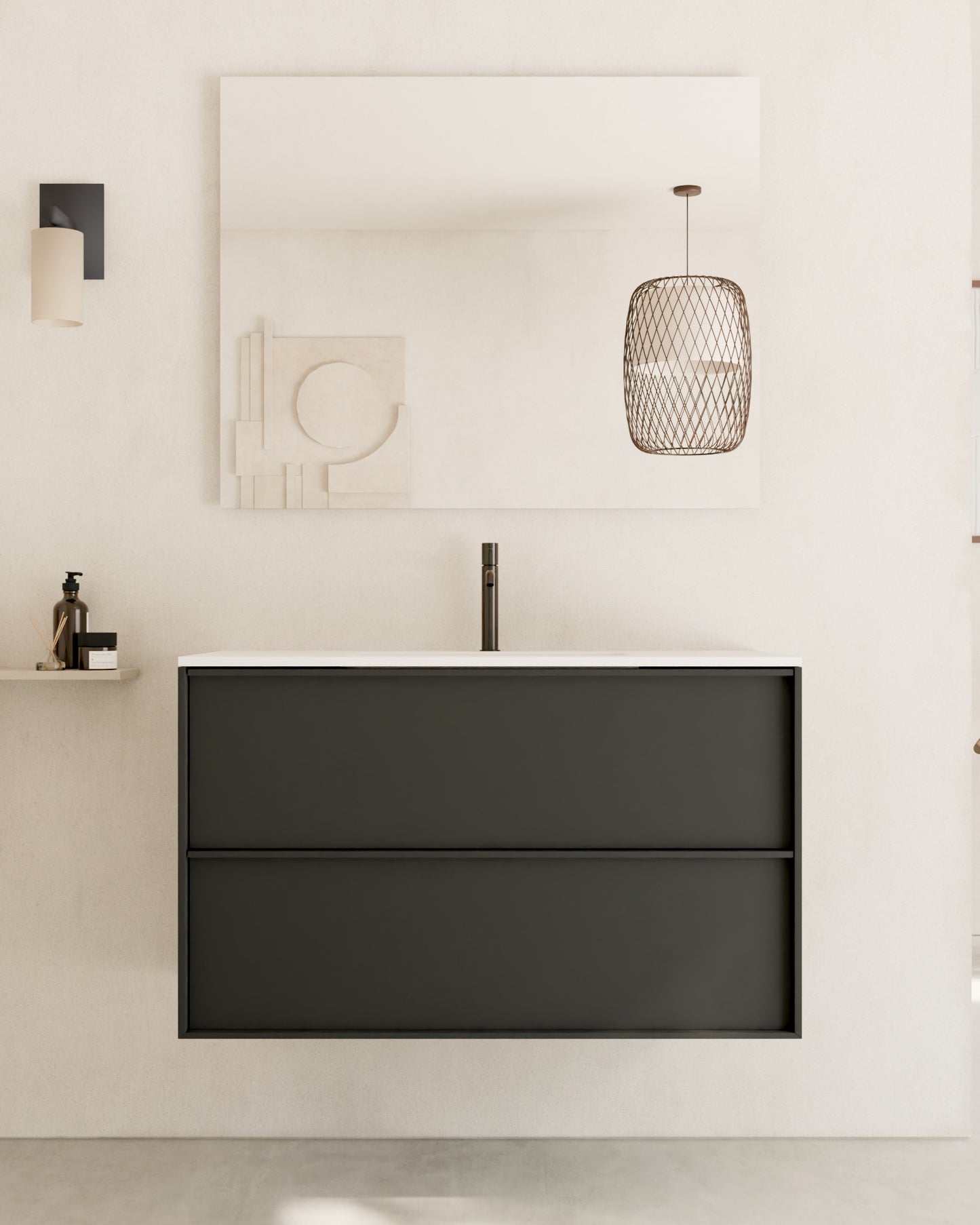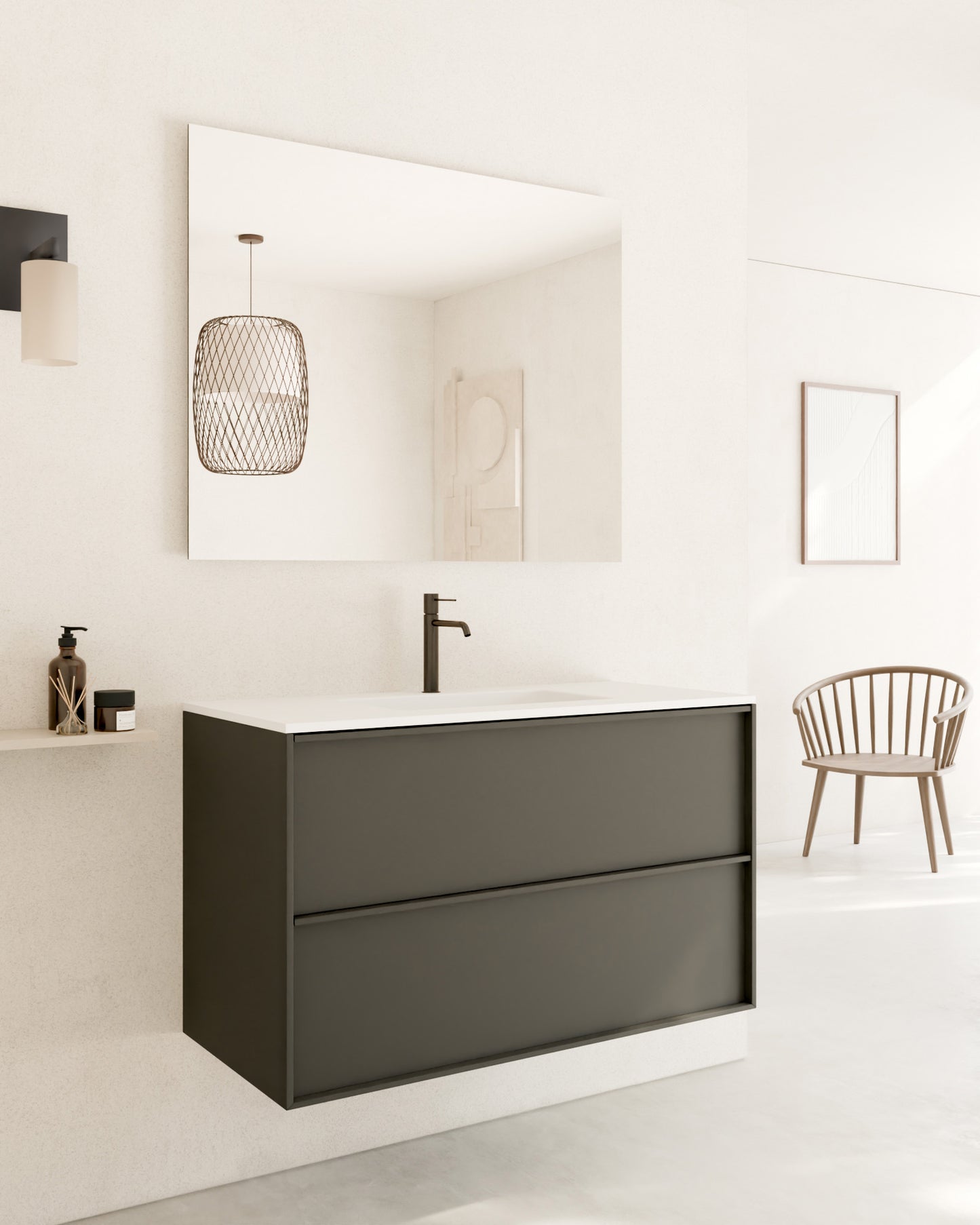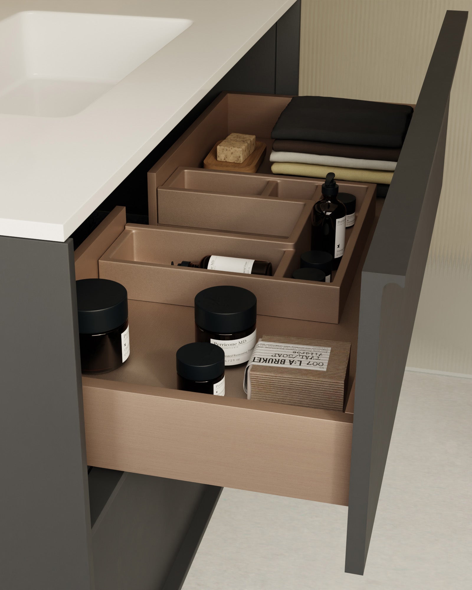 Erhältlich in vier Ausführungen: Eiche Natur, Weiß matt, Anthrazit und Dunkelgrau, Mokka, Nussbaum und Kitami-Grün. Zwei Breiten: 60, 70, 80 und 100 cm. Zwei Schubladen.