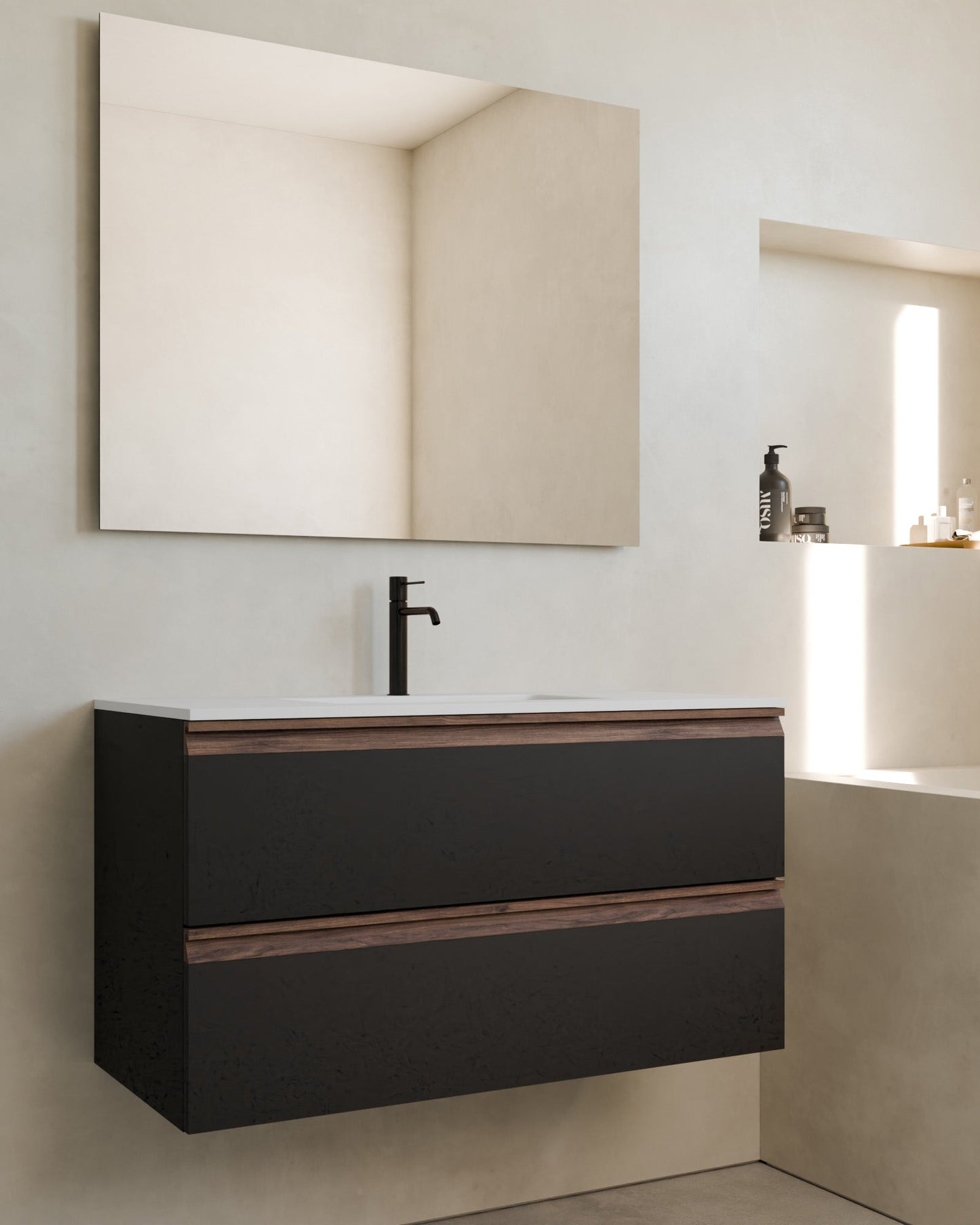 Waschbeckenunterschrank mit glatter Front und integriertem Nussbaumgriff. Der Kontrast zwischen dem minimalistischen Korpus und dem warmen Holz des Griffs verleihen dem Modell eine moderne und raffinierte Note. Der sichtbare Griff ermöglicht ein leichtes Öffnen und setzt zugleich einen optischen Akzent.