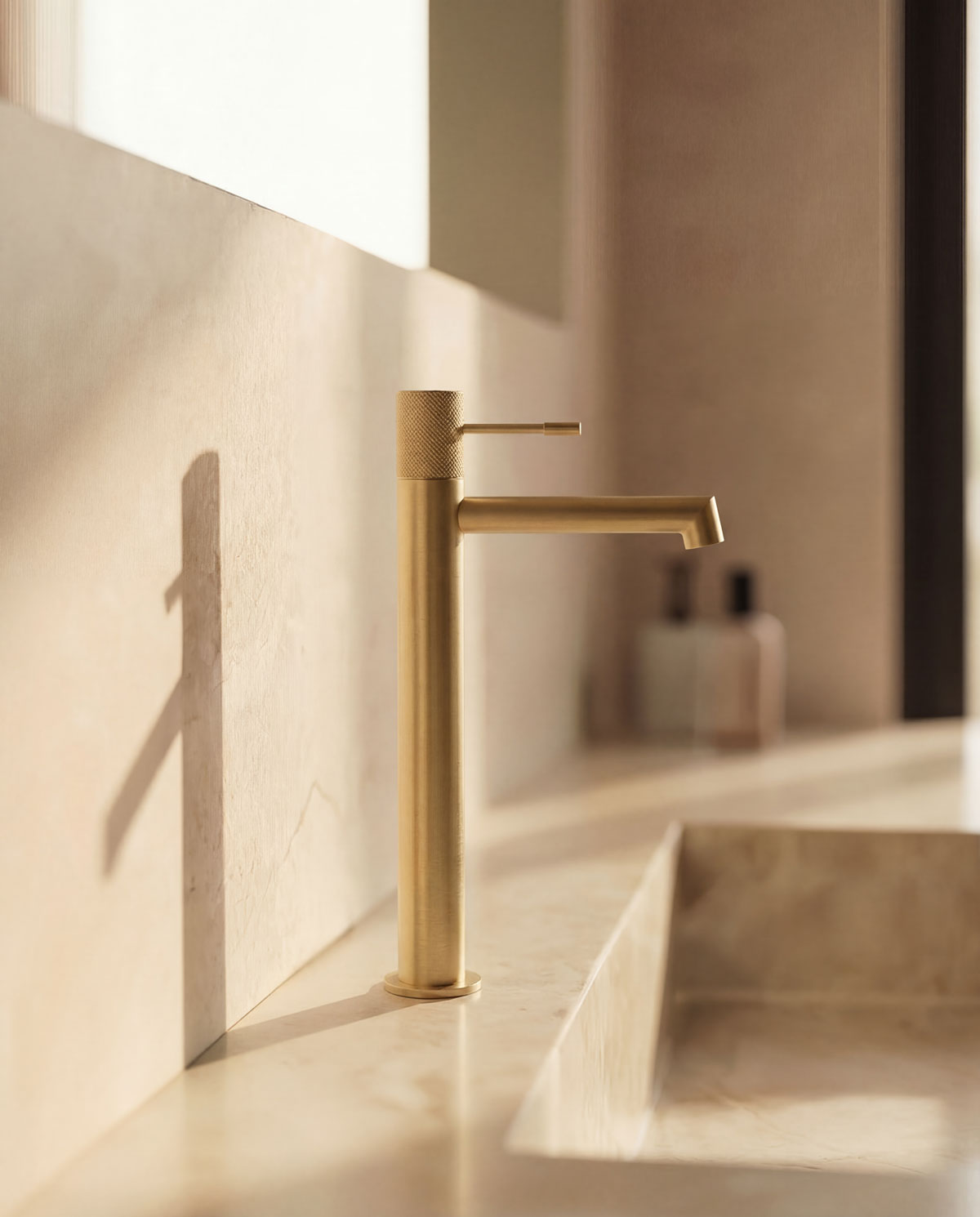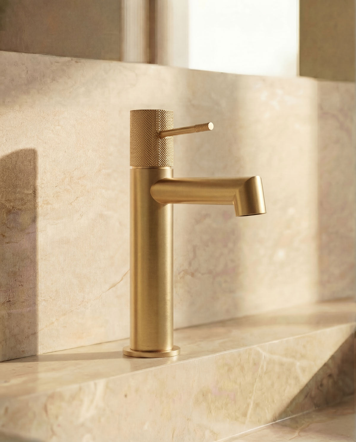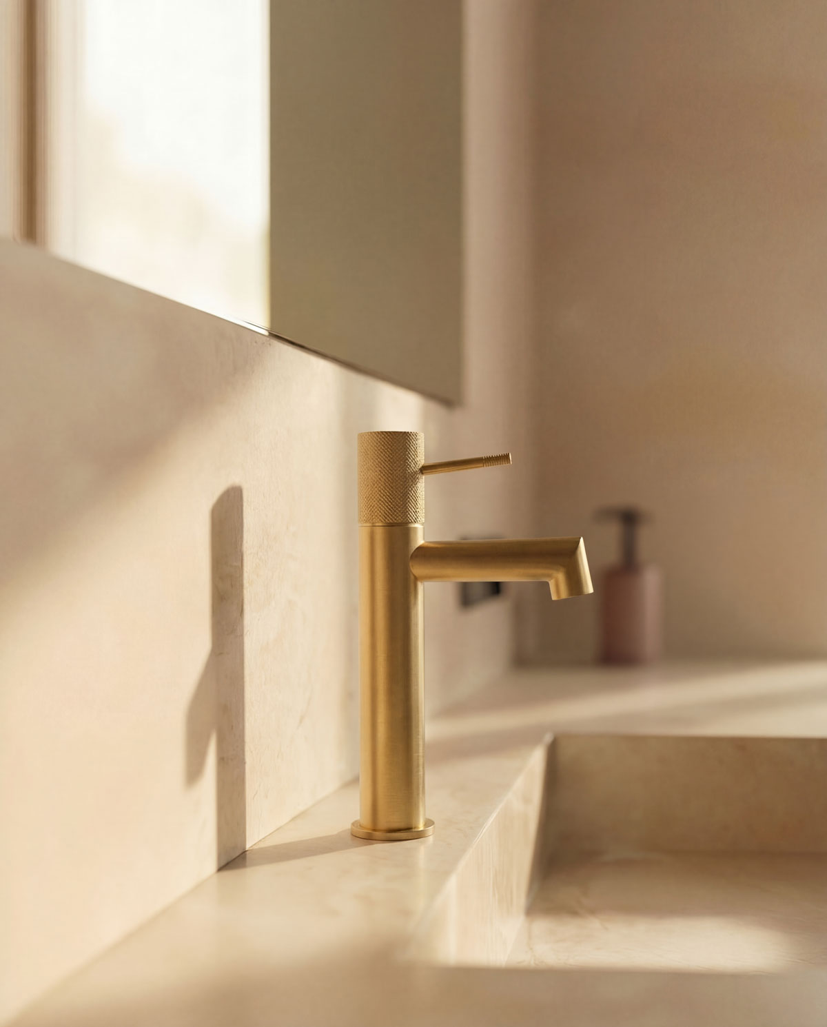 Einhebel-Waschtischarmatur im italienischen Stil mit feinem Bedienhebel und gerilltem Auslaufkopf. Elegant und vielseitig.