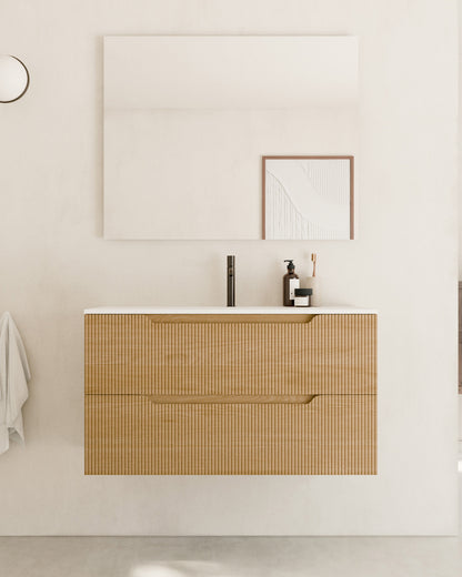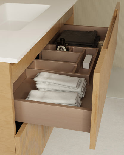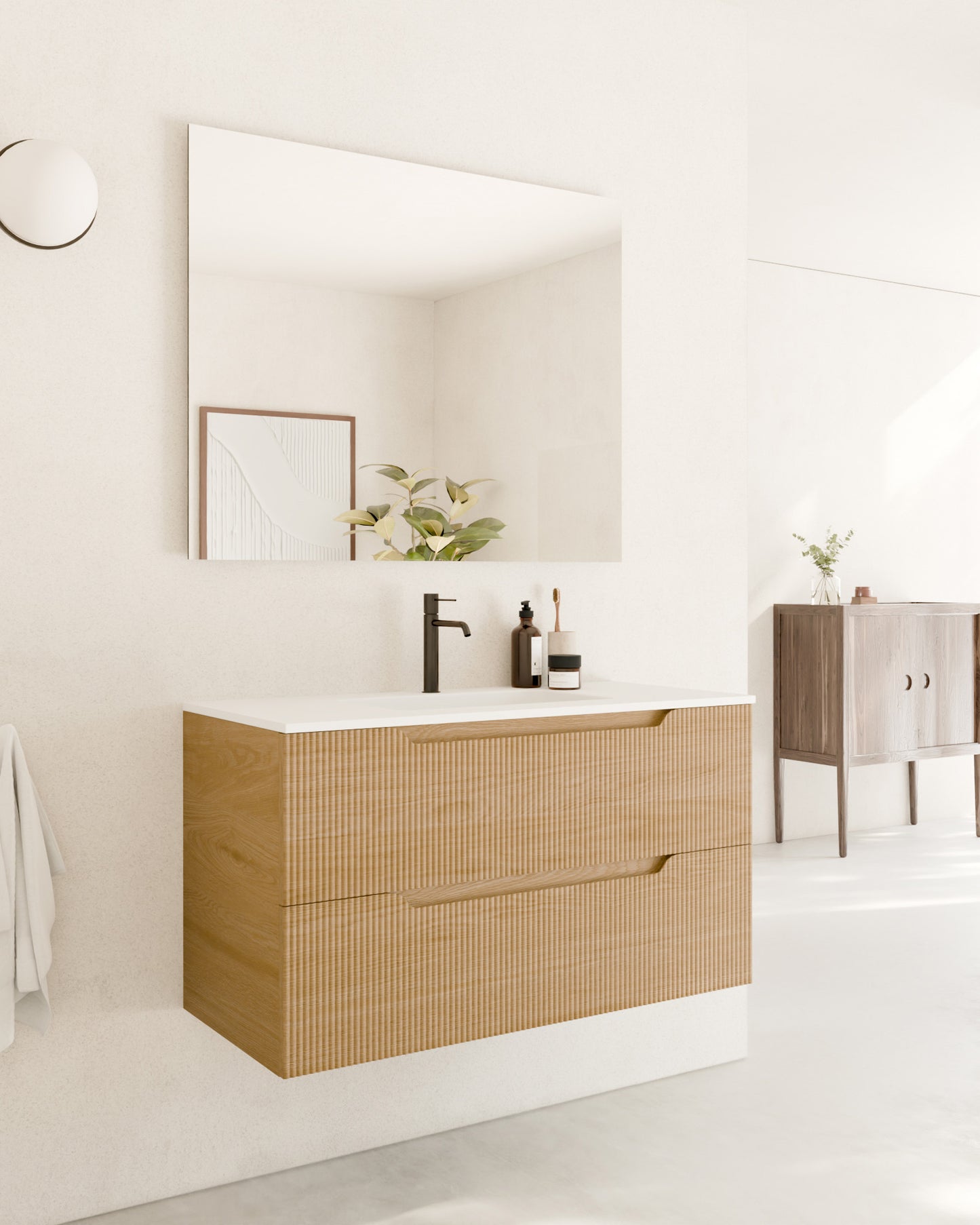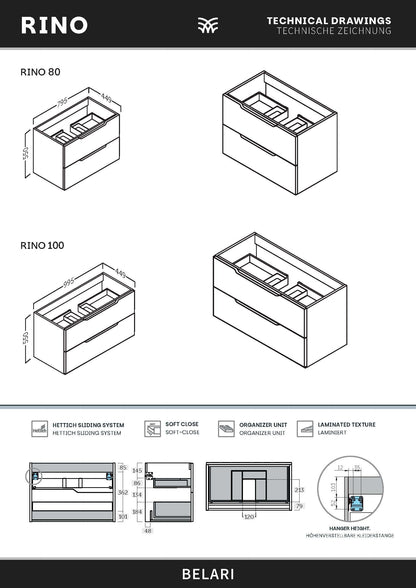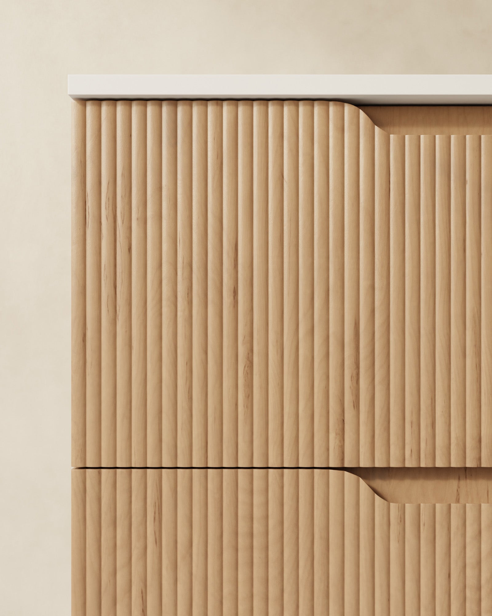 Erhältlich in sechs Ausführungen: Eiche Natur, Weiß matt, Anthrazit, Dunkelgrau, Mokka und Kitami-Grün. Vier Breiten: 60, 70, 80 und 100 cm. Zwei Schubladen.