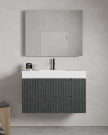 • Mattweißer Waschtisch aus Mineralwerkstoff, wahlweise mit zentriertem Ablauf oder minimalistischem, verdecktem Ablauf, sowie optional mit Waschtischplatte mit umlaufender Blende für ein elegantes Finish.