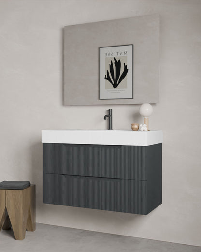 Rino vereint Design und Funktion mit Charakter. Die vertikalen Linien sorgen für Leichtigkeit und Bewegung, während das anthrazitfarbene Interieur den eleganten Look unterstreicht. Die obere Schublade mit Kupfer-Finish verfügt über ein integriertes Ordnungssystem, Soft-Close-Führungen von Hettich und flexibel verstellbare Fächer für den Alltag.
