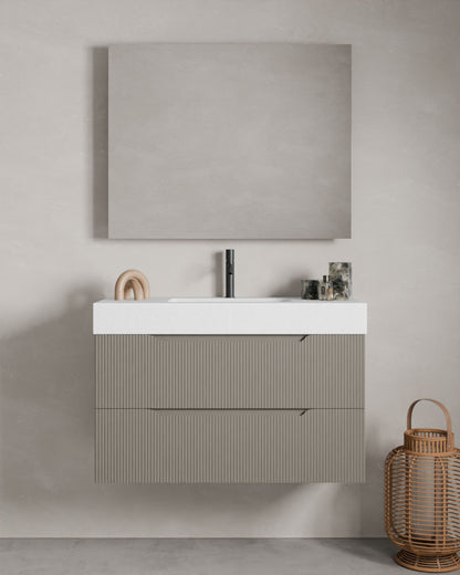 Waschtisch aus mattweißem Mineralwerkstoff oder Keramik.