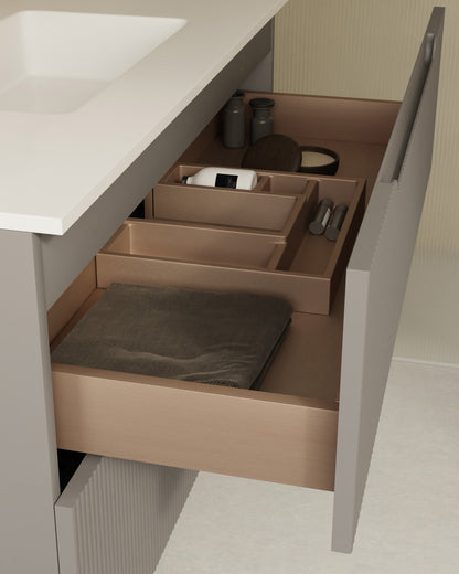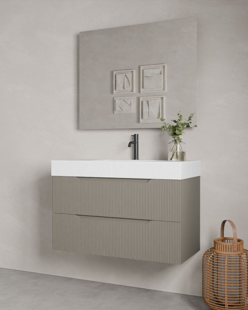 Erhältlich in sechs Ausführungen: Eiche Natur, Weiß matt, Anthrazit, Dunkelgrau, Mokka und Kitami-Grün. Vier Breiten: 60, 70, 80 und 100 cm. Zwei Schubladen.