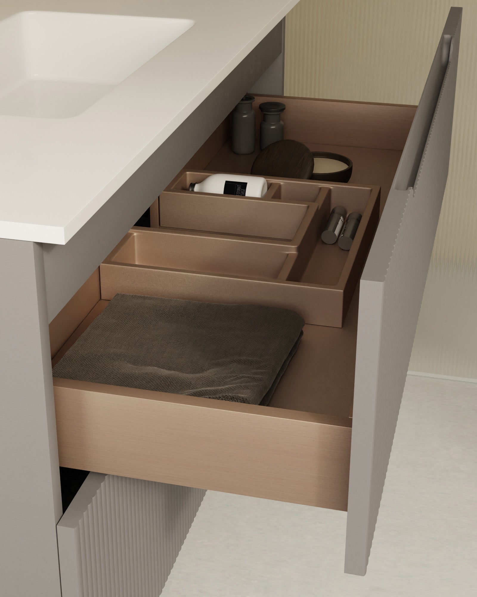 Rino setzt durch sein markantes Design mit vertikalen, abgerundeten Rillen rhythmische Akzente, ohne den modernen Charakter zu verlieren. Die mittlere Griffleiste fügt sich harmonisch in das Design ein und garantiert einen bequemen Zugriff im urbanen Look.