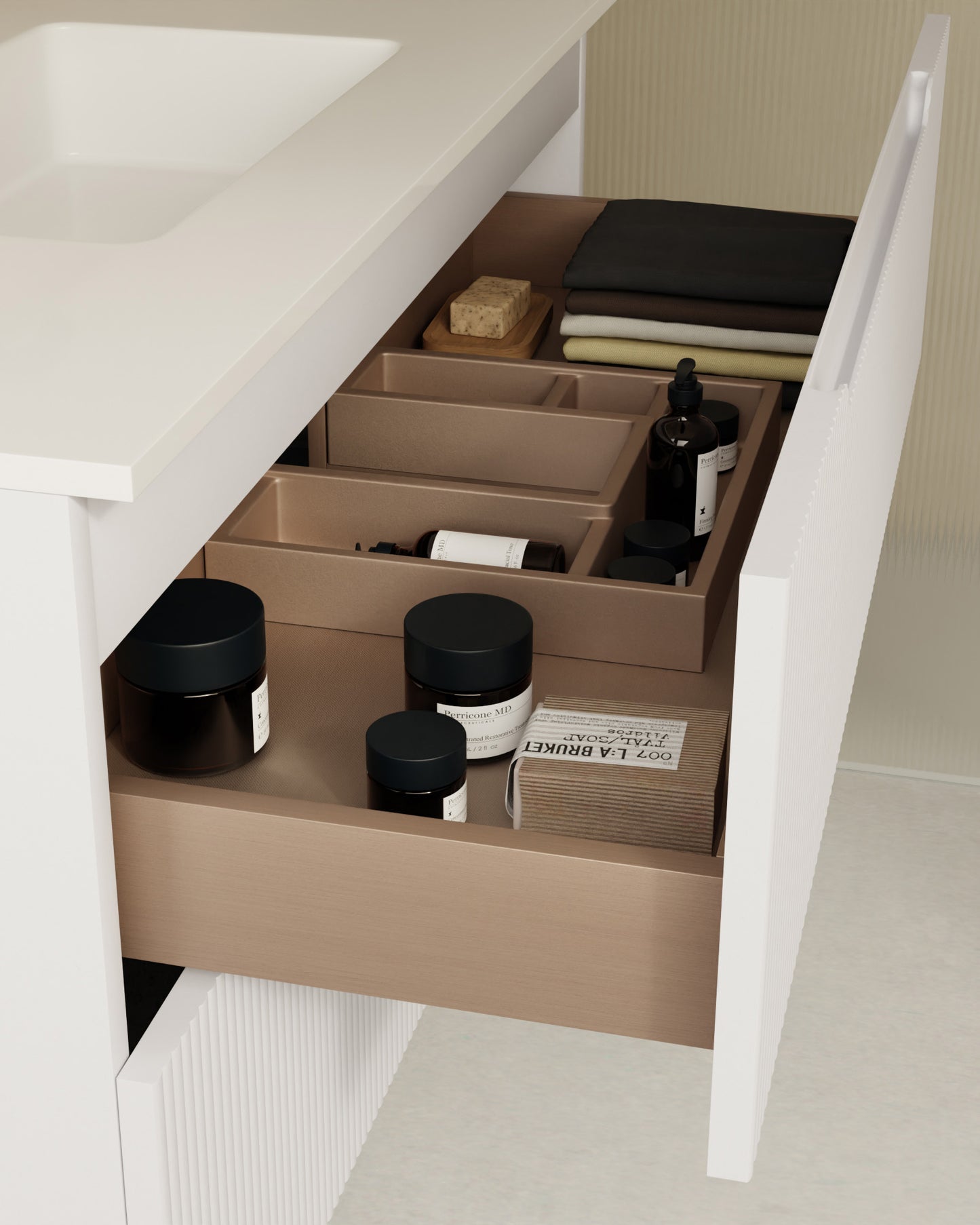 Rino vereint Design und Funktion mit Charakter. Die vertikalen Linien sorgen für Leichtigkeit und Bewegung, während das anthrazitfarbene Interieur den eleganten Look unterstreicht. Die obere Schublade mit Kupfer-Finish verfügt über ein integriertes Ordnungssystem, Soft-Close-Führungen von Hettich und flexibel verstellbare Fächer für den Alltag.