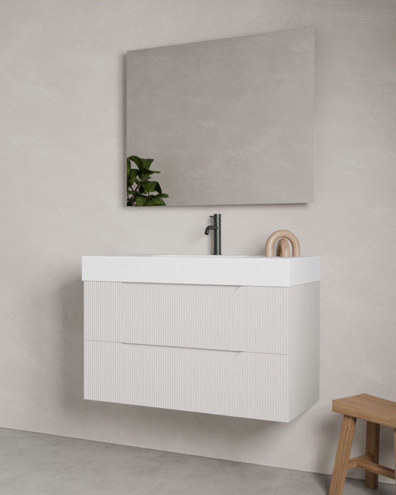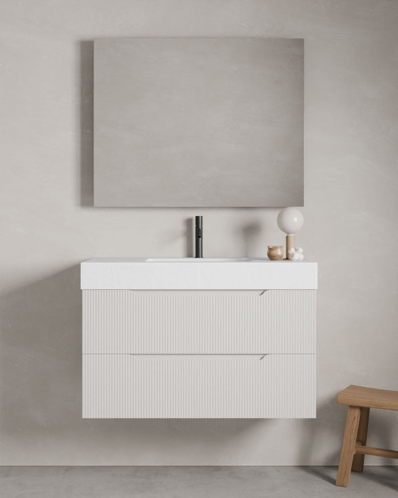 • Mattweißer Waschtisch aus Mineralwerkstoff, wahlweise mit zentriertem Ablauf oder minimalistischem, verdecktem Ablauf, sowie optional mit Waschtischplatte mit umlaufender Blende für ein elegantes Finish.