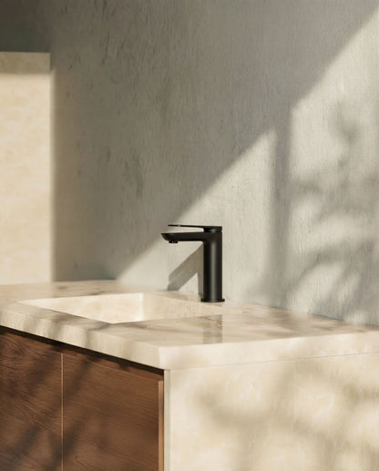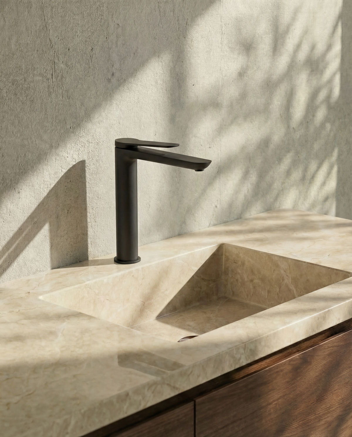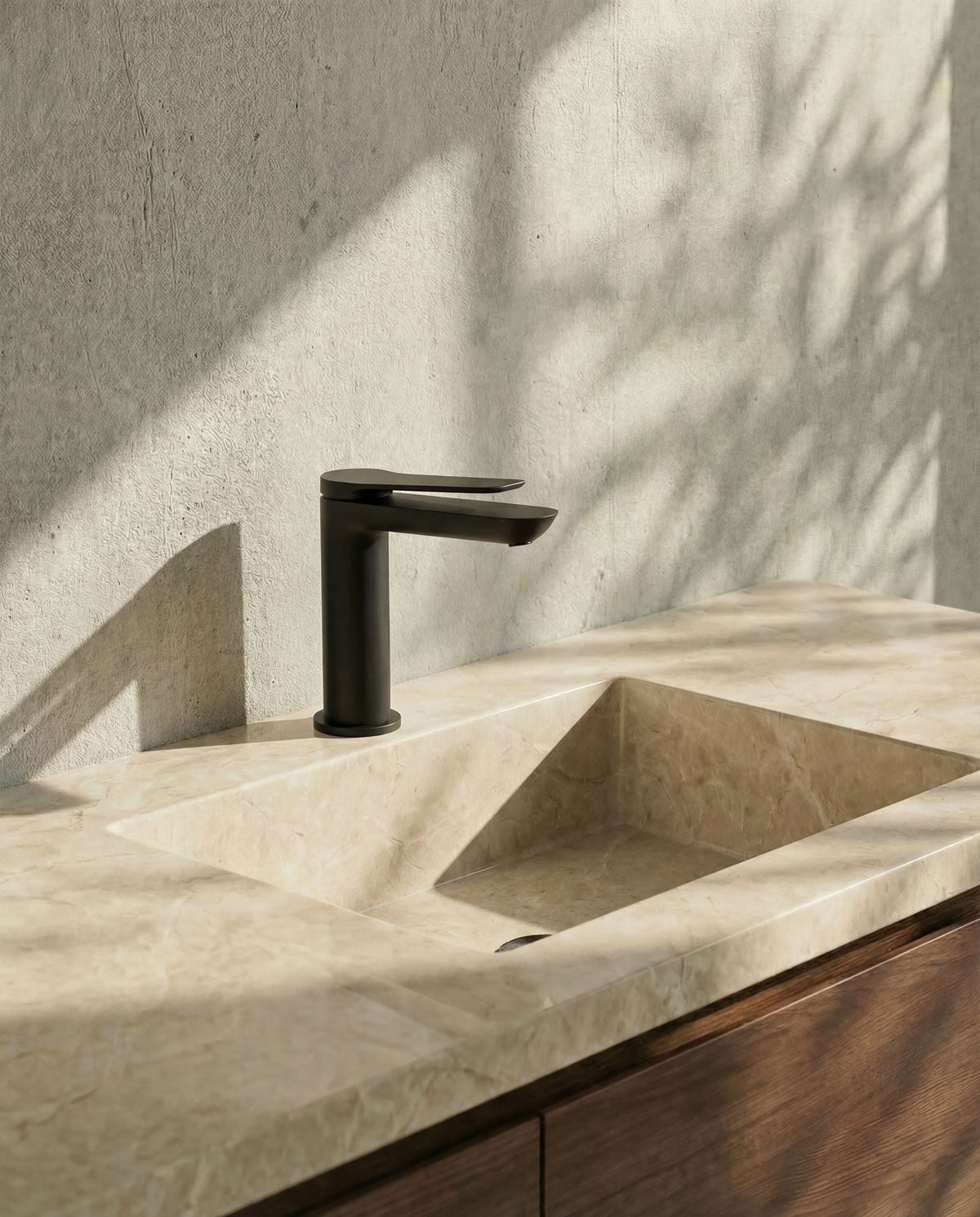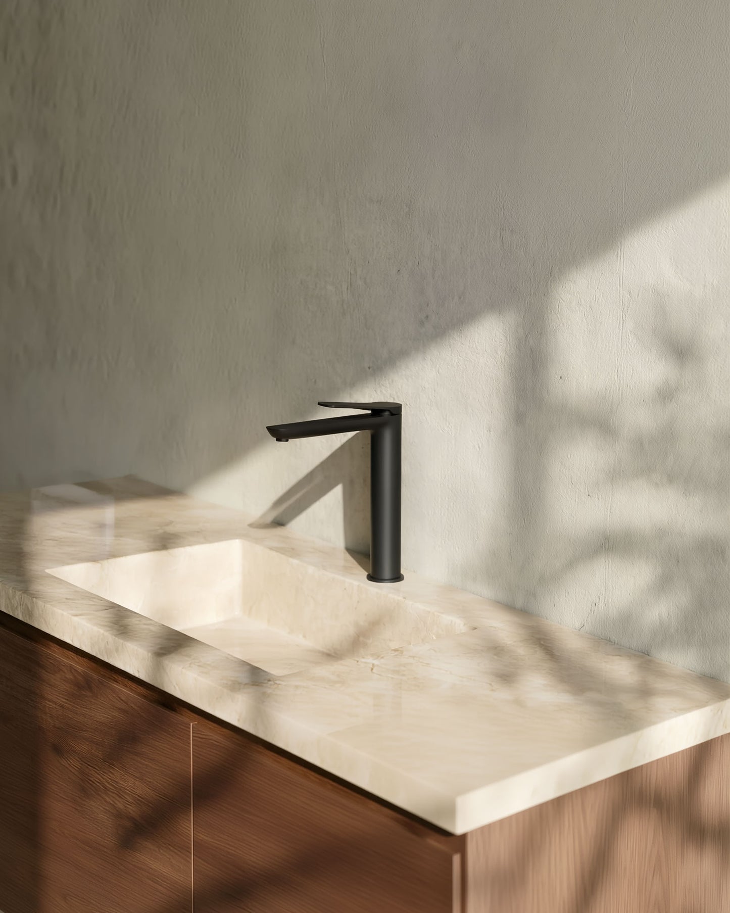 Einhebel-Waschtischarmatur mit massivem Korpus und robustem Fuß. Schlicht, stabil und markant.