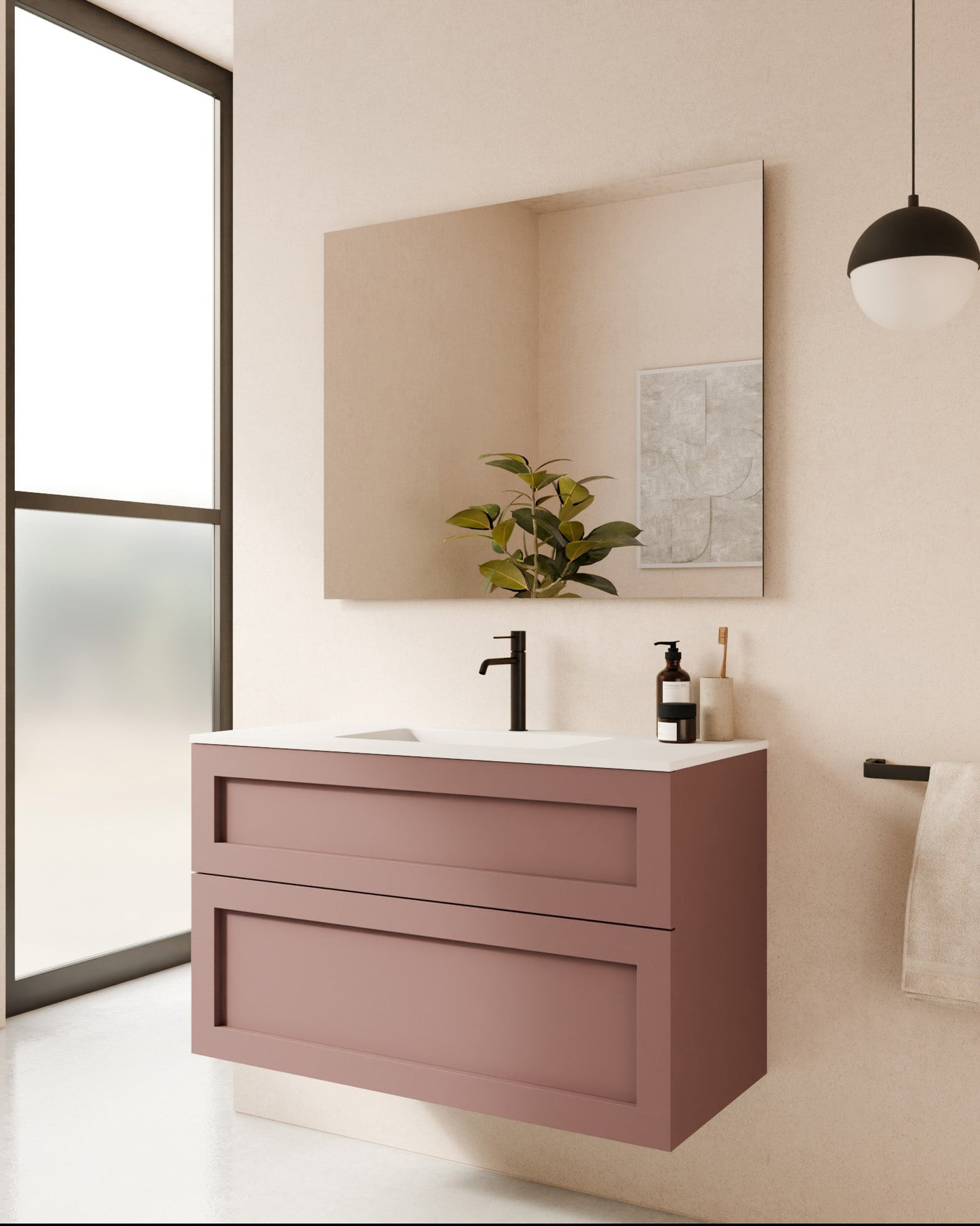 Waschbeckenunterschrank mit Rahmenfront. Tera wirkt kraftvoll und zugleich raffiniert, mit einer starken Präsenz und perfekten Proportionen. Der Öffnungsmechanismus verbirgt sich dezent auf der Innenseite des oberen Rahmens. So entsteht ein formschöner Griff, der die geometrische Silhouette des Objekts bewahrt.