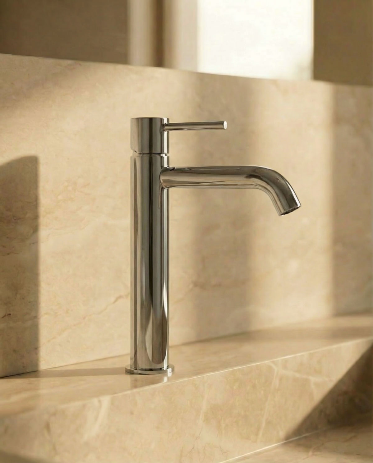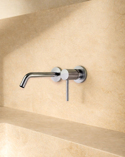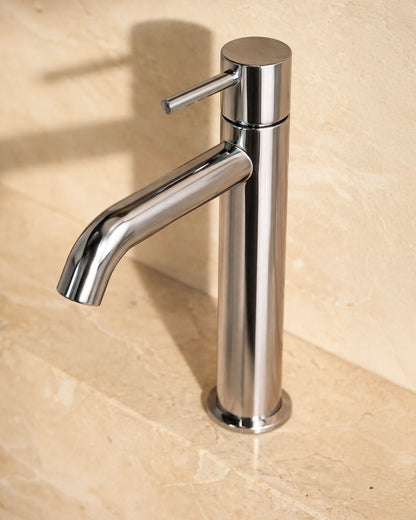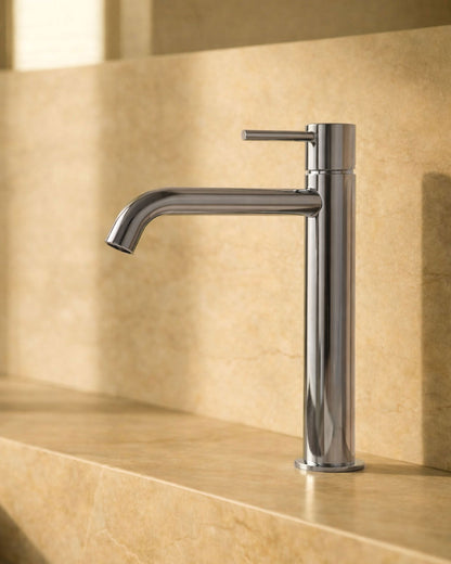 Einhebel-Waschtischarmatur mit weichen, abgerundeten Linien. Der zylindrische Korpus und der abwärts geneigte Auslauf sorgen für eine fließende, naturnahe Ästhetik, während der schlanke Hebel für optische Leichtigkeit sorgt. Die klare, italienisch anmutende Silhouette ist perfekt proportioniert – kein Wunder, dass sie so weit verbreitet ist.