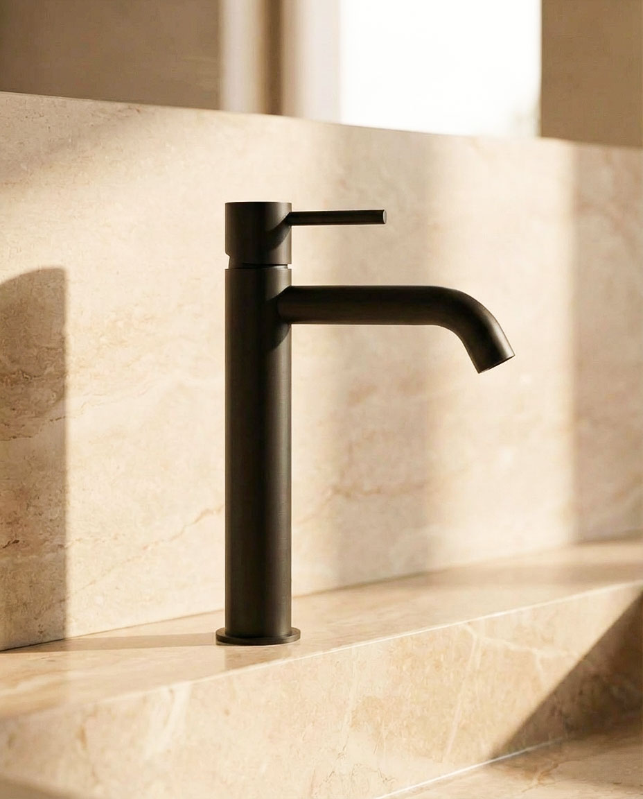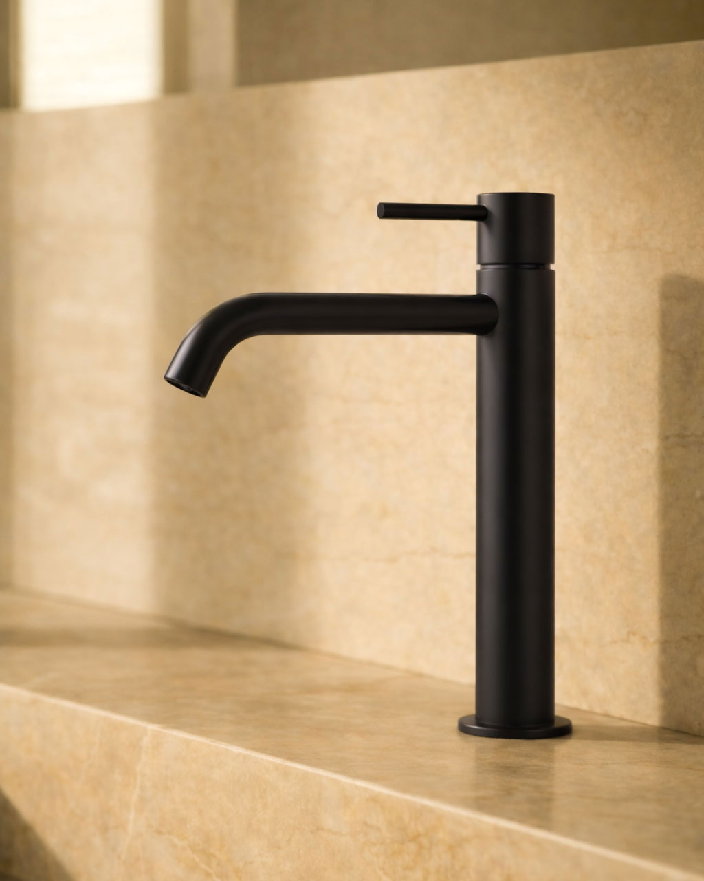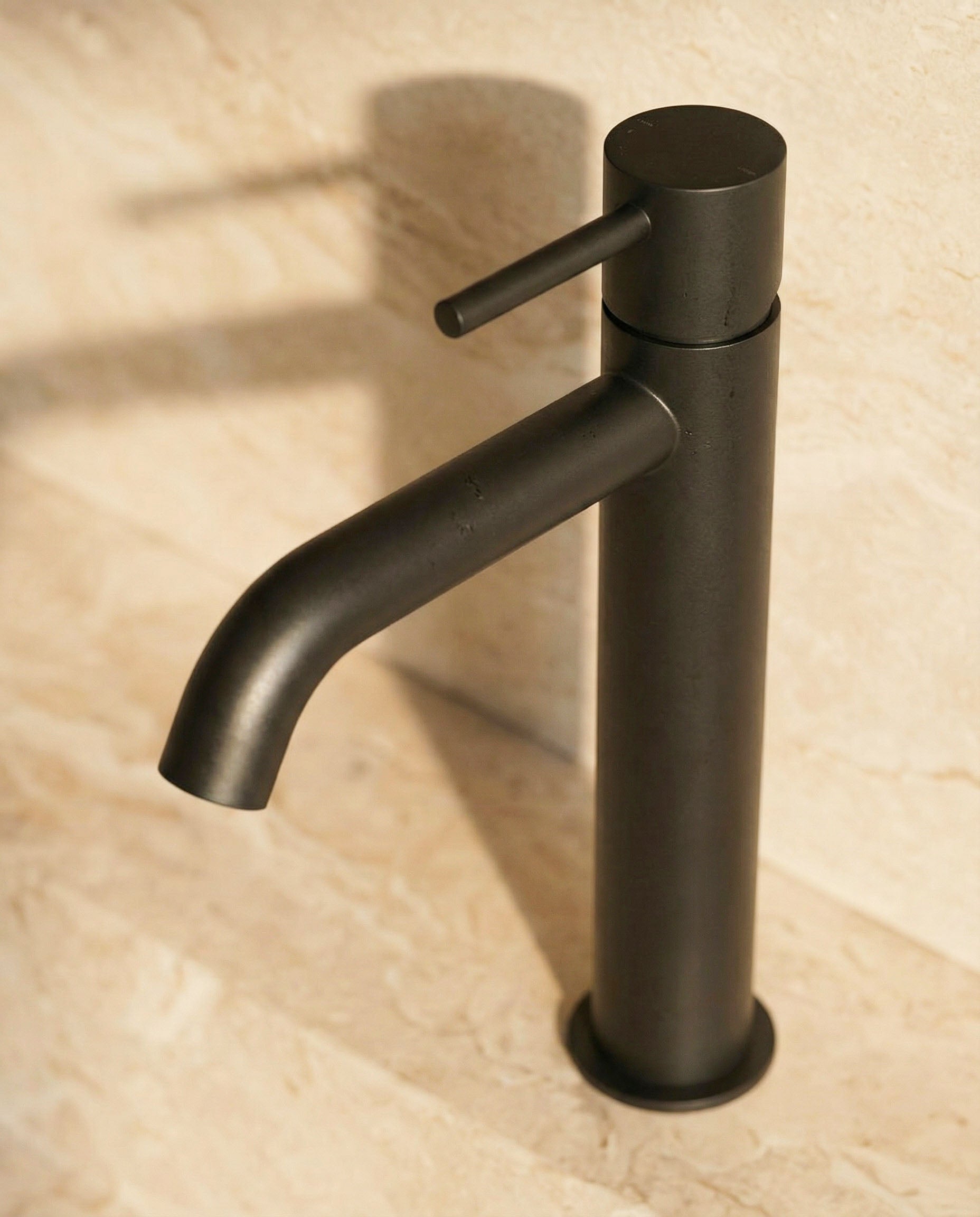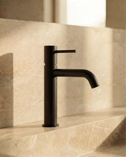 Einhebel-Waschtischarmatur mit weichen, abgerundeten Linien. Der zylindrische Korpus und der abwärts geneigte Auslauf sorgen für eine fließende, naturnahe Ästhetik, während der schlanke Hebel für optische Leichtigkeit sorgt. Die klare, italienisch anmutende Silhouette ist perfekt proportioniert – kein Wunder, dass sie so weit verbreitet ist.