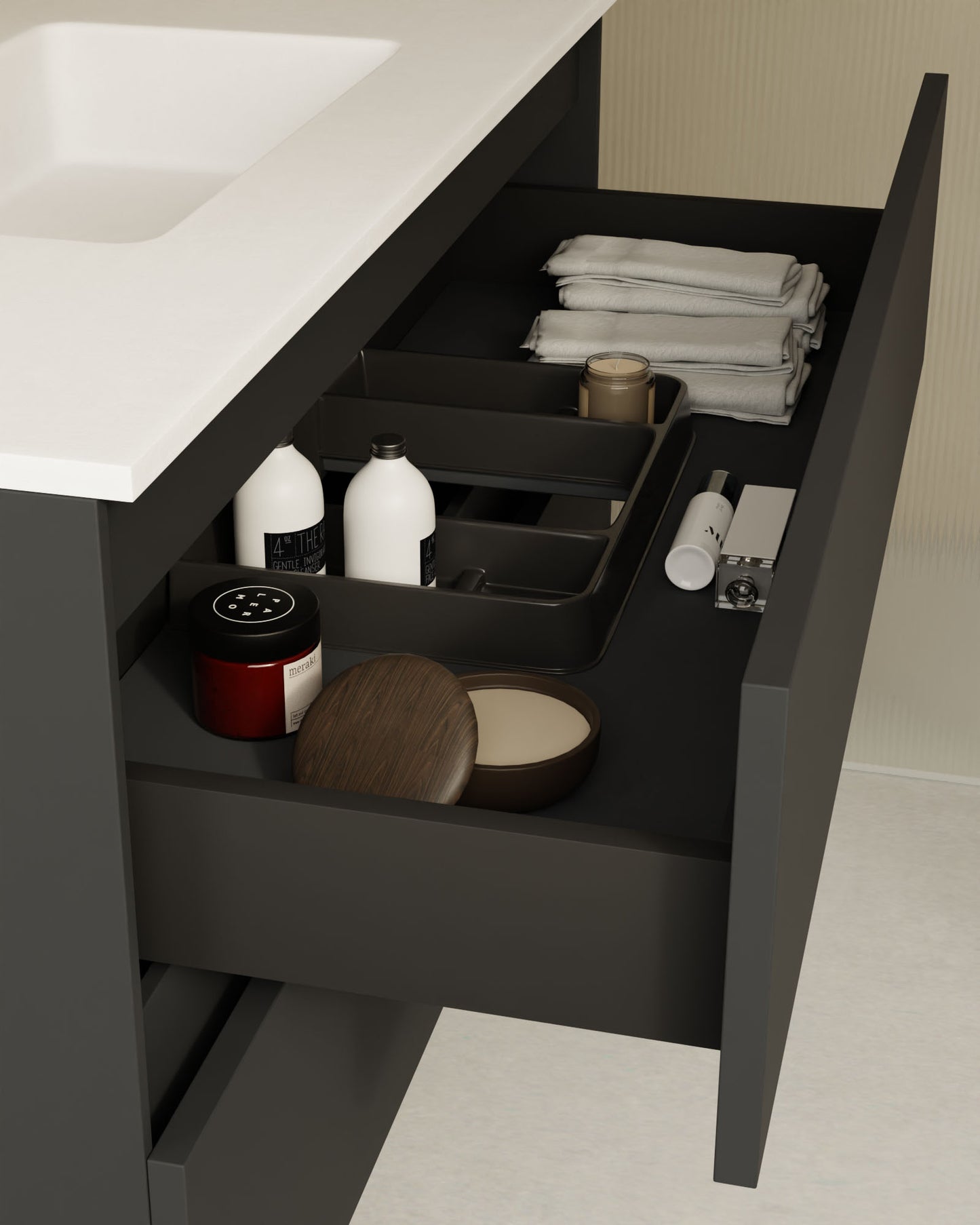 Zuri ist ein Waschbeckenunterschrank mit einer eleganten, glatten Front und einer minimalistischen, geraden Griffleiste. Erhältlich in drei raffinierten Ausführungen – Natureiche, Meerblau, Kitami-Grün, Nussbaum, Taupe, Aschgrau und Weiߠ– verleiht er jedem Bad Stil und Farbe mit einer puren Ästhetik.