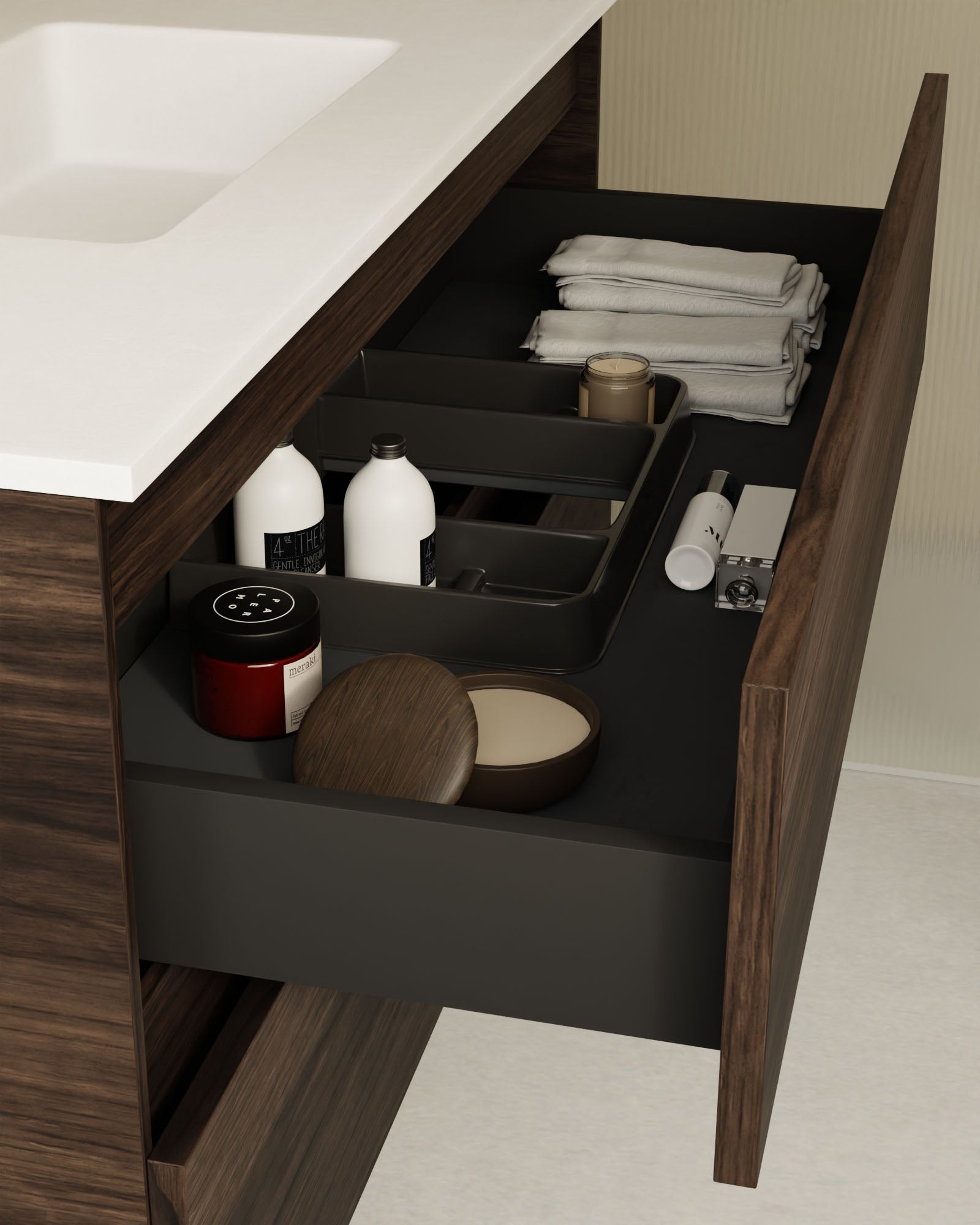 Zuri ist ein Waschbeckenunterschrank mit einer eleganten, glatten Front und einer minimalistischen, geraden Griffleiste. Erhältlich in drei raffinierten Ausführungen – Natureiche, Meerblau, Kitami-Grün, Nussbaum, Taupe, Aschgrau und Weiߠ– verleiht er jedem Bad Stil und Farbe mit einer puren Ästhetik.