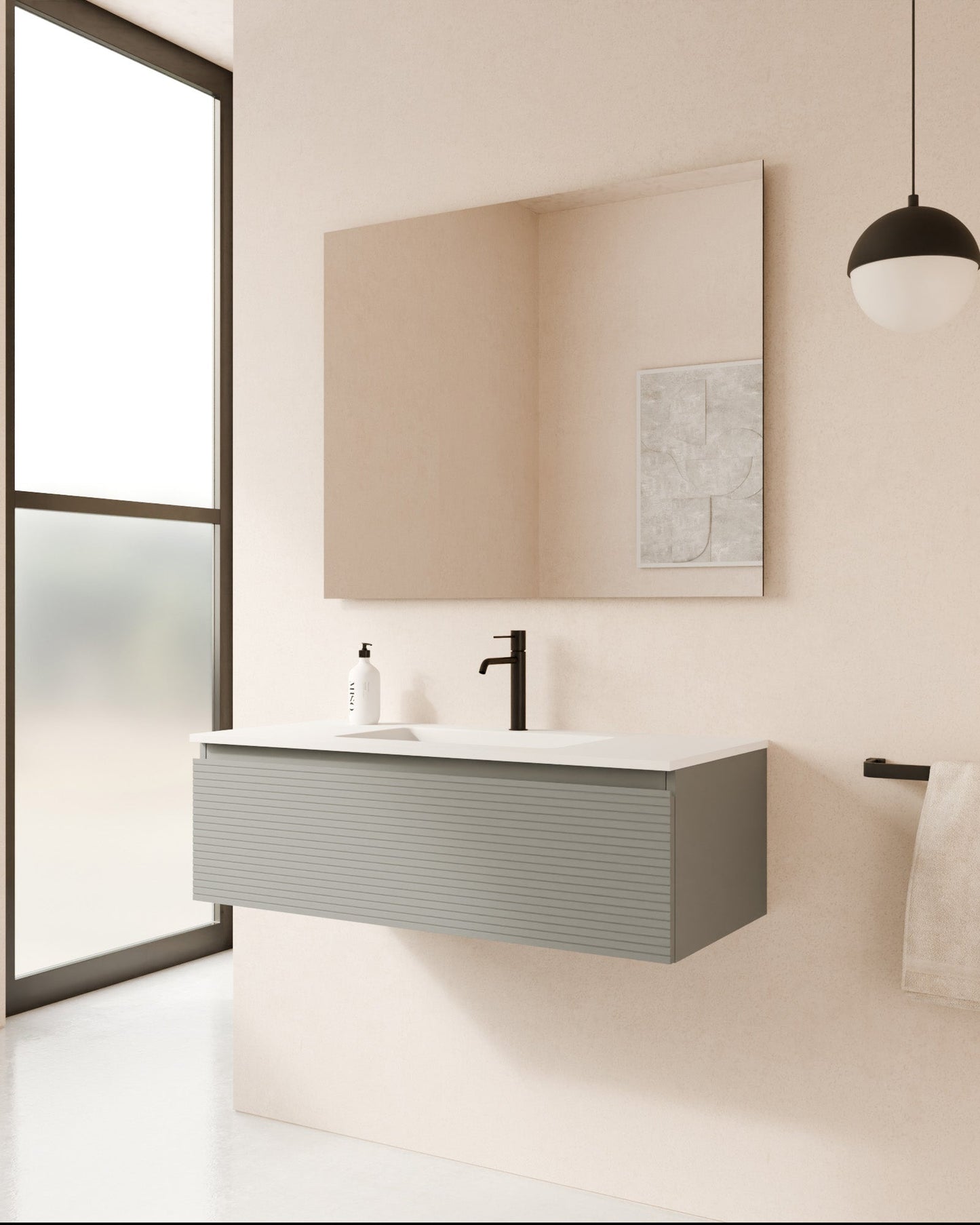 The sink cabinet is characterized by its delicate horizontal groove design. The gentle rhythm and precise lines give each bathroom a visual calmness and a sense of spaciousness. The opening is done via a classic finger pull at the top. The angled, flat handle ensures a gentle, ergonomic handling.