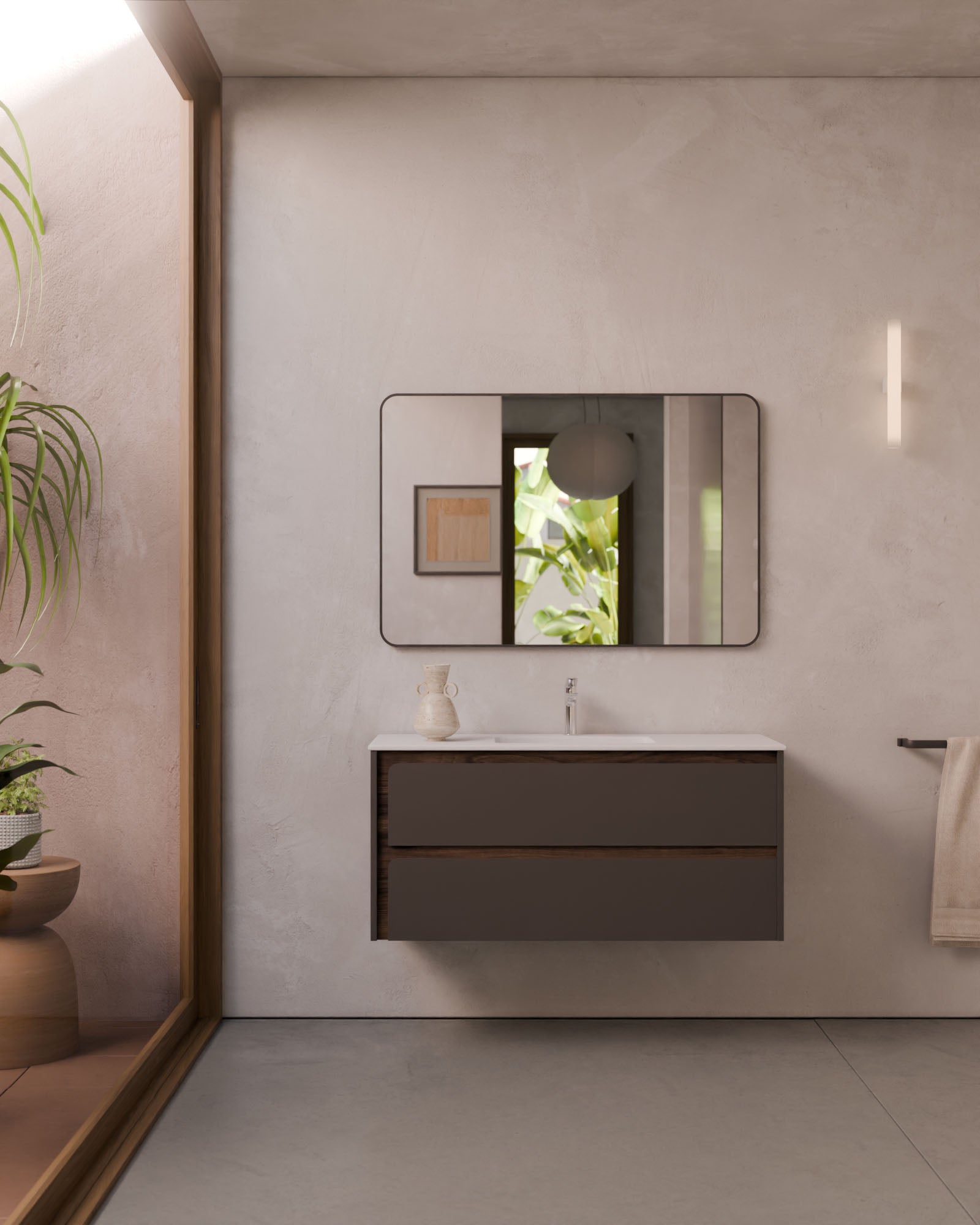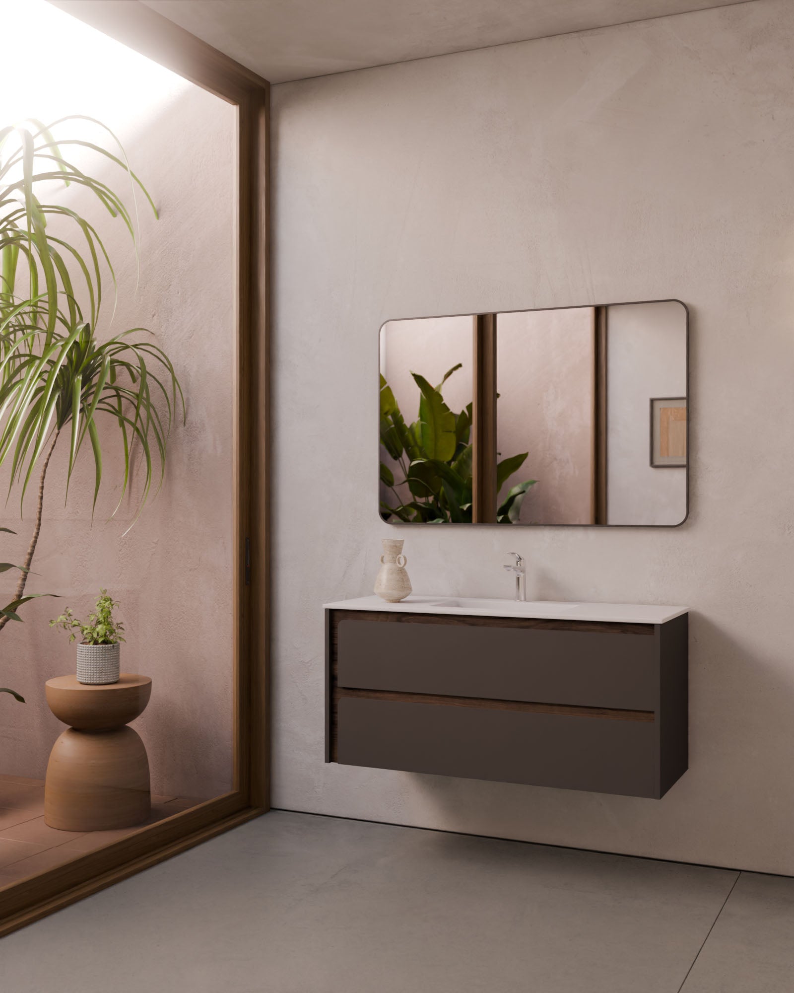Der große Mehrwert liegt in der individuellen Konfiguration: Die Möbeloberfläche kann mit einem Frontrahmen in Lack oder Nussbaum kombiniert werden, um ein maßgeschneidertes Ergebnis zu erzielen. Indico passt sich nicht dem Bad an – Indico definiert das Bad.