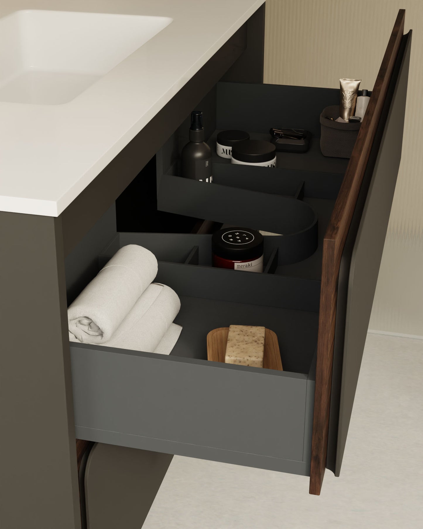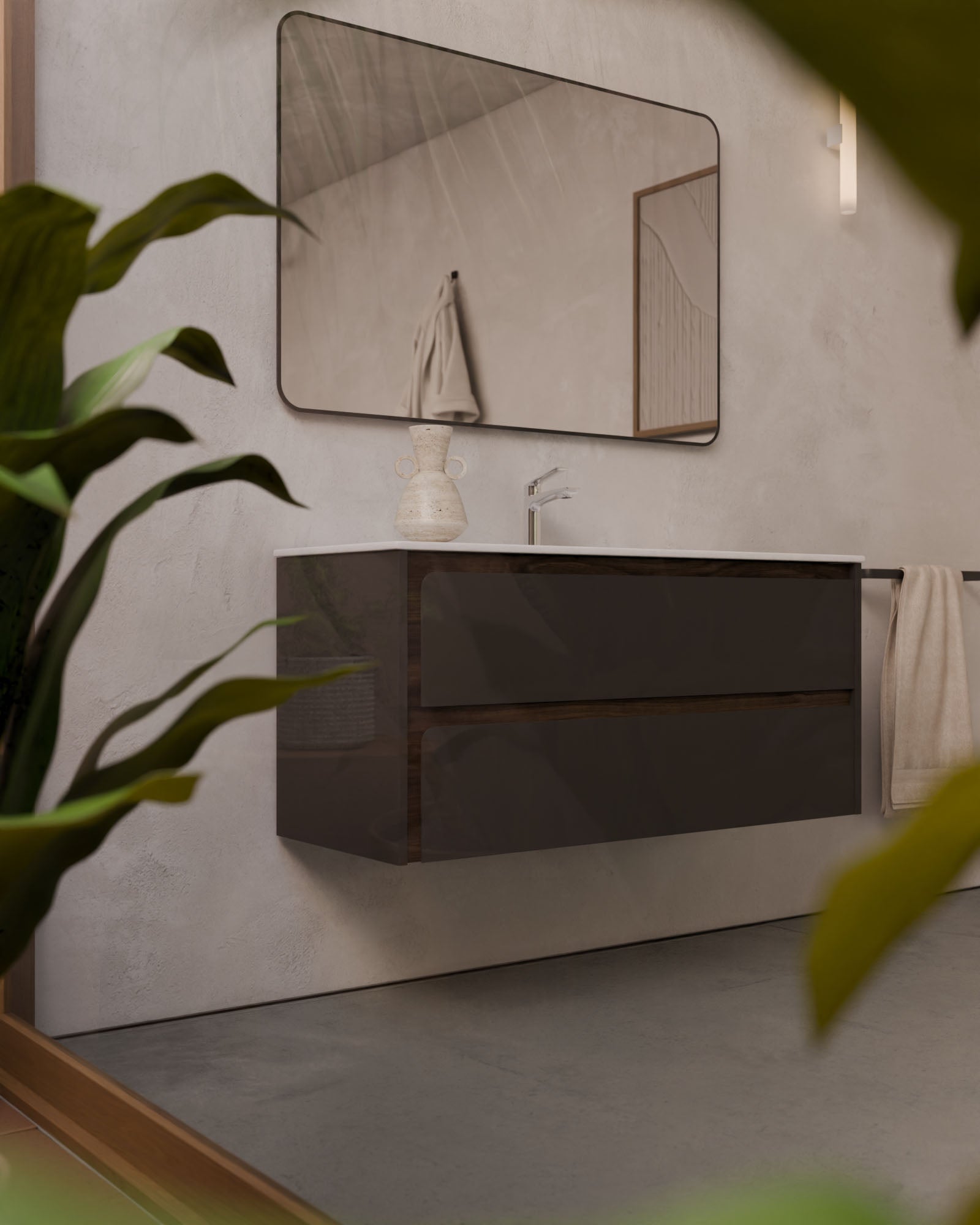 Indico steht für kompromissloses Design. Das hängende Badmöbel besticht durch seine an den Enden geschwungene Front – ein seltenes Gestaltungselement, das dem Raum visuelle Ruhe und eine starke Identität verleiht.