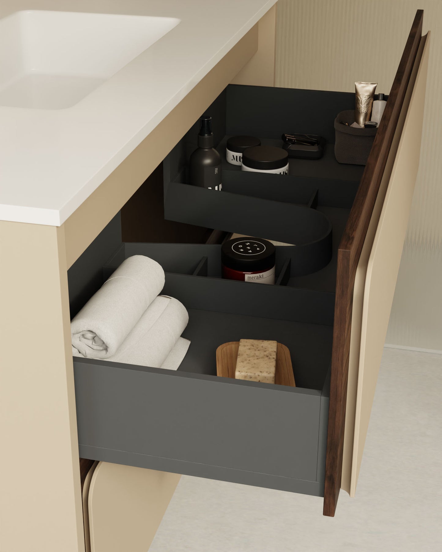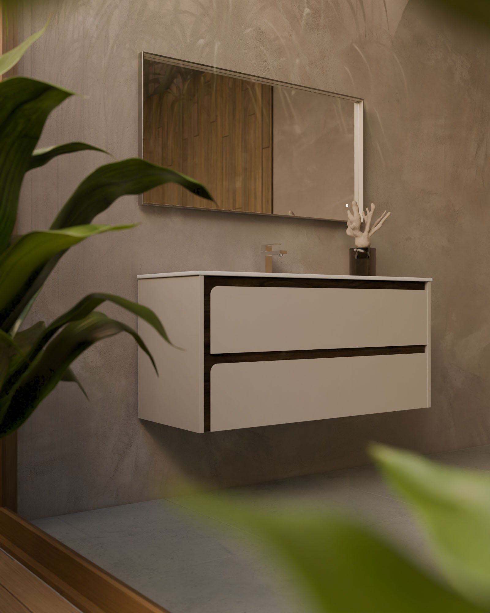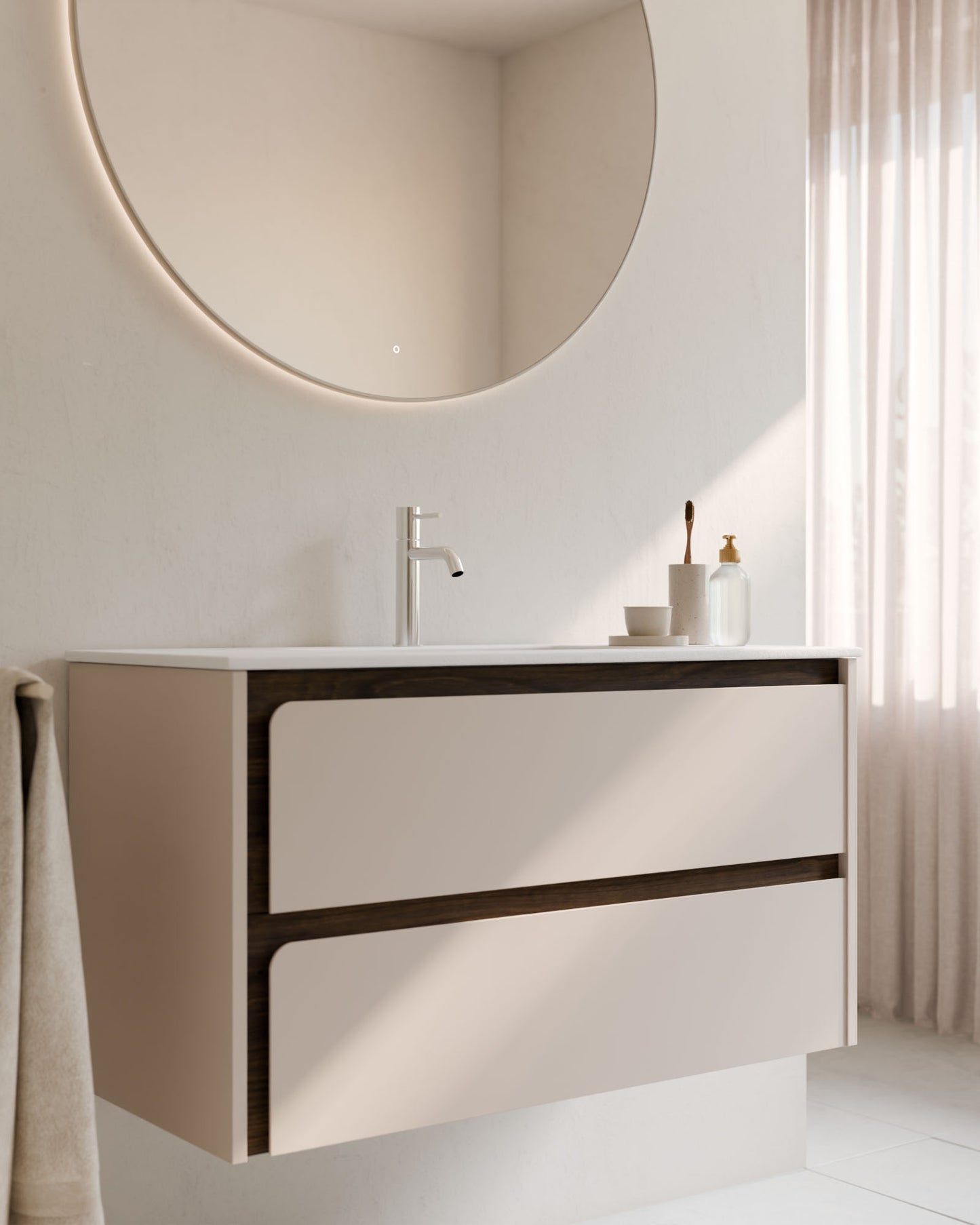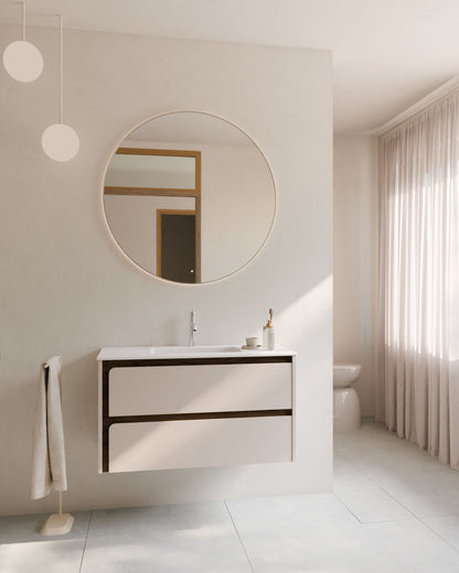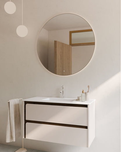 Indico steht für kompromissloses Design. Das hängende Badmöbel besticht durch seine an den Enden geschwungene Front – ein seltenes Gestaltungselement, das dem Raum visuelle Ruhe und eine starke Identität verleiht.