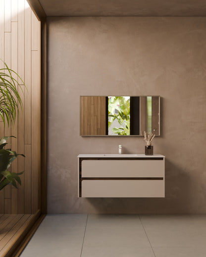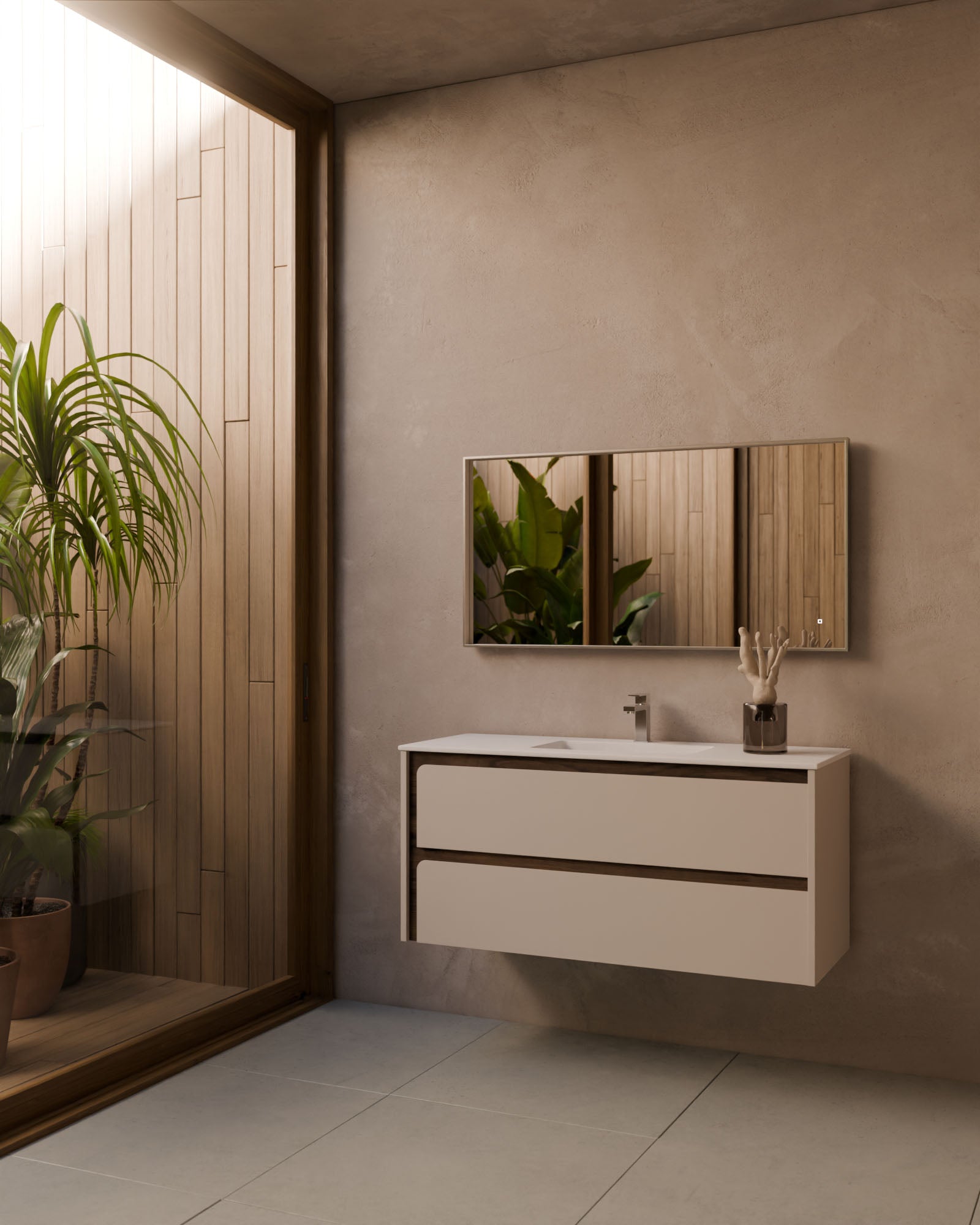 Der große Mehrwert liegt in der individuellen Konfiguration: Die Möbeloberfläche kann mit einem Frontrahmen in Lack oder Nussbaum kombiniert werden, um ein maßgeschneidertes Ergebnis zu erzielen. Indico passt sich nicht dem Bad an – Indico definiert das Bad.