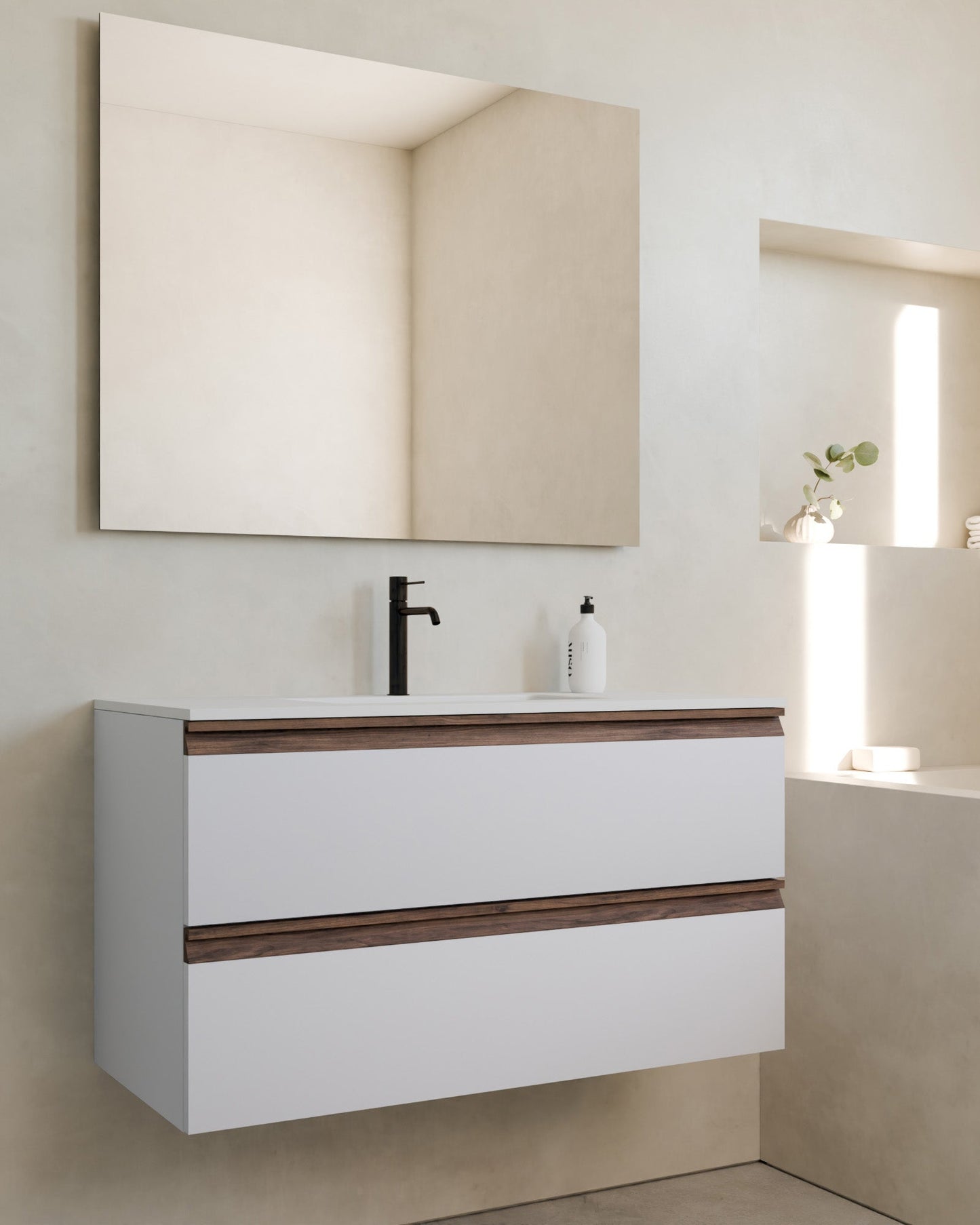 Vanity unit with a smooth front and integrated walnut handle. The contrast between the minimalist body and the warm wood of the handle gives the model a modern and refined touch. The visible handle allows for easy opening and also serves as a visual accent.