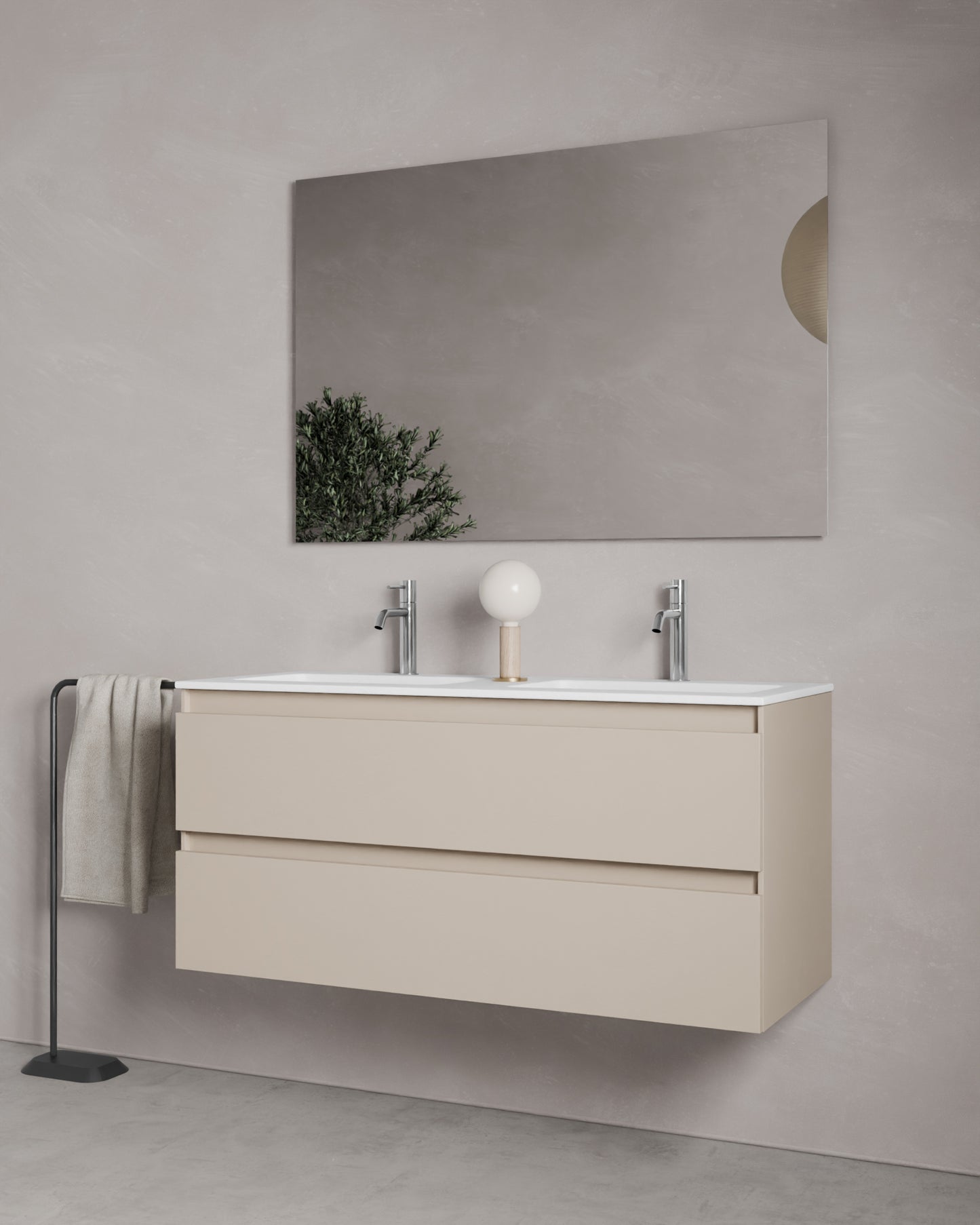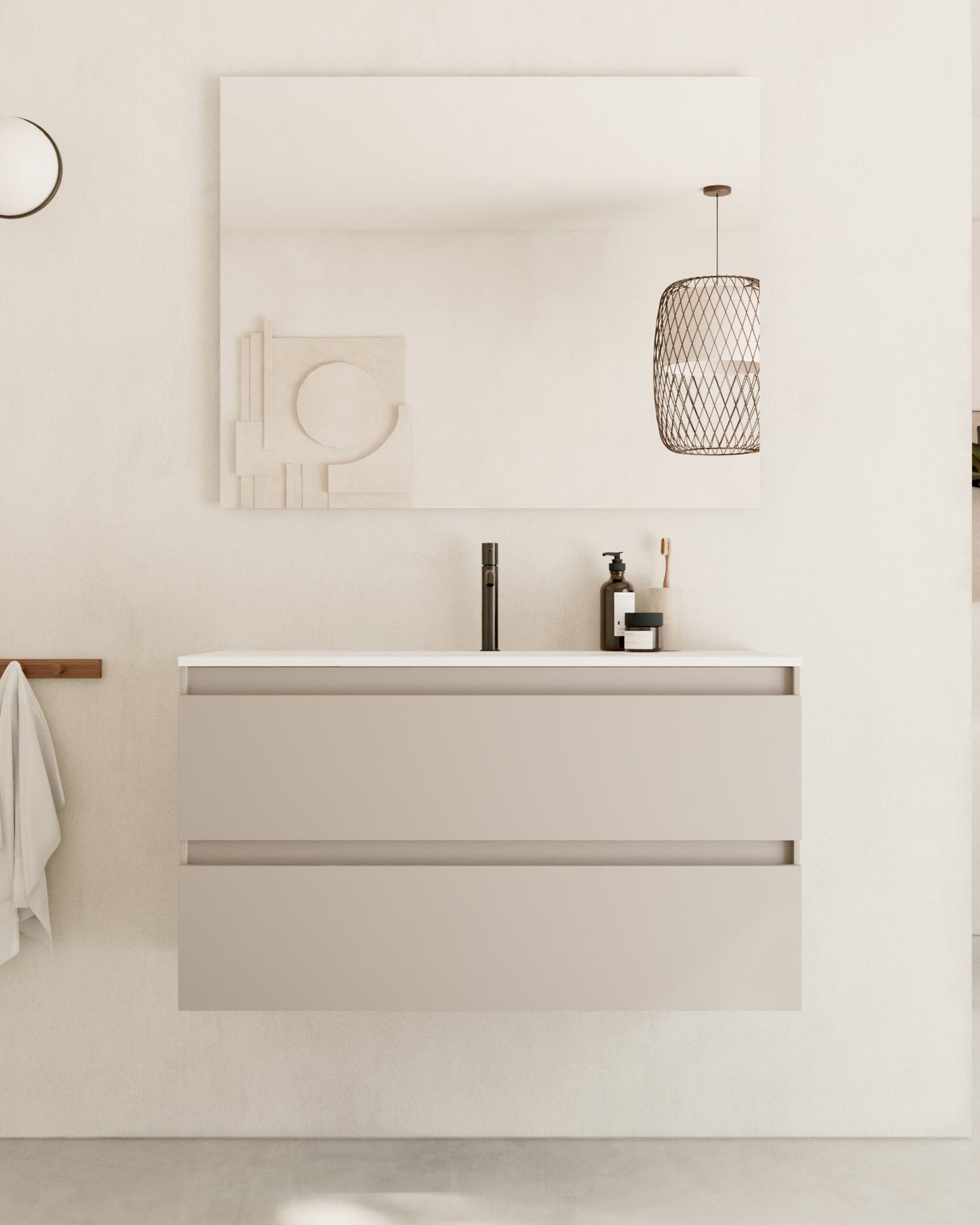 Zuri is a sink cabinet with an elegant, smooth front and a minimalist, straight handle strip. Available in three refined finishes – natural oak, sea blue, Kitami green, walnut, taupe, ash gray, and white – it adds style and color to any bathroom with a pure aesthetic.