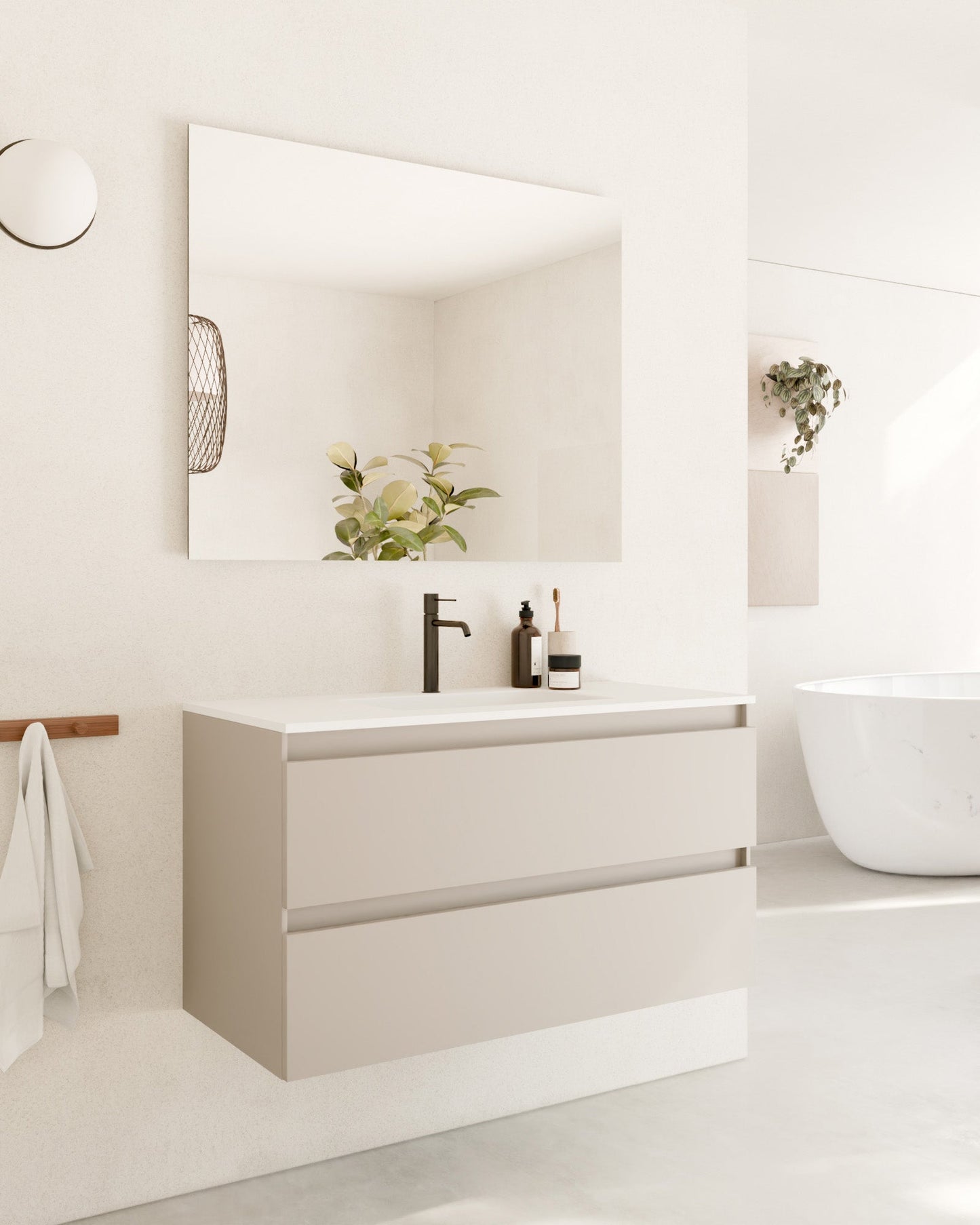 Zuri es un mueble de baño con un elegante frente liso y un tirador recto y minimalista. Disponible en tres sofisticados acabados (Verde Kitami, Taupe y Nogal), añade estilo y color a cualquier baño con una estética pura.