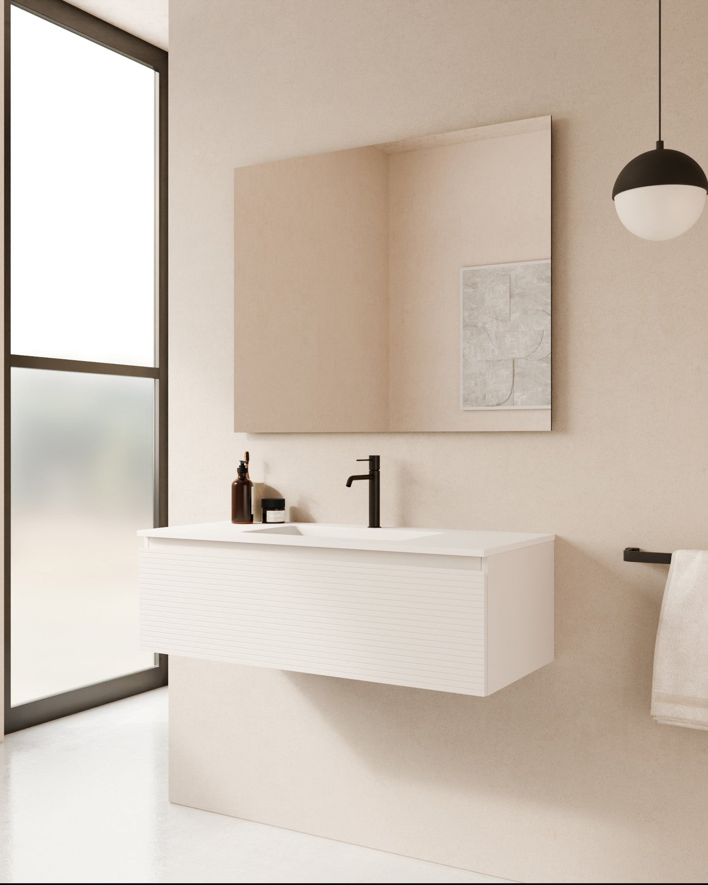 • Waschtisch: Mattweisser Mineralwerkstoff oder Keramik