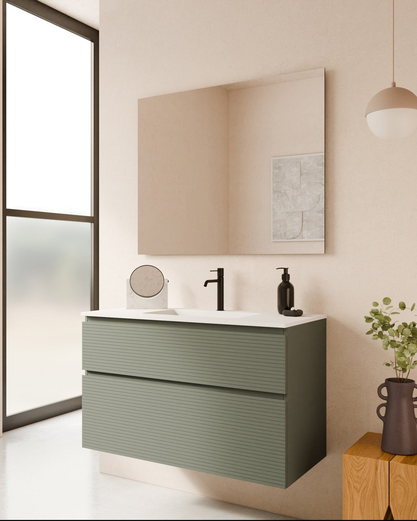 Der Waschbeckenunterschrank zeichnet sich durch seine filigrane horizontale Rillenoptik aus. Der sanfte Rhythmus und die präzisen Linien verleihen jedem Bad optische Ruhe und ein Gefühl der Weitläufigkeit. Die Öffnung erfolgt über einen klassischen Fingerzug an der Oberseite. Der angeschrägte, flache Griff sorgt für eine sanfte, ergonomische Handhabung.
