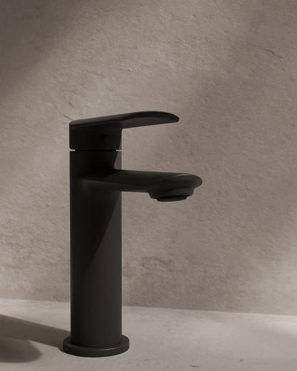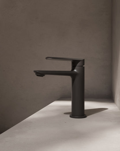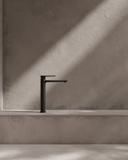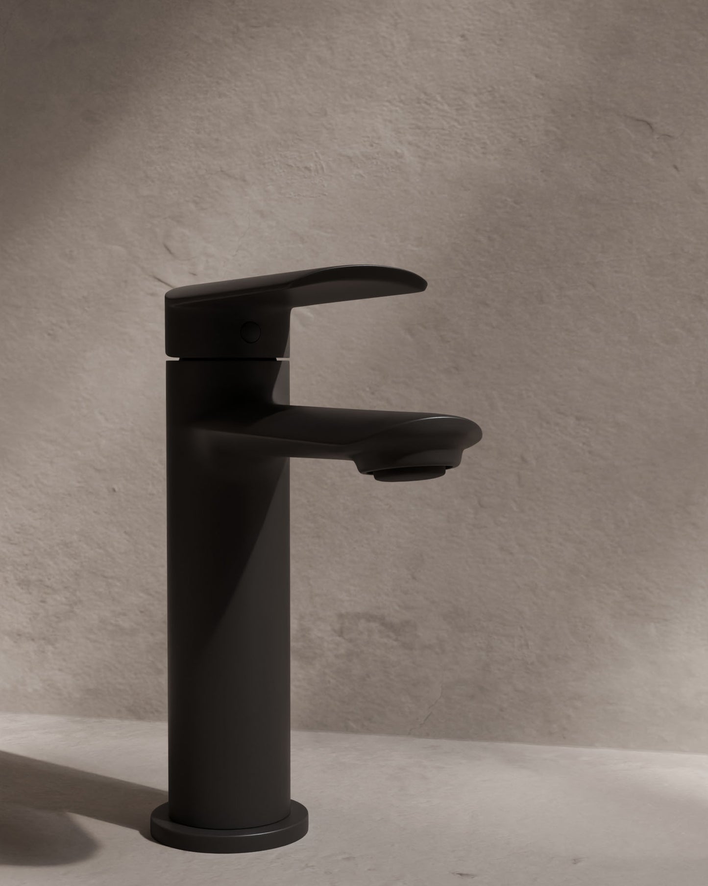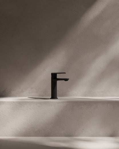 Einhebel-Waschtischarmatur mit massivem Korpus und robustem Fuß. Schlicht, stabil und markant.