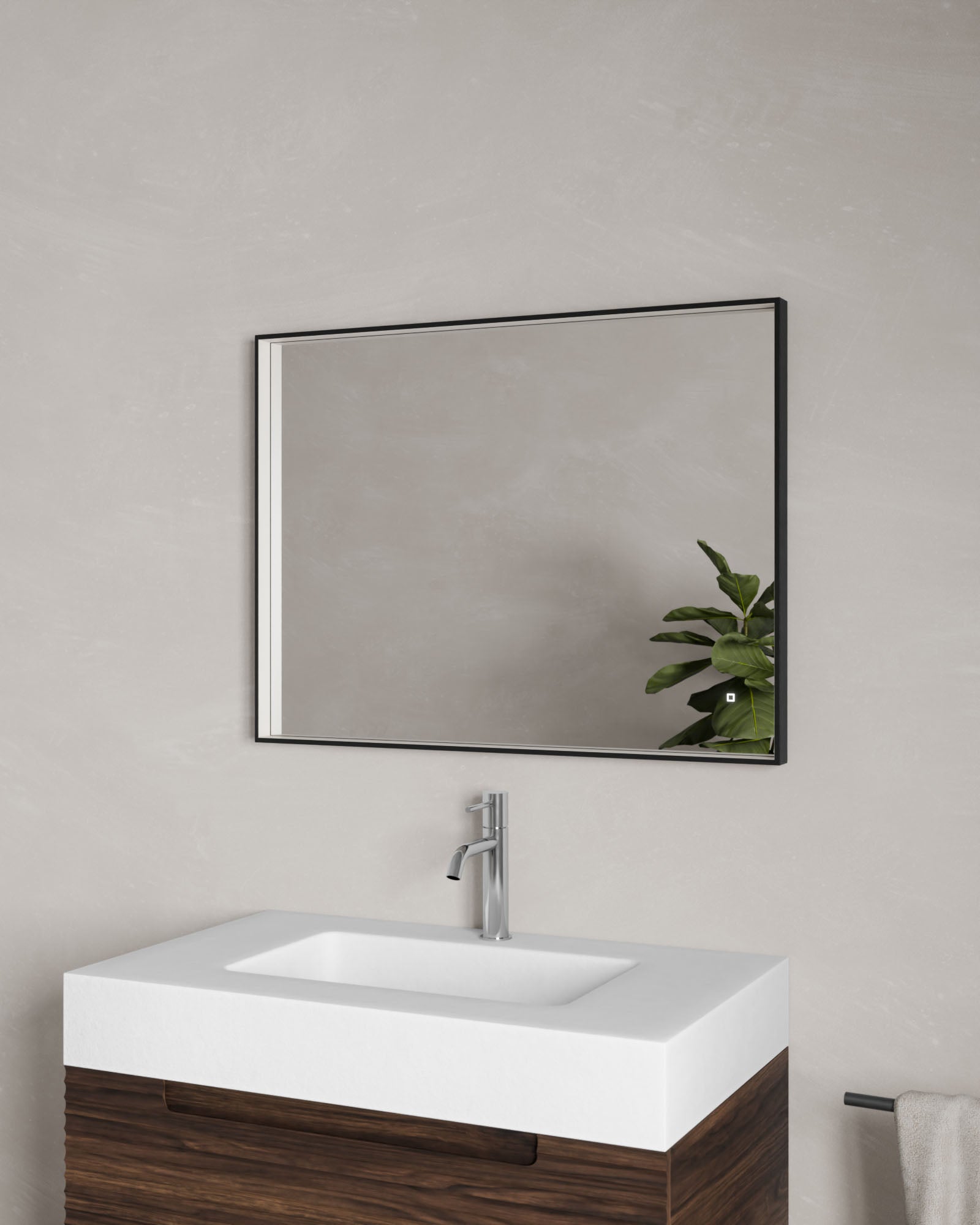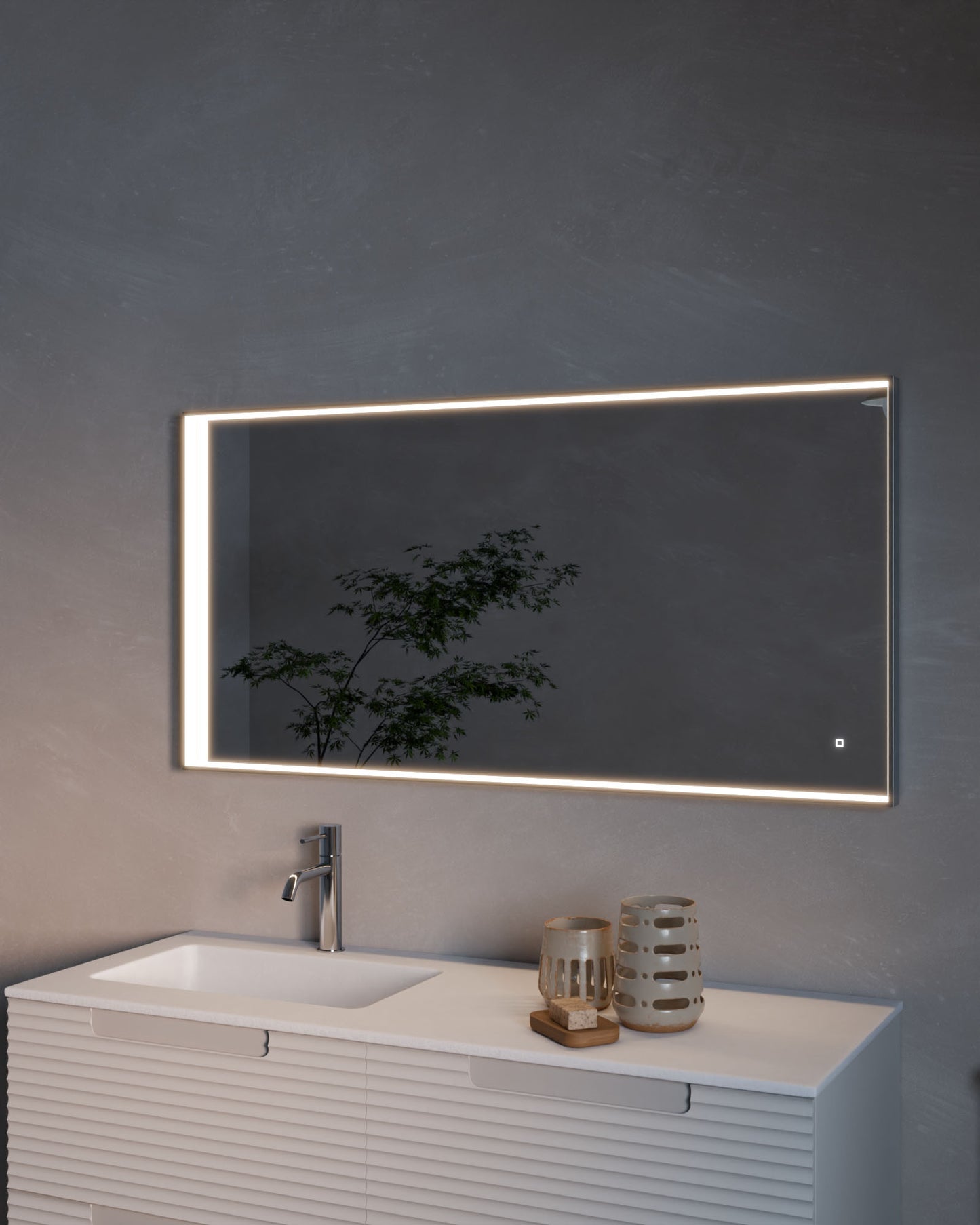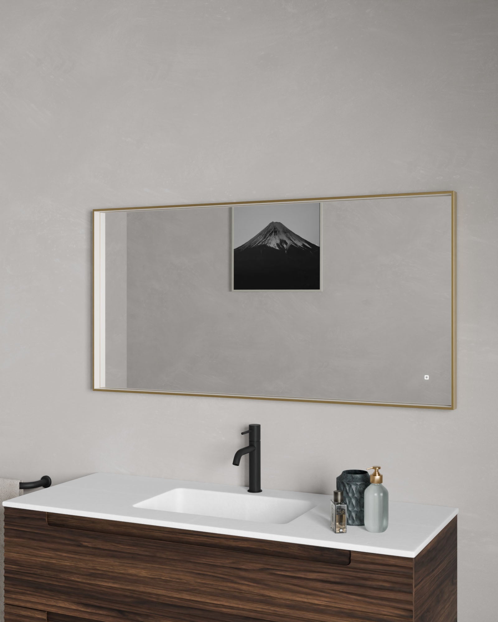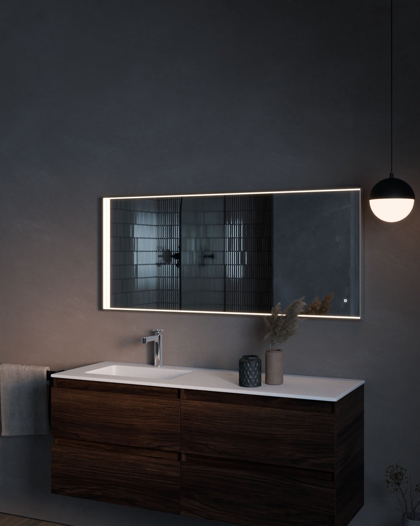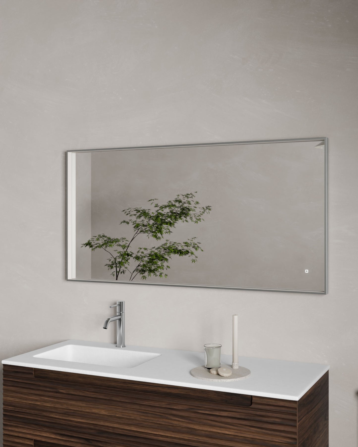 Rechteckiger Spiegel mit breitem Rahmen in Silber, Gold oder Schwarz, der minimalistisches Design mit modernster Technik kombiniert, um dein Bad zum Strahlen zu bringen.