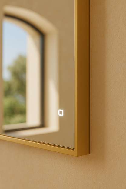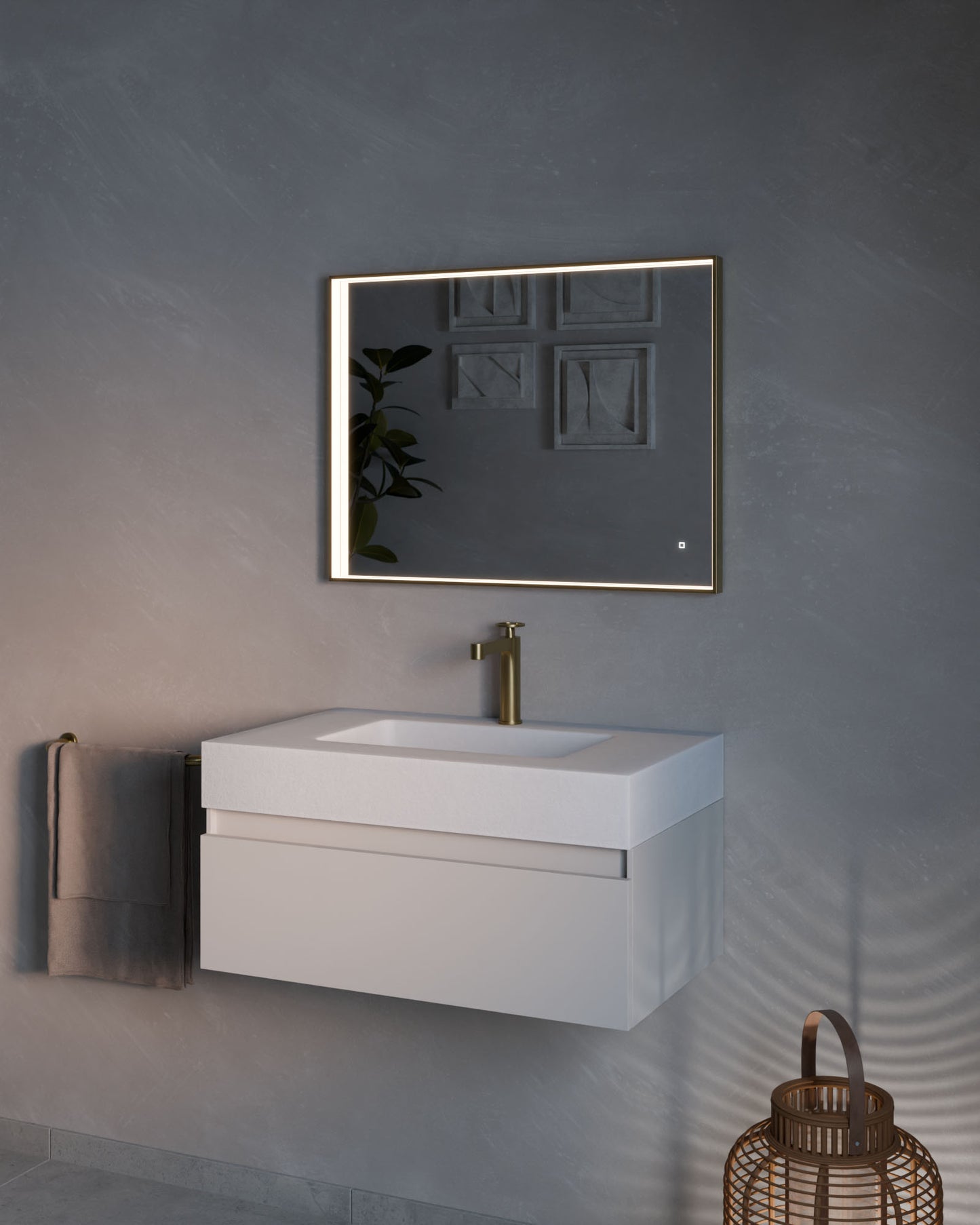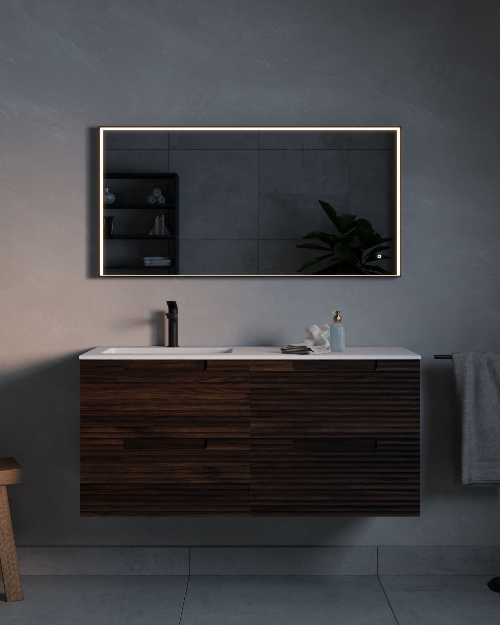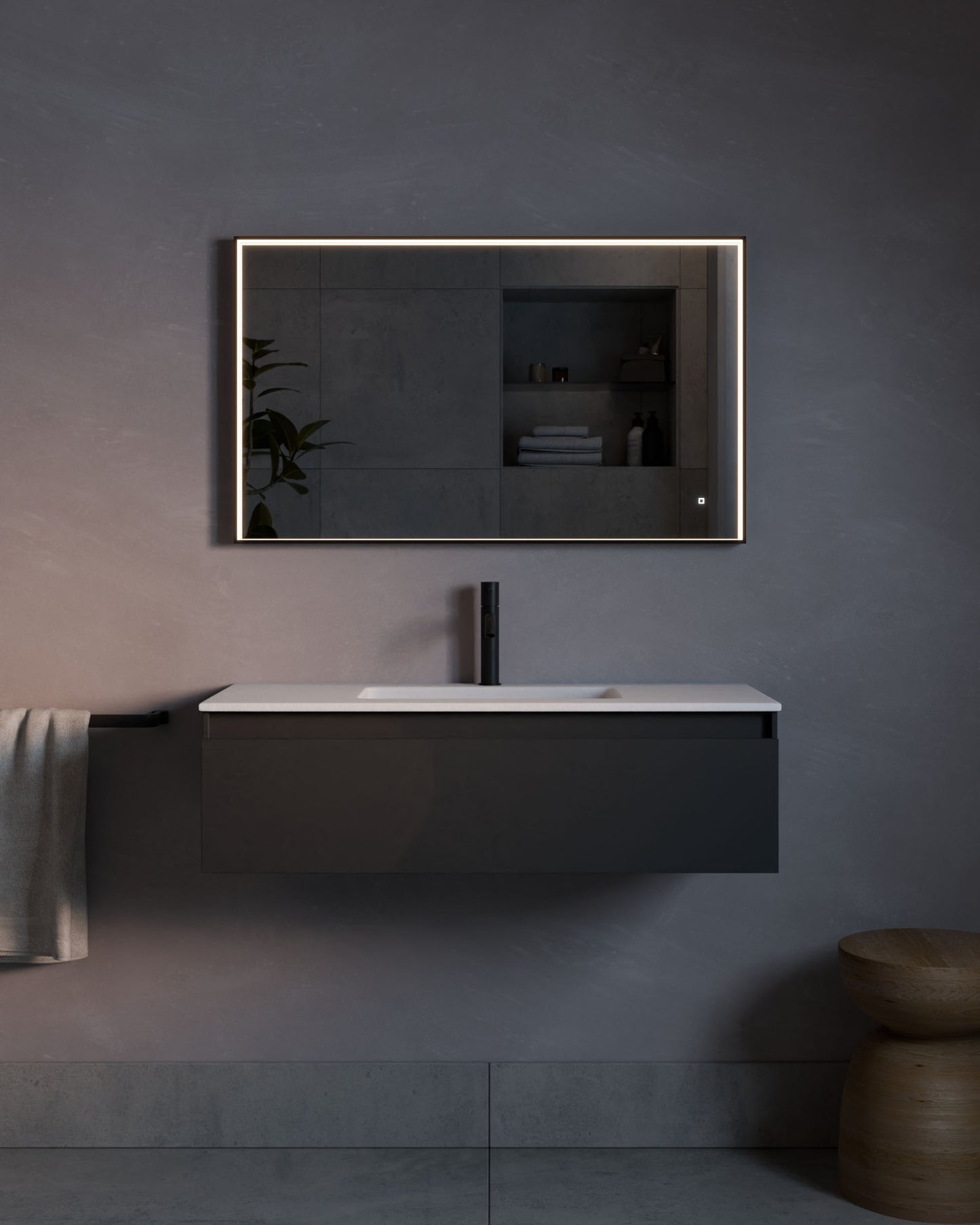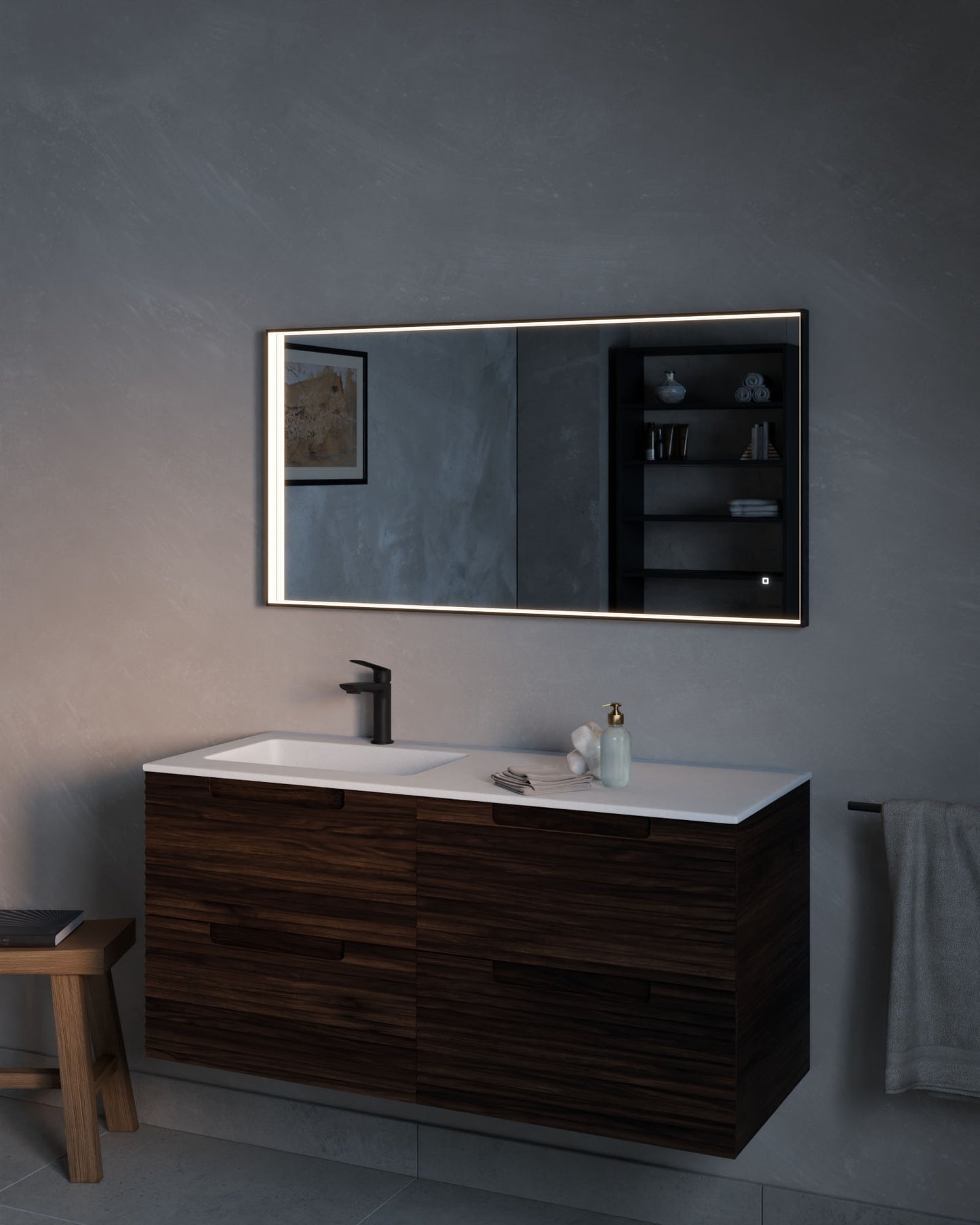 Rechteckiger Spiegel mit breitem Rahmen in Silber, Gold oder Schwarz, der minimalistisches Design mit modernster Technik kombiniert, um dein Bad zum Strahlen zu bringen.