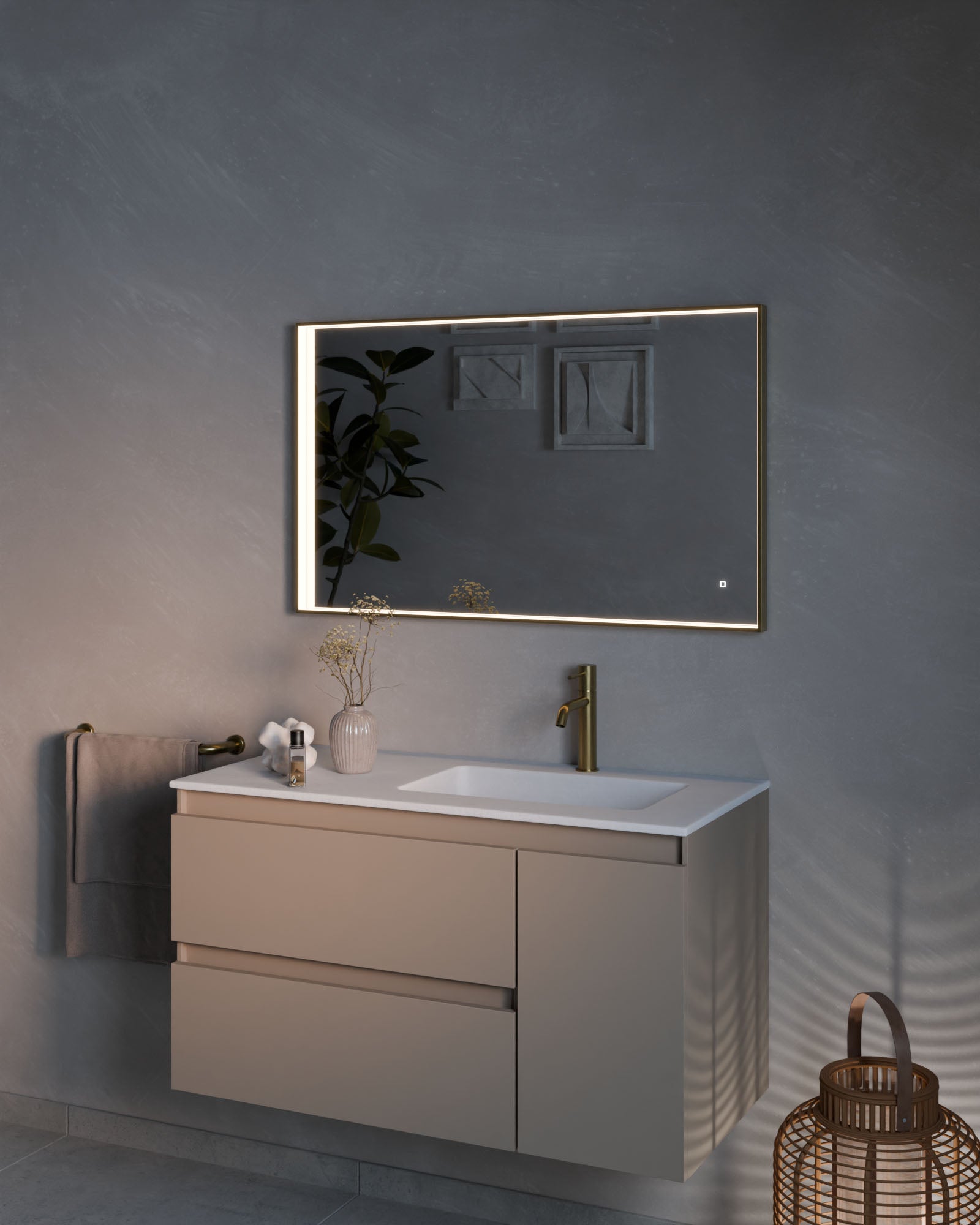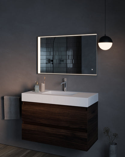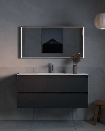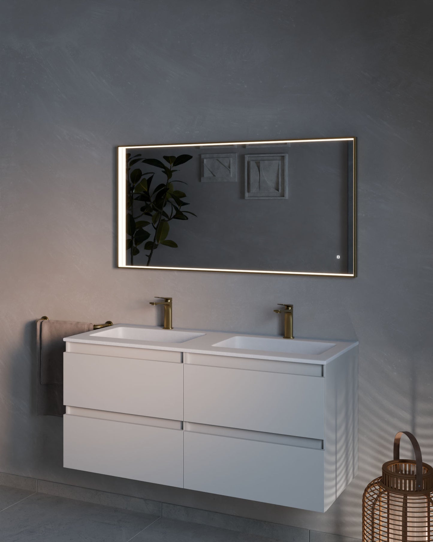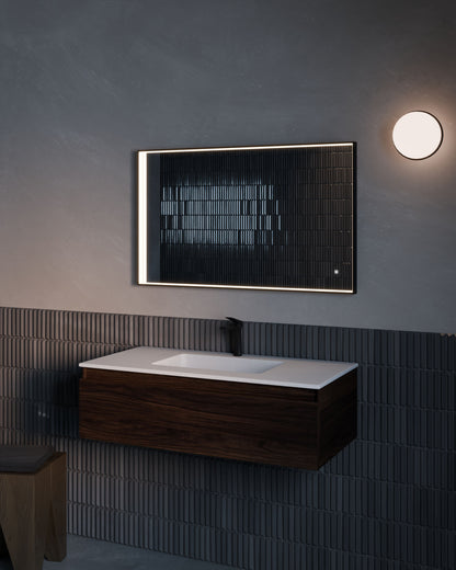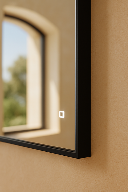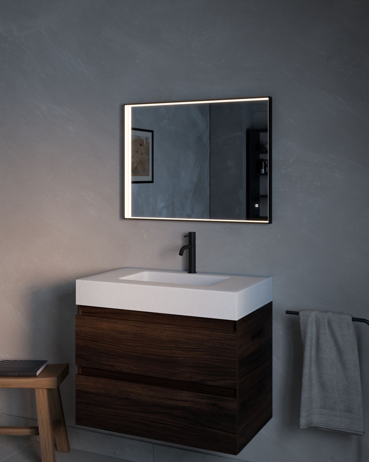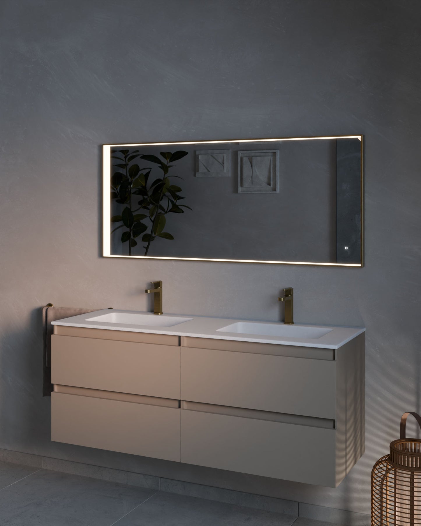 Rechteckiger Spiegel mit breitem Rahmen in Silber, Gold oder Schwarz, der minimalistisches Design mit modernster Technik kombiniert, um dein Bad zum Strahlen zu bringen.