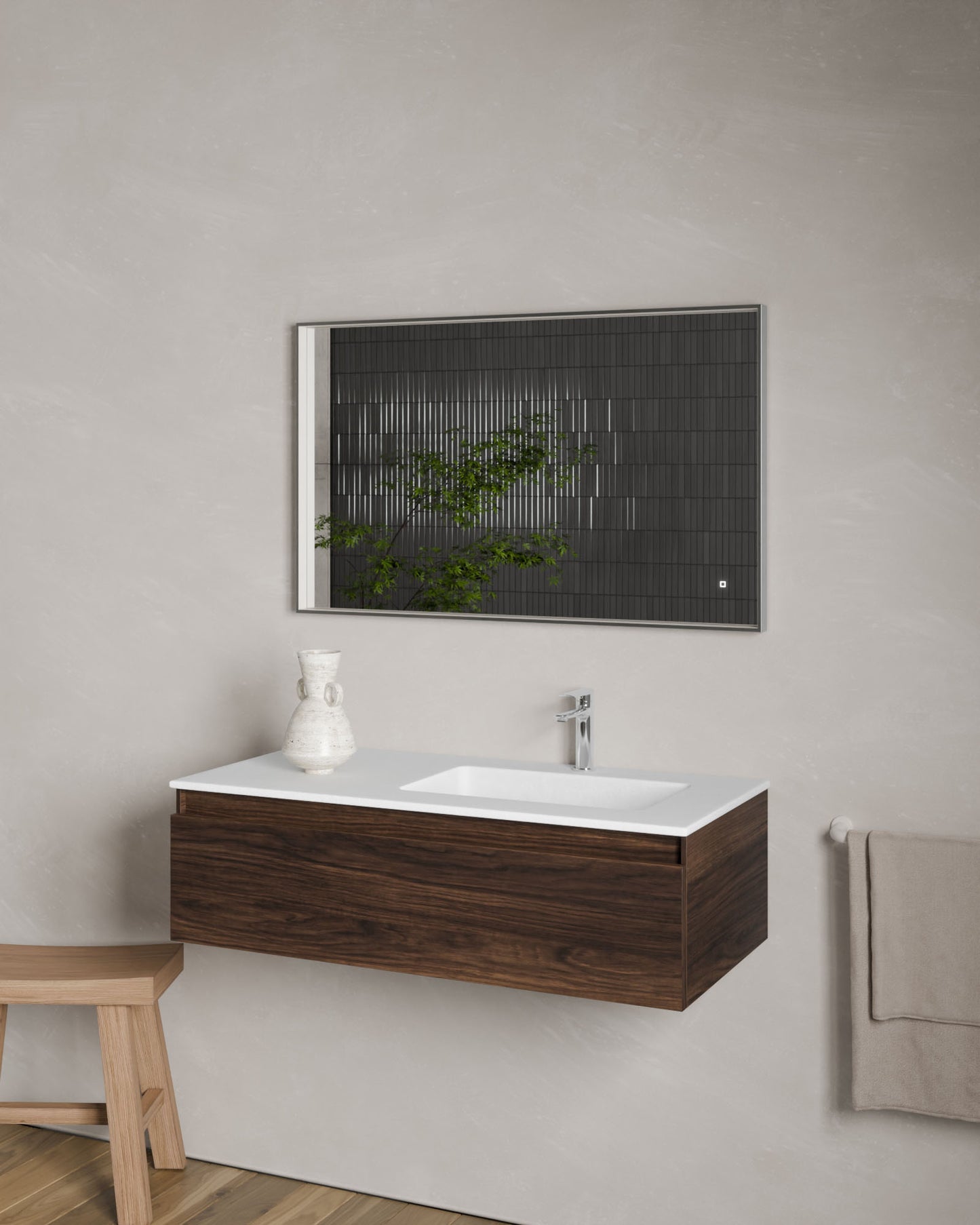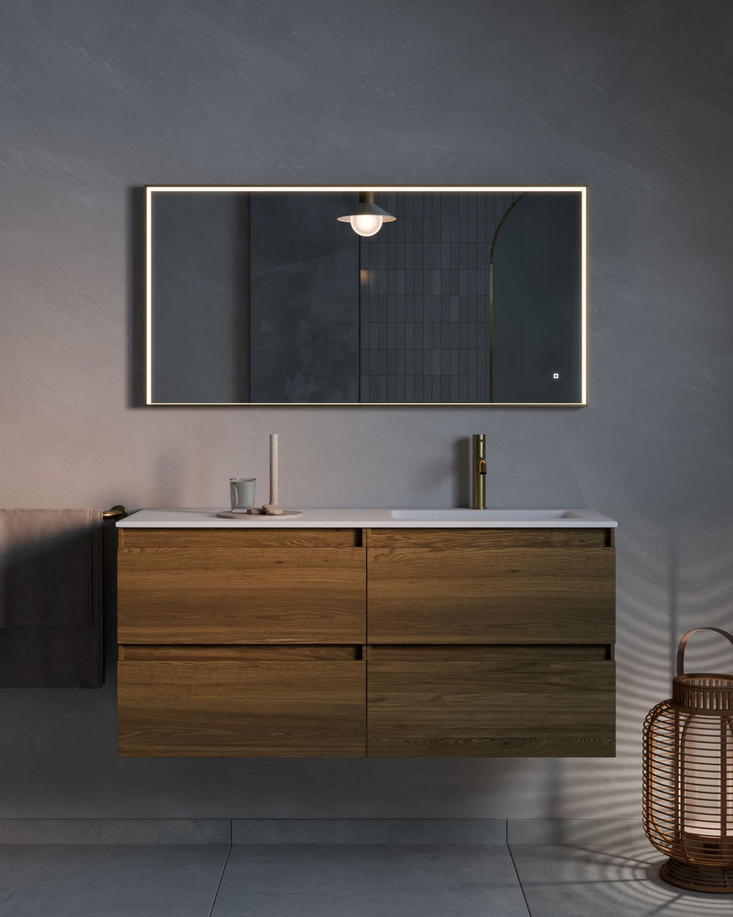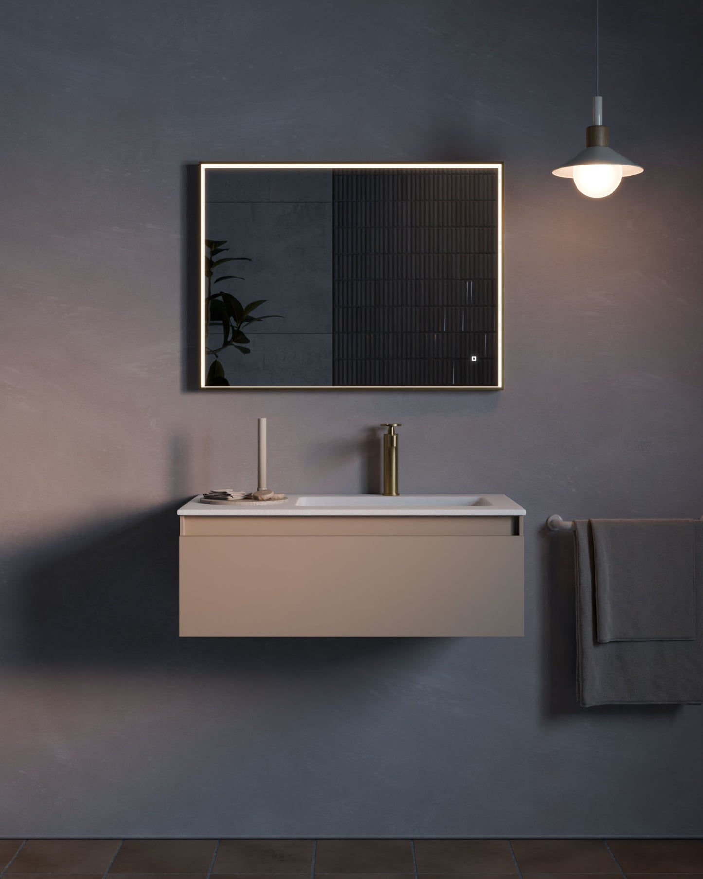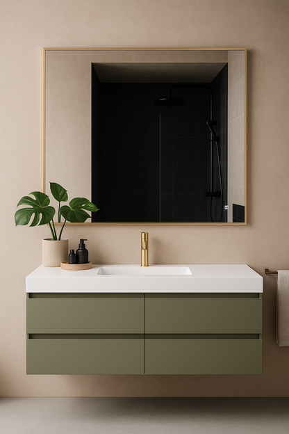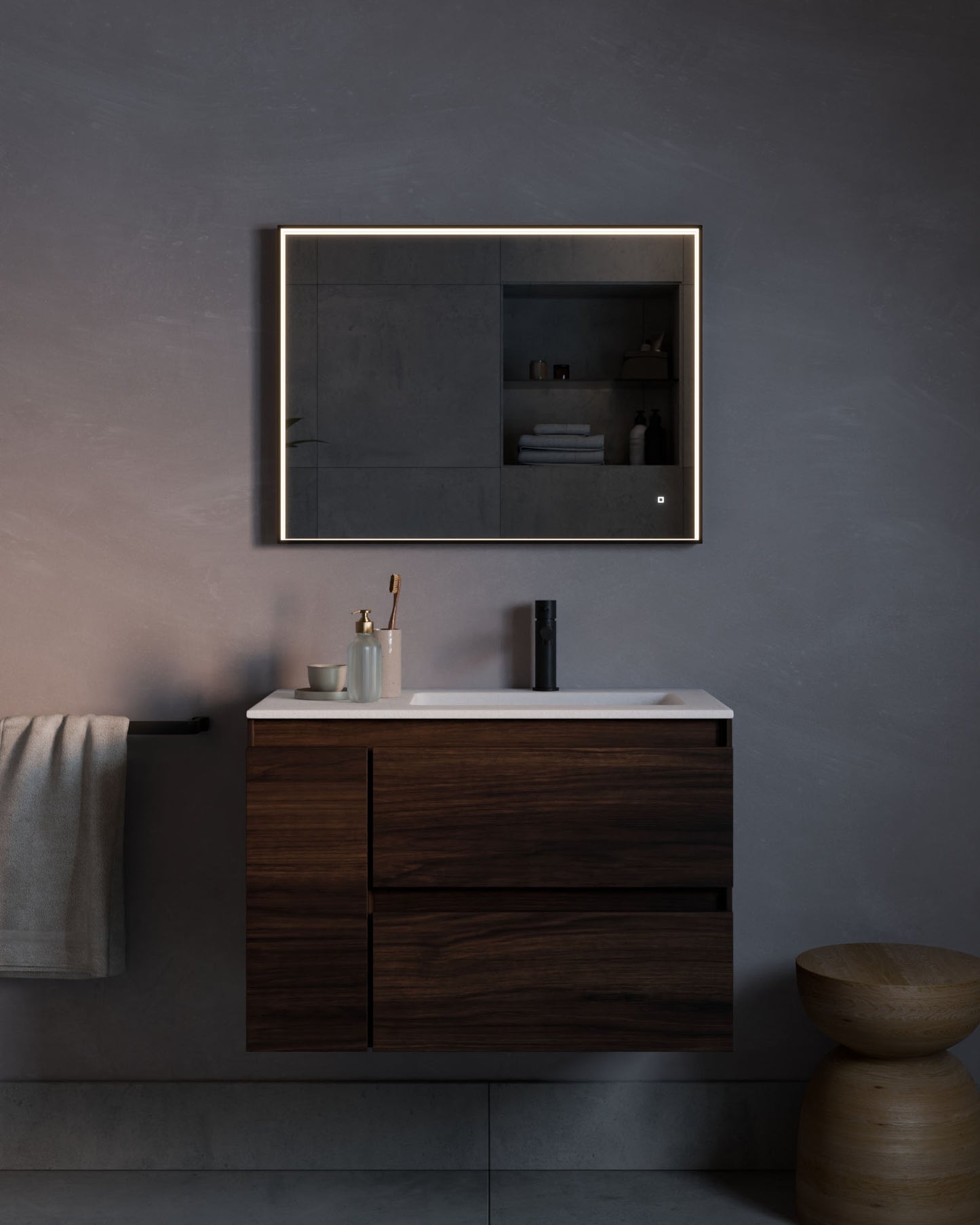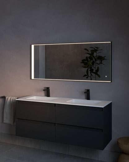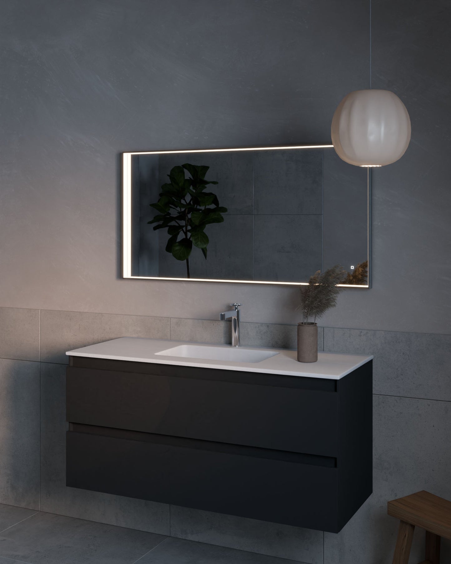 Rechteckiger Spiegel mit breitem Rahmen in Silber, Gold oder Schwarz, der minimalistisches Design mit modernster Technik kombiniert, um dein Bad zum Strahlen zu bringen.