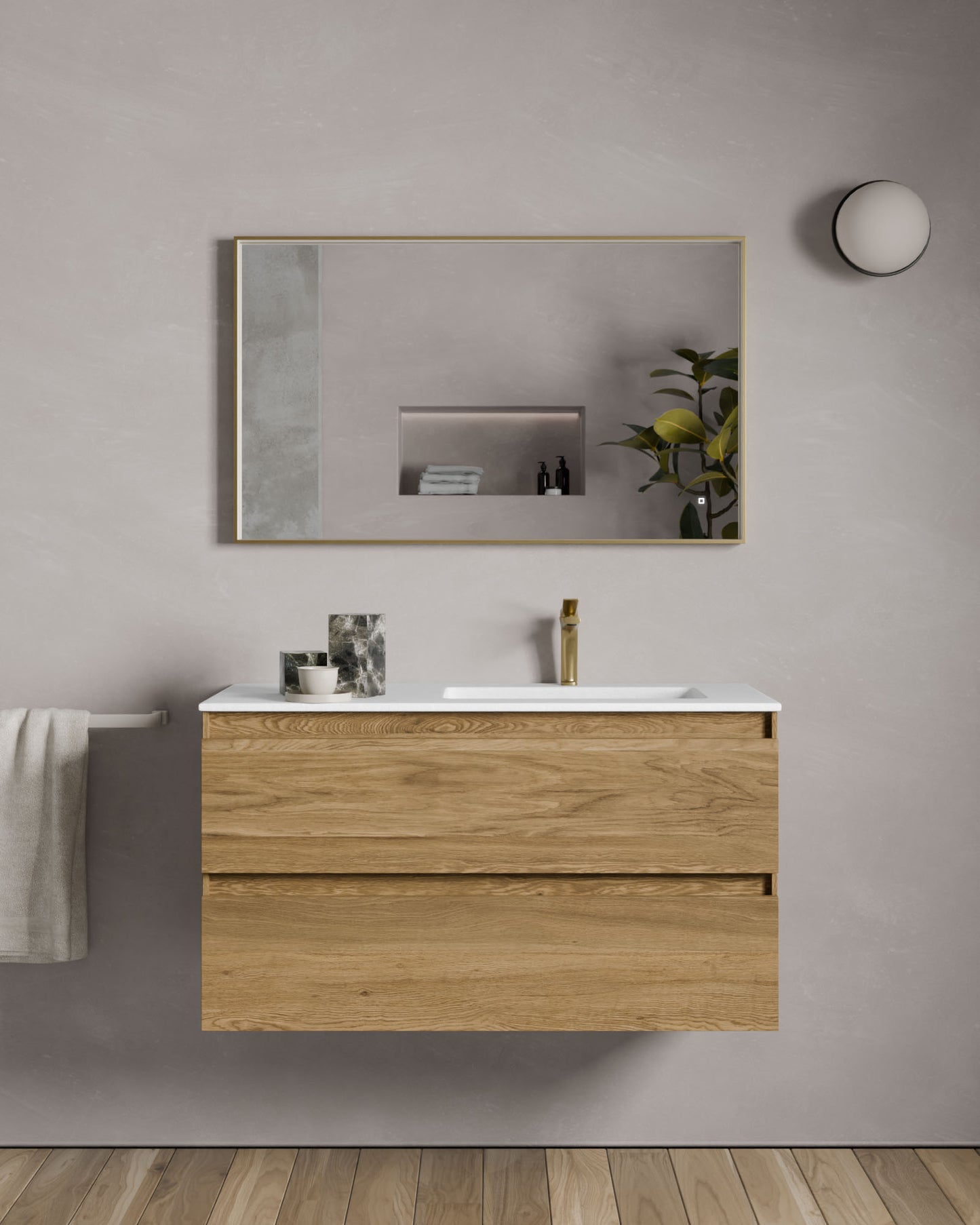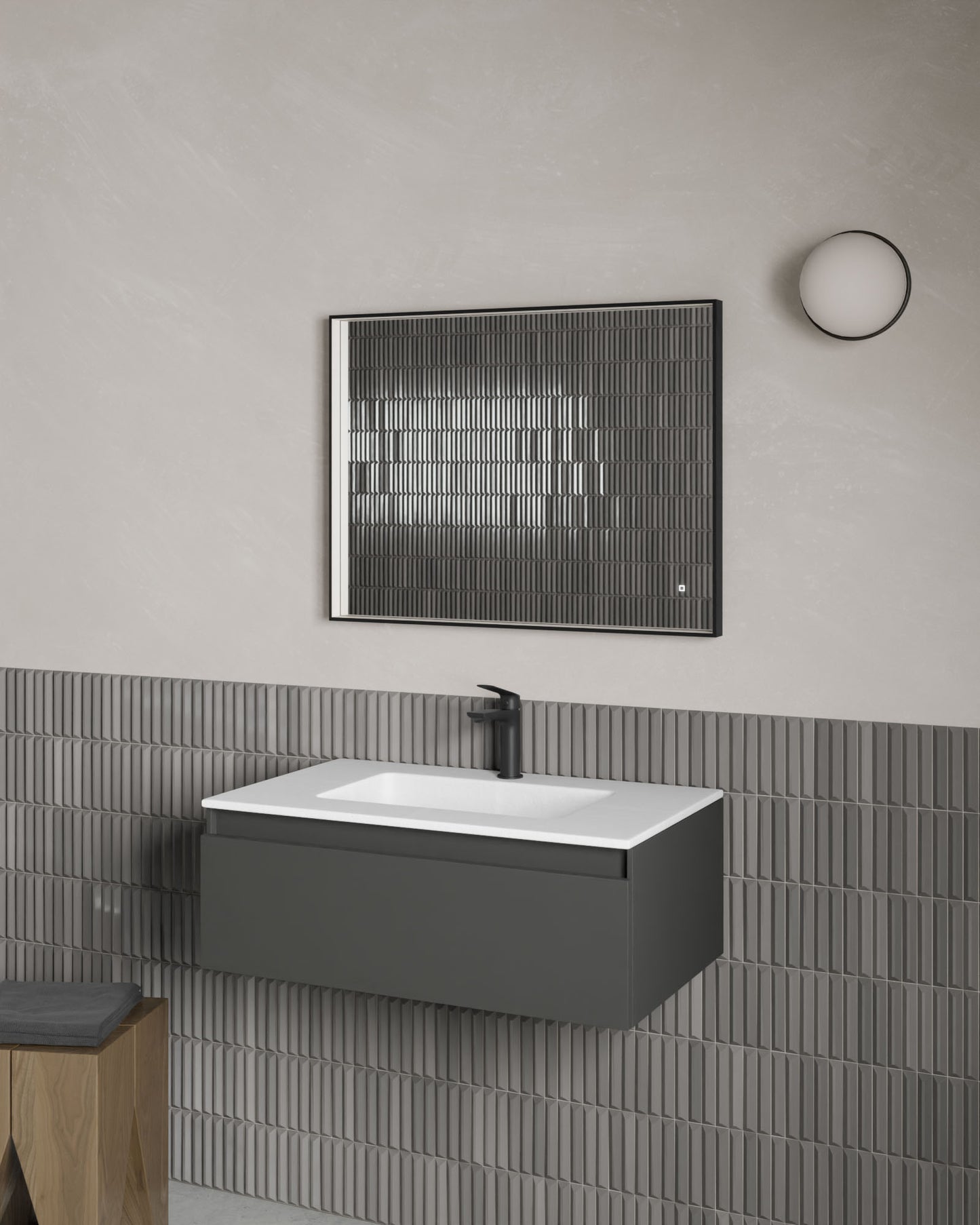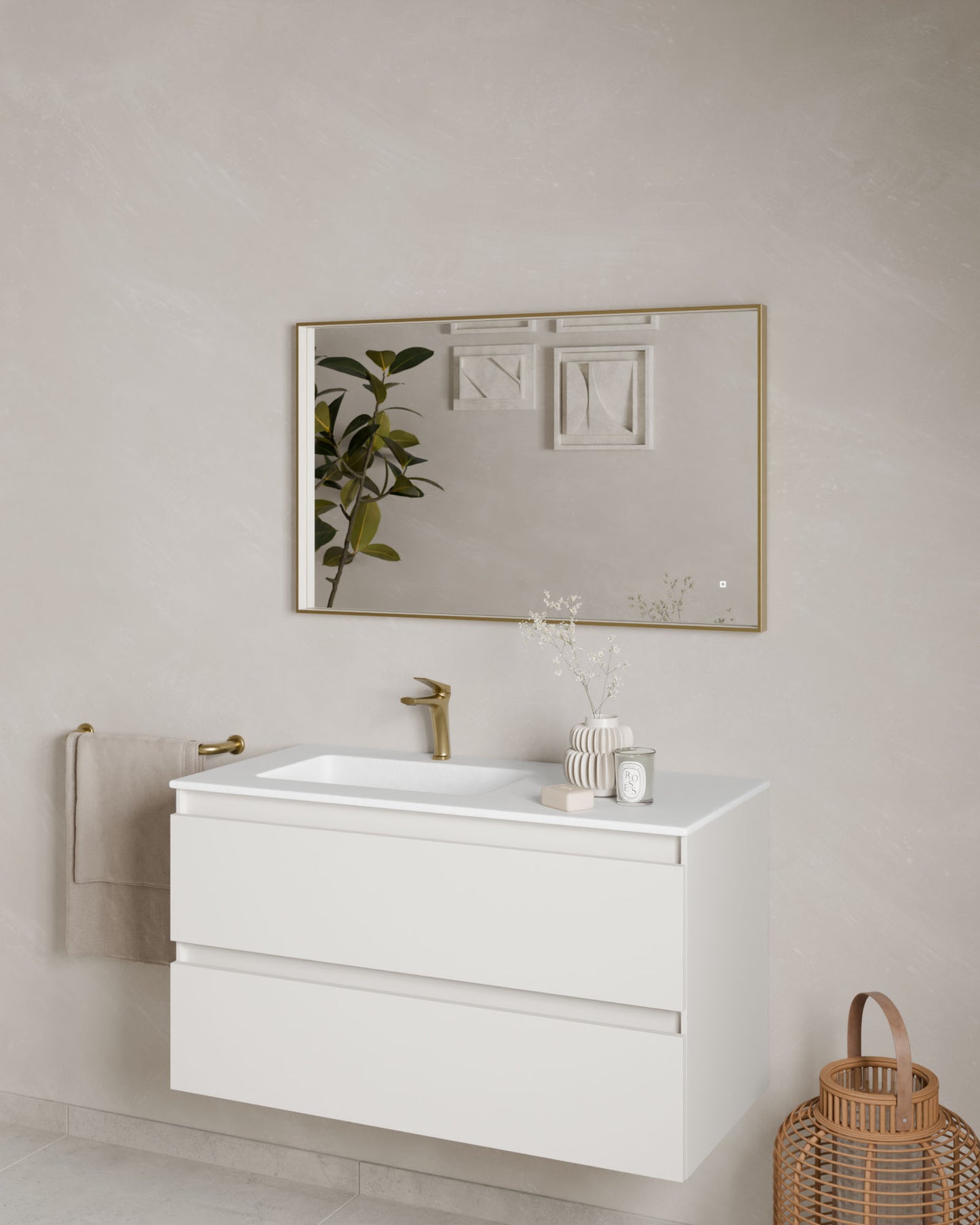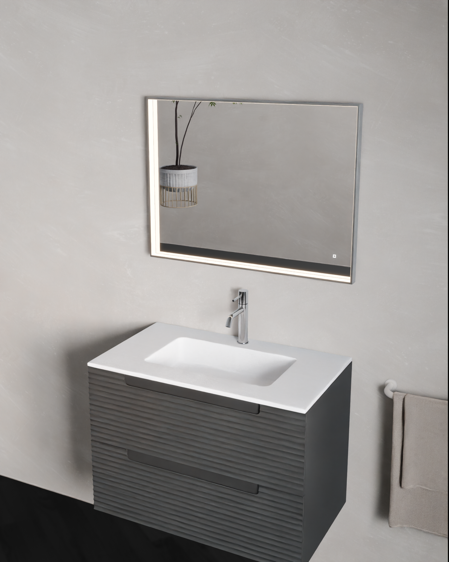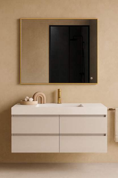 Rechteckiger Spiegel mit breitem Rahmen in Silber, Gold oder Schwarz, der minimalistisches Design mit modernster Technik kombiniert, um dein Bad zum Strahlen zu bringen.