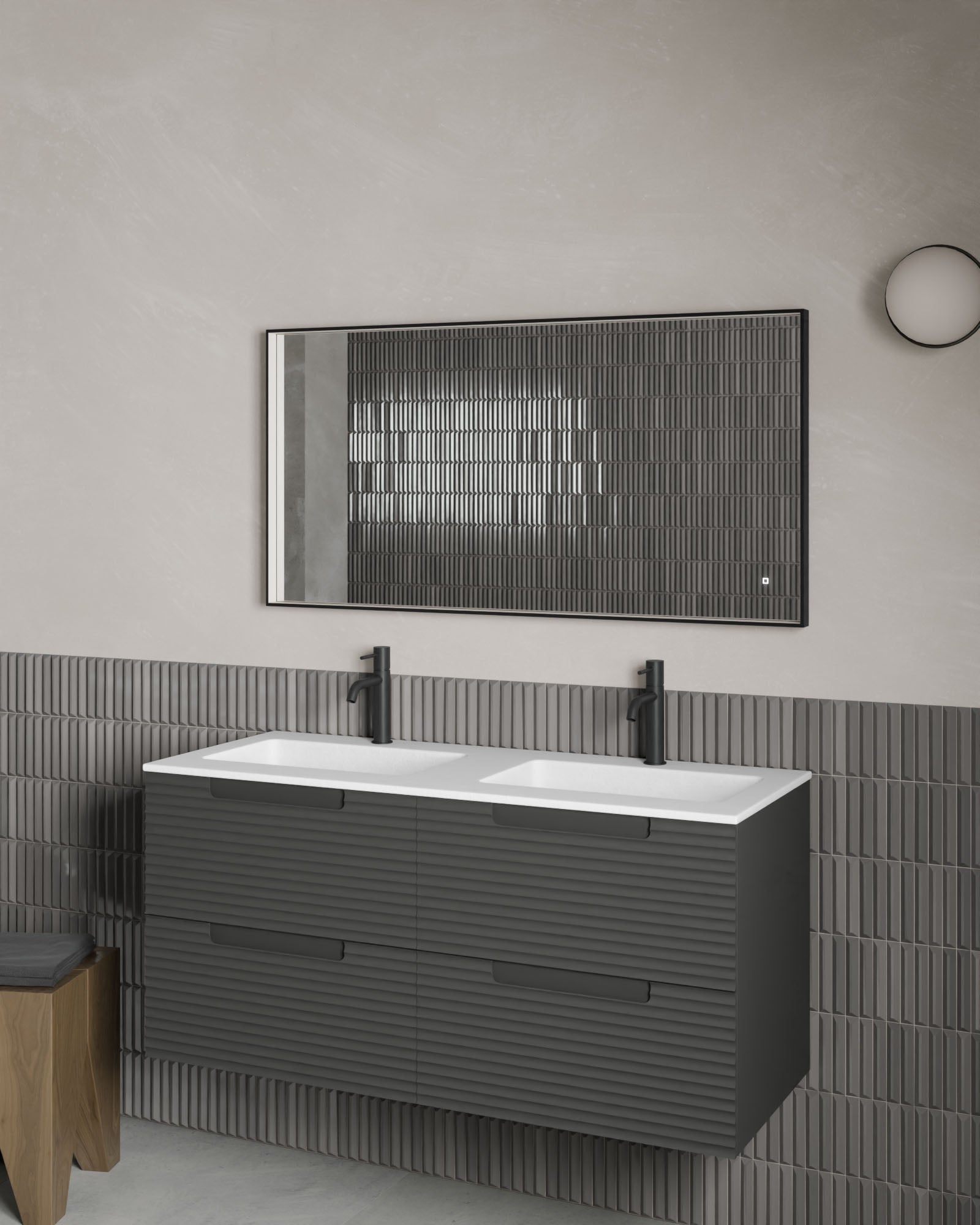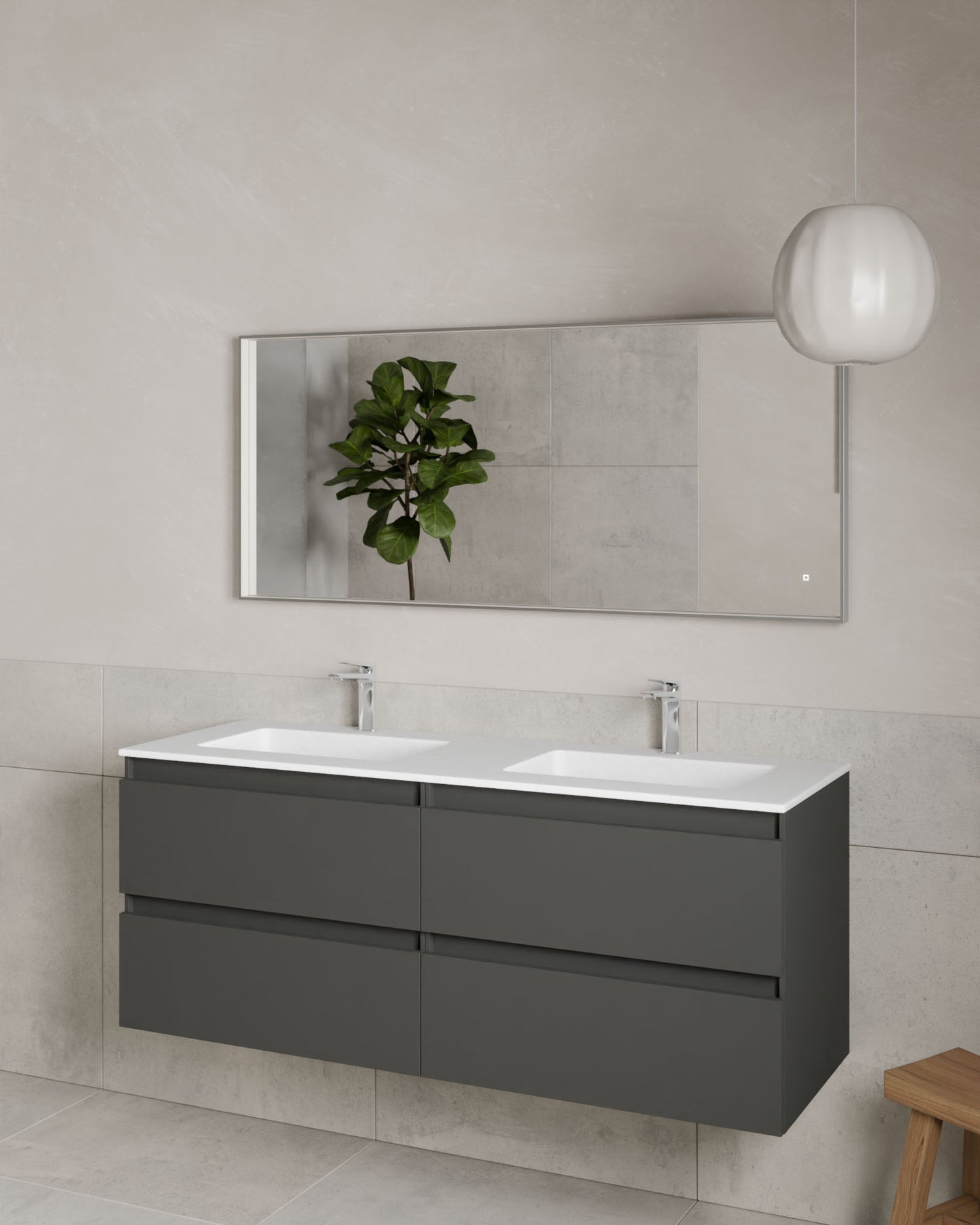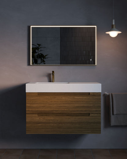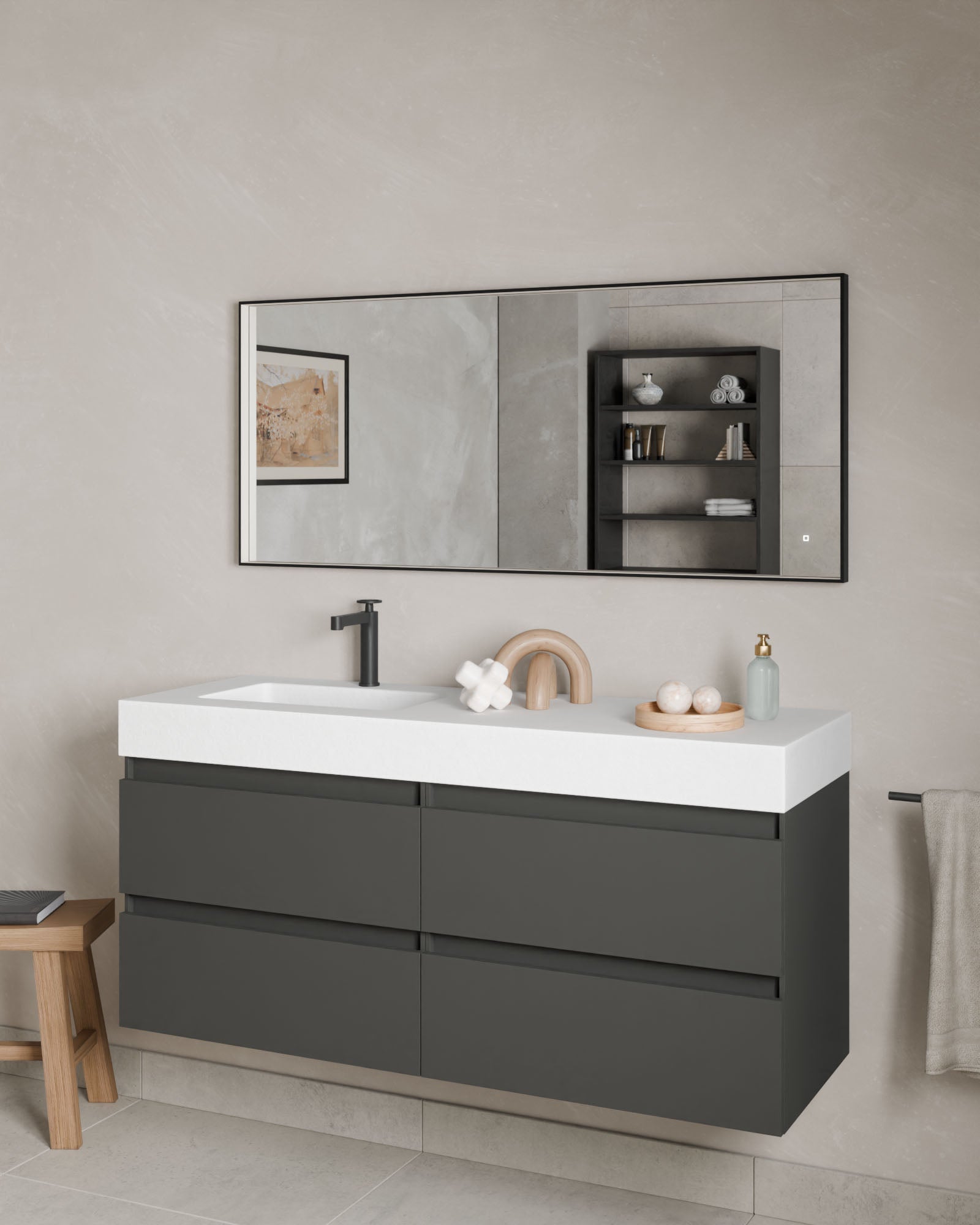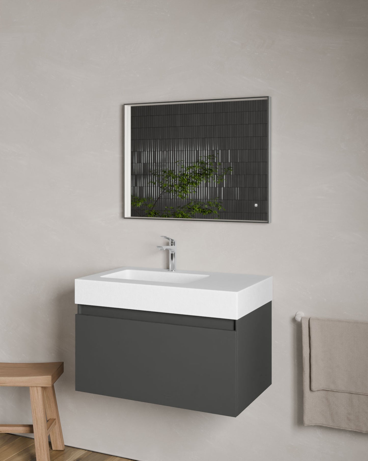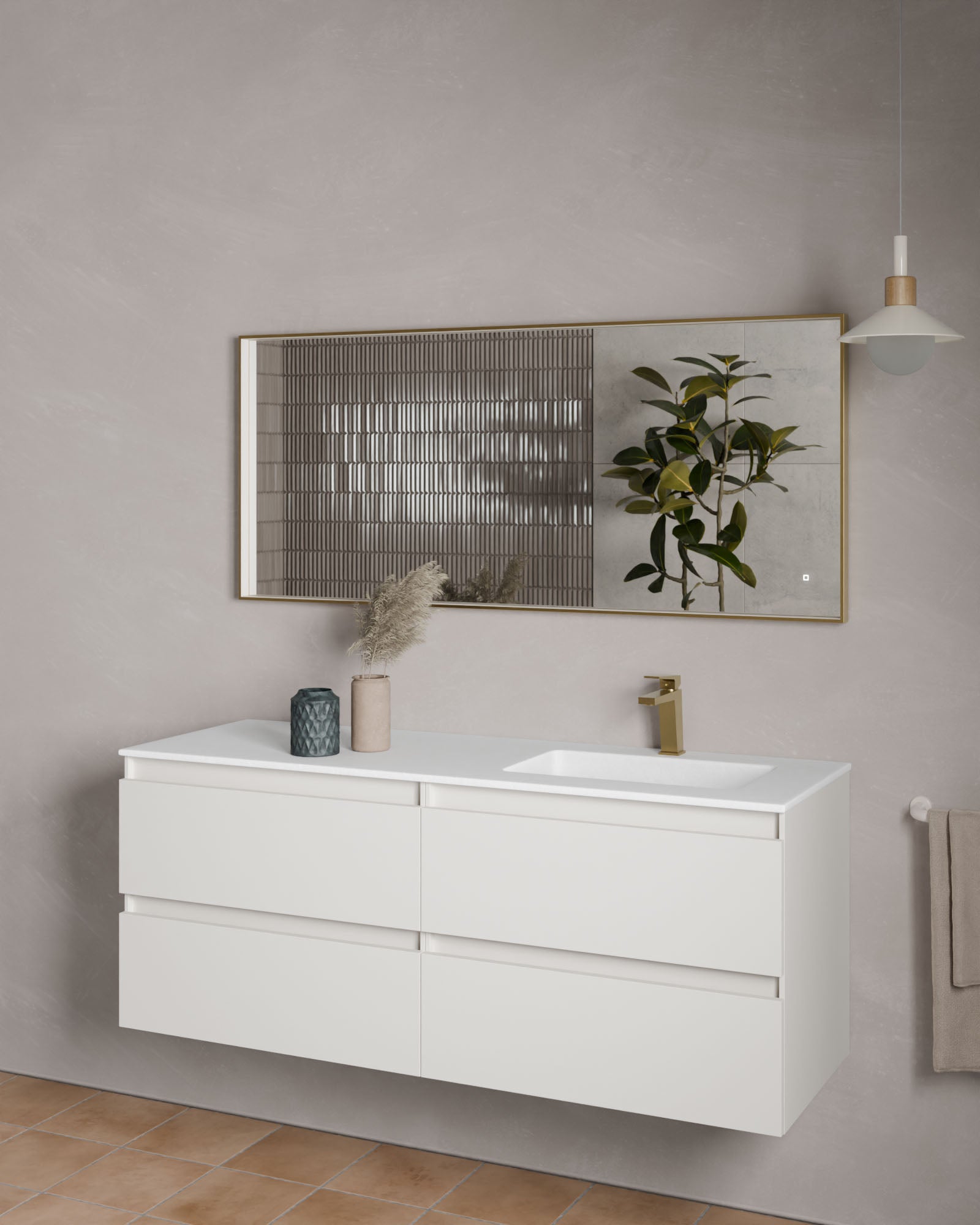Rechteckiger Spiegel mit breitem Rahmen in Silber, Gold oder Schwarz, der minimalistisches Design mit modernster Technik kombiniert, um dein Bad zum Strahlen zu bringen.