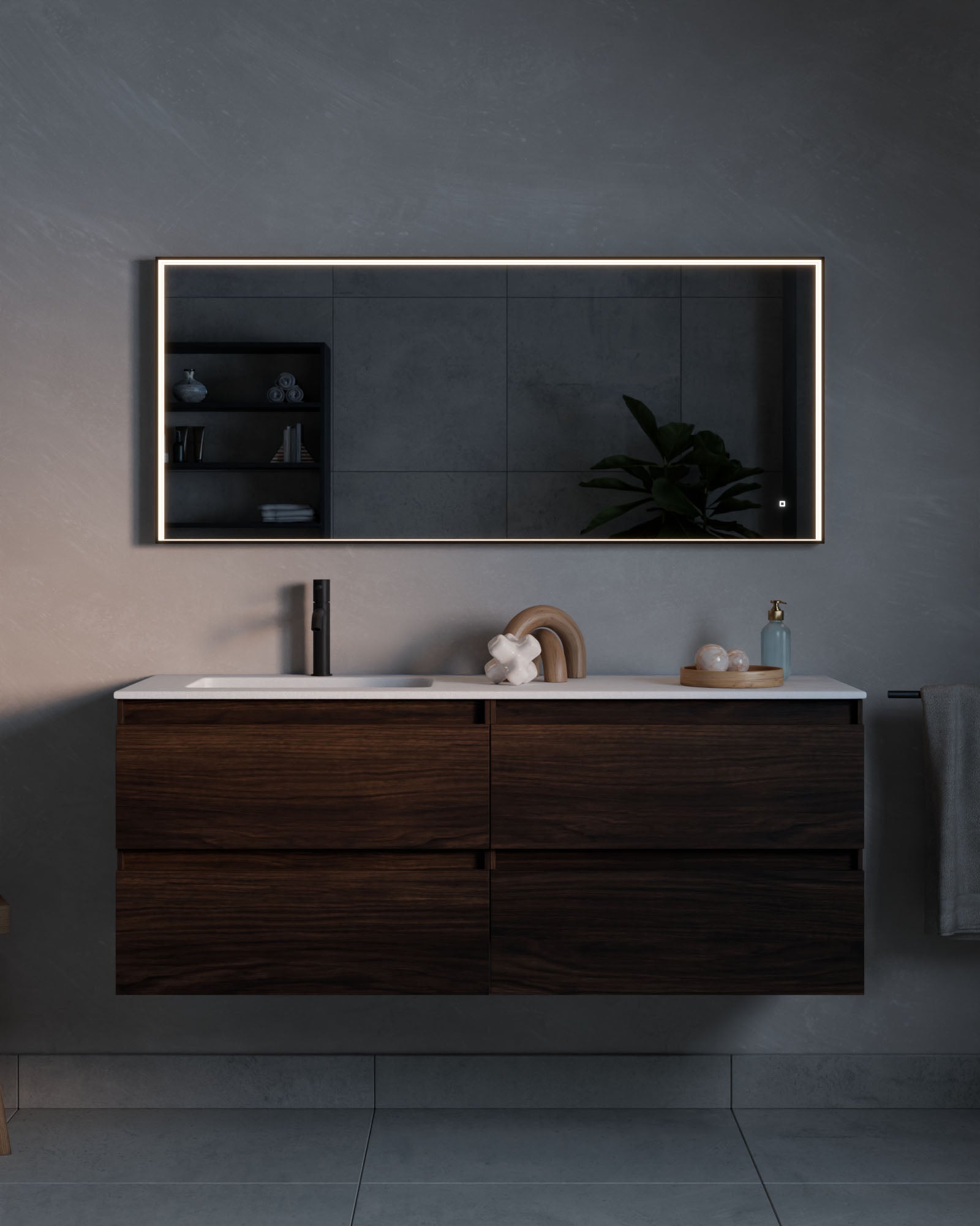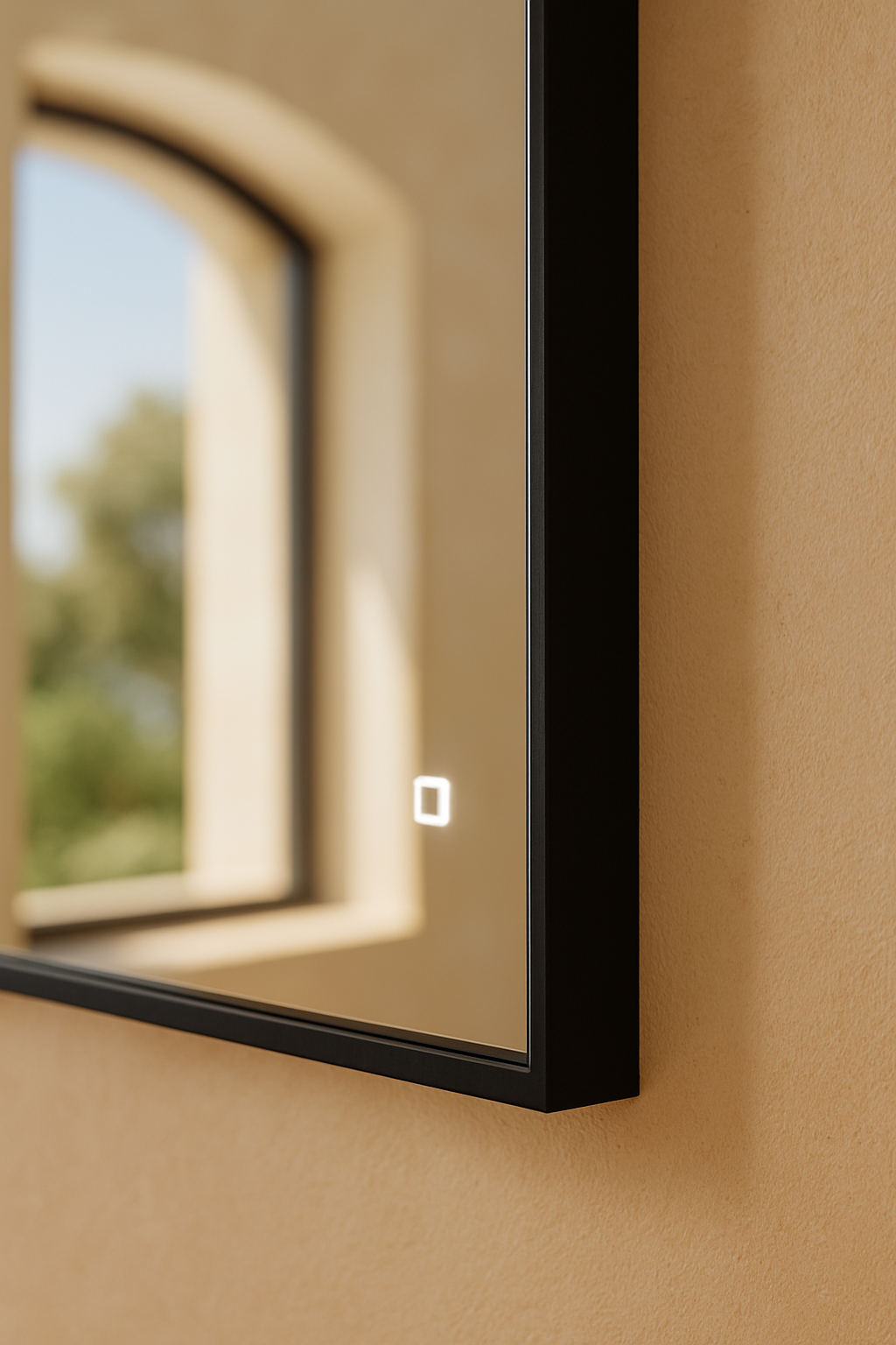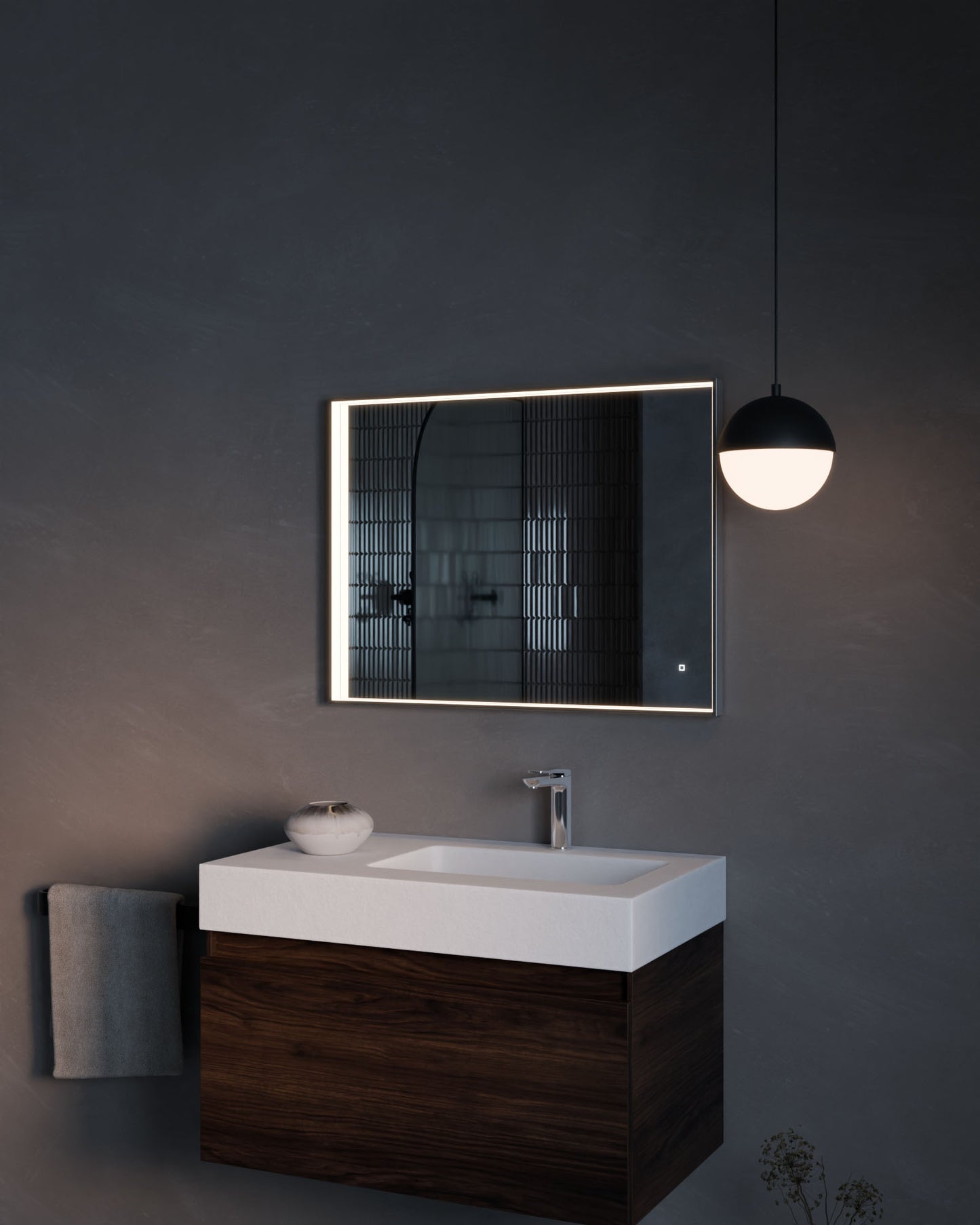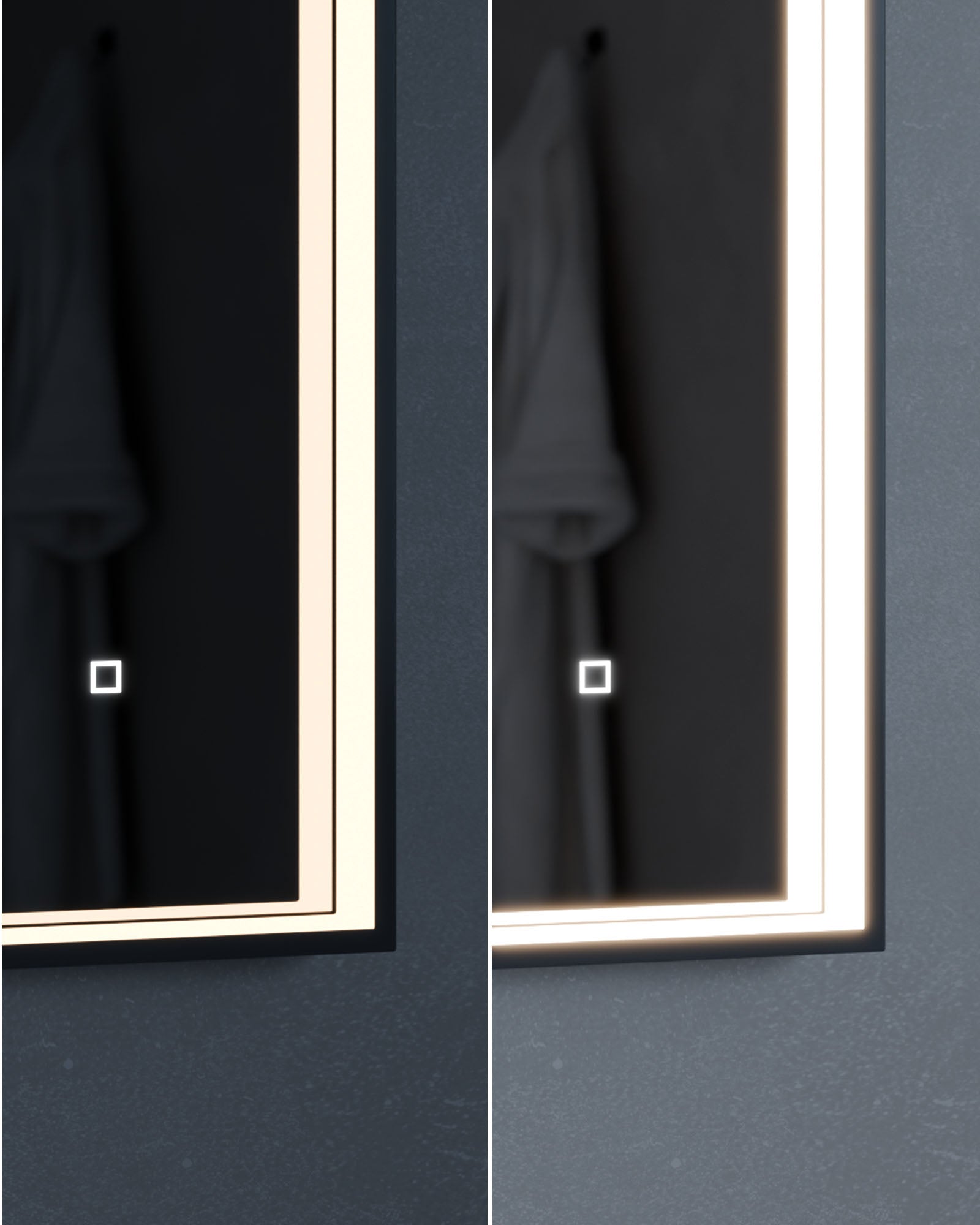 Der breite Rahmen setzt markante, elegante Akzente, während die umlaufende Beleuchtung eine warme und stilvolle Atmosphäre schafft. Doch das wahre Highlight sind seine Funktionen: mit Beleuchtung, Dimmer, Lichtfarbe und Spiegelheizung – alles bequem über eine Touch-Steuerung bedienbar. Ein echtes All-in-One für alle, die Design und Funktionalität in einem Spiegel suchen.