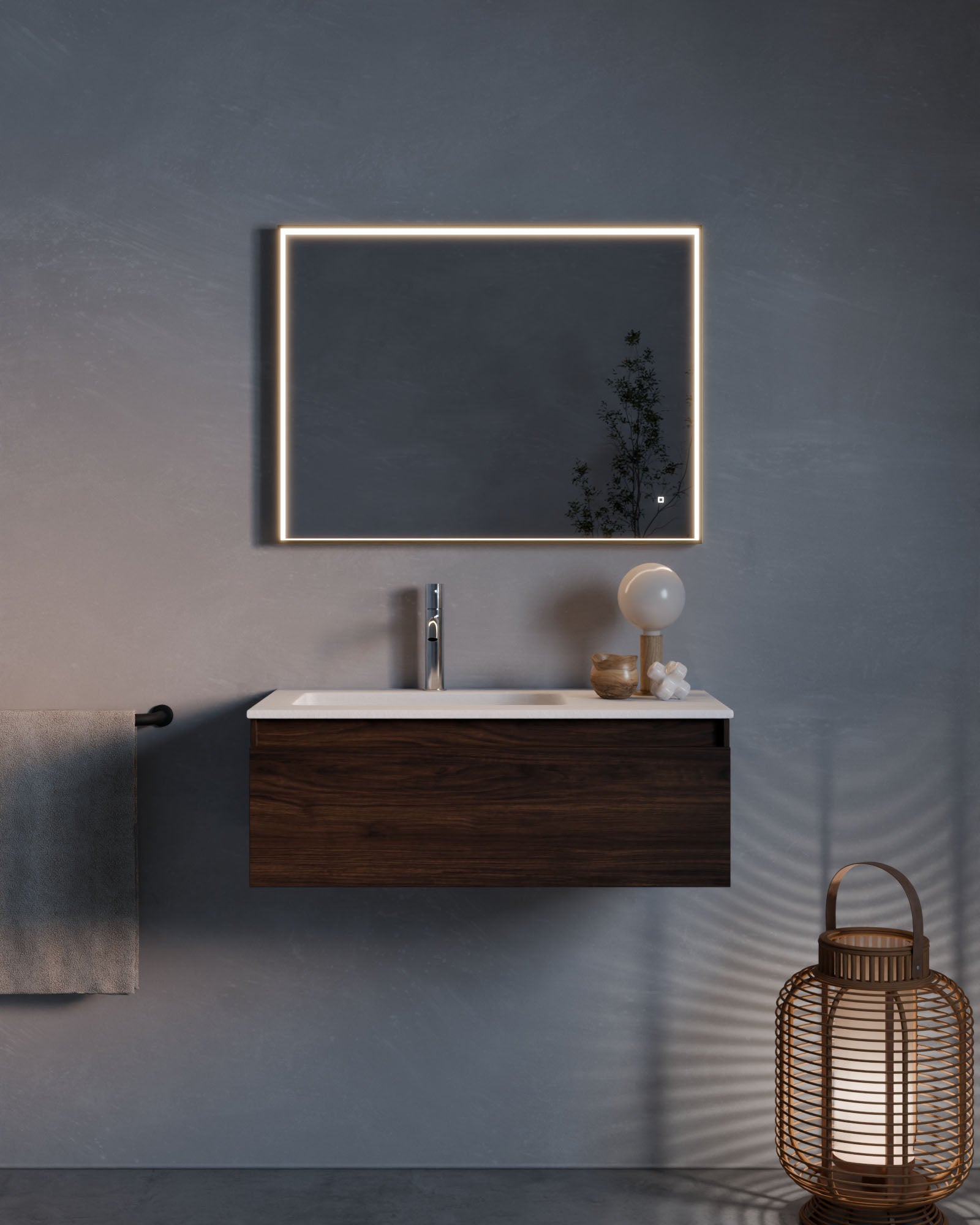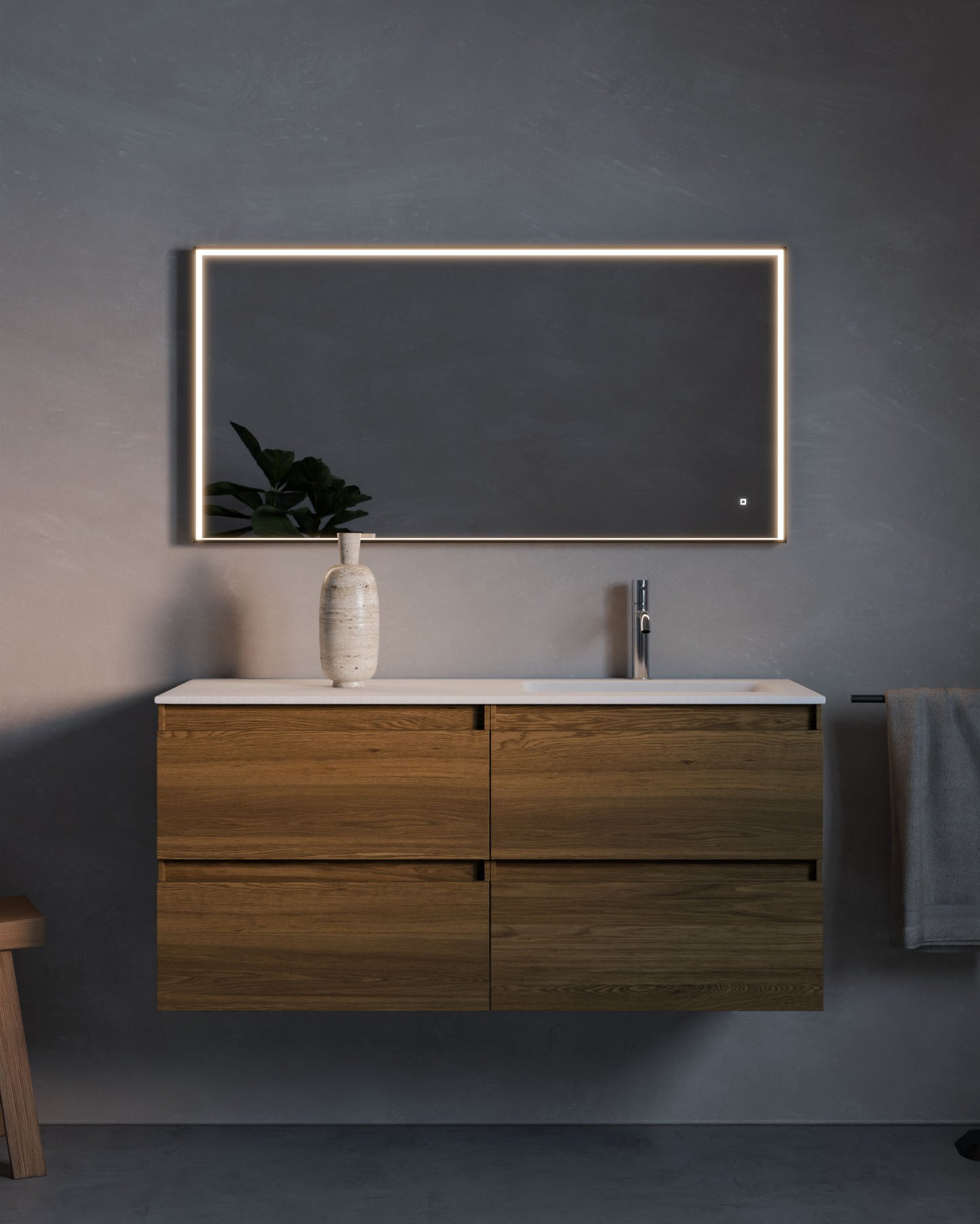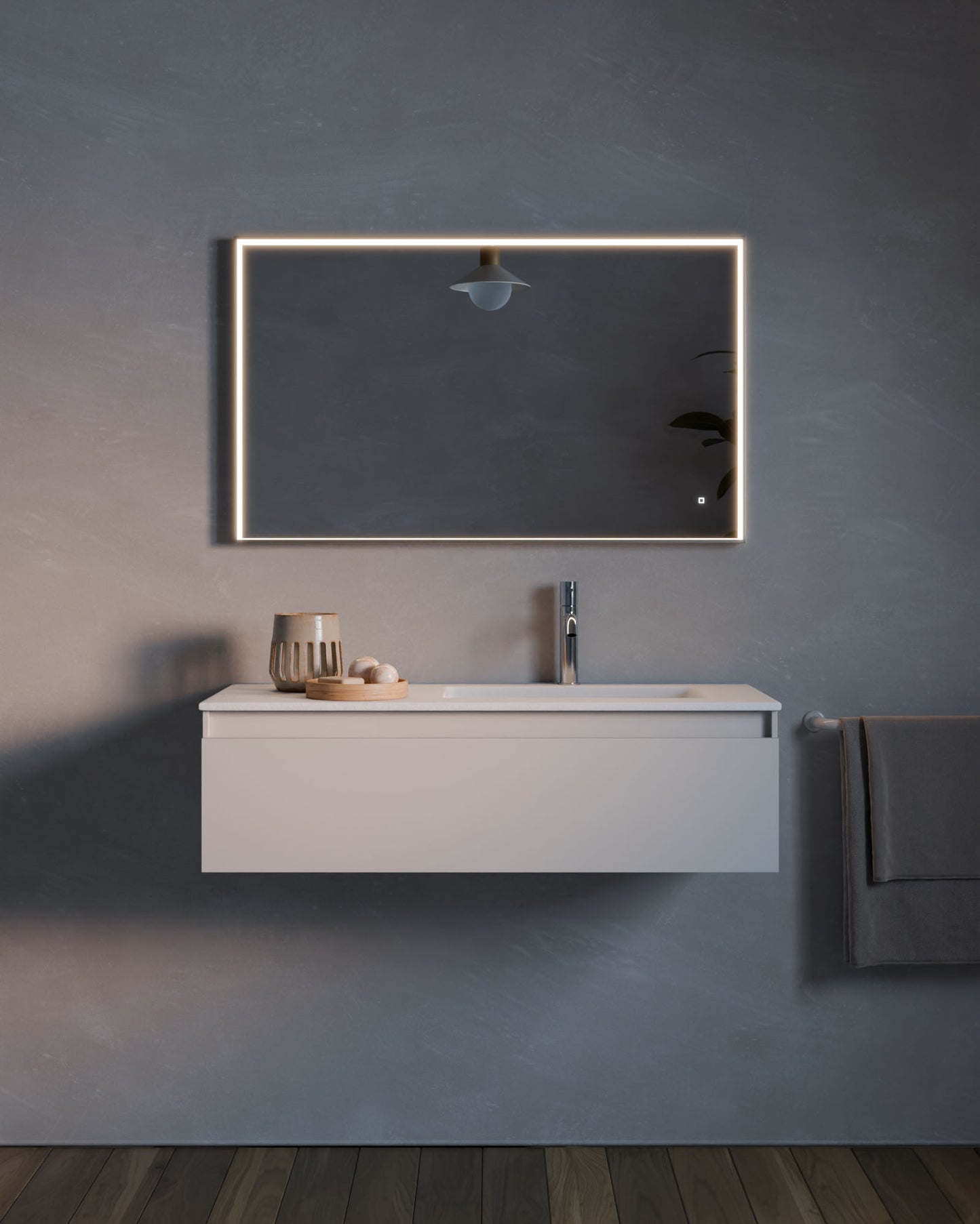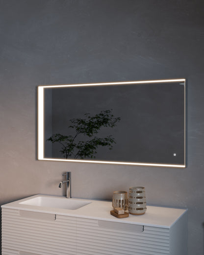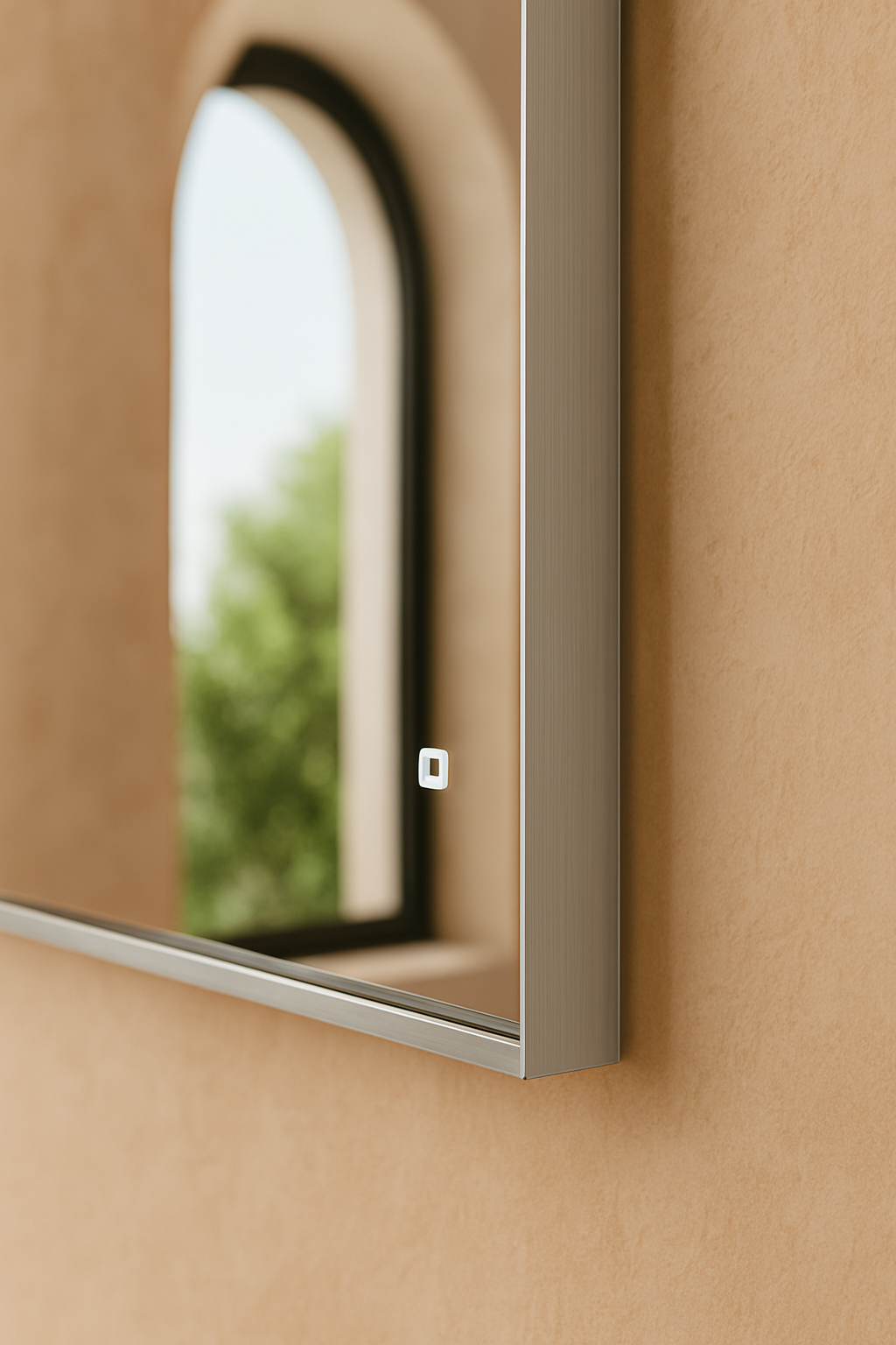 Der breite Rahmen setzt markante, elegante Akzente, während die umlaufende Beleuchtung eine warme und stilvolle Atmosphäre schafft. Doch das wahre Highlight sind seine Funktionen: mit Beleuchtung, Dimmer, Lichtfarbe und Spiegelheizung – alles bequem über eine Touch-Steuerung bedienbar. Ein echtes All-in-One für alle, die Design und Funktionalität in einem Spiegel suchen.